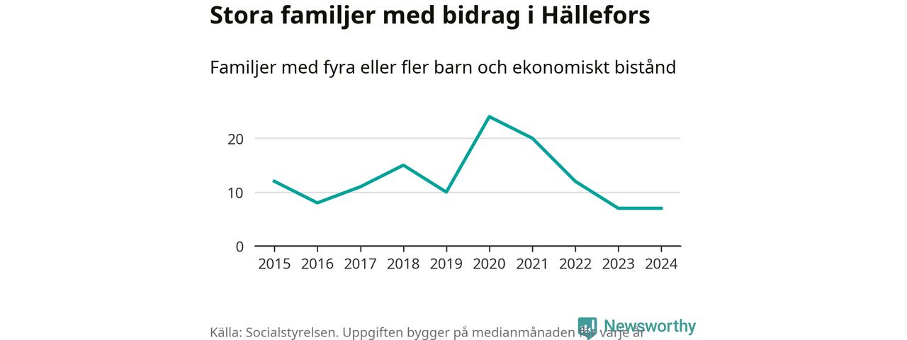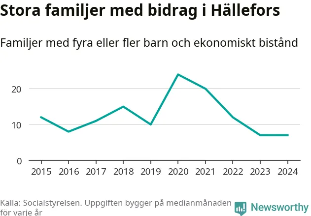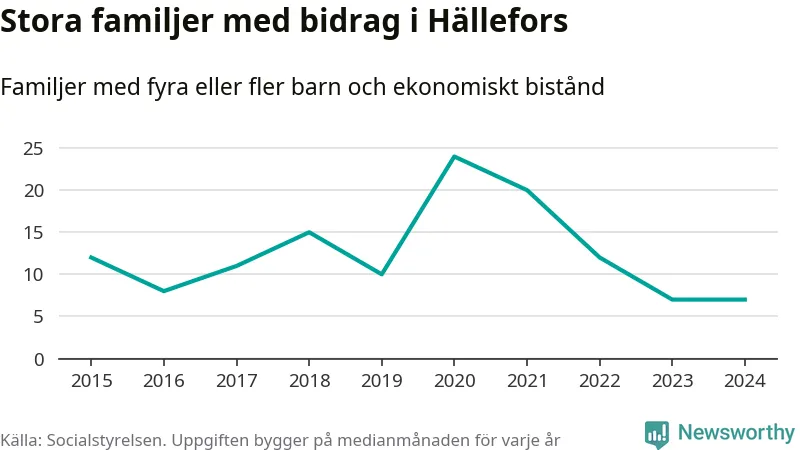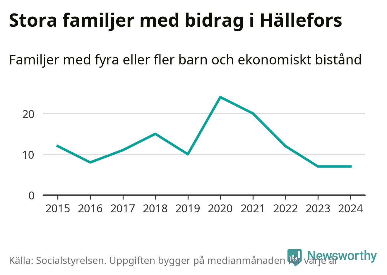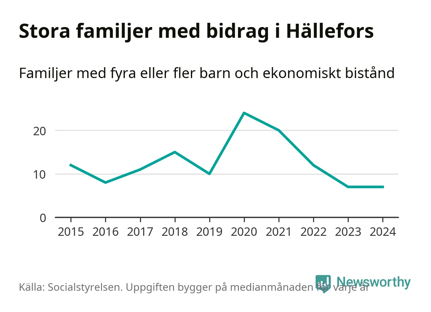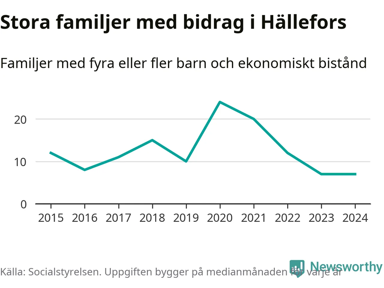I Hällefors kommun fick en högre andel av befolkningen ekonomiskt bistånd än de flesta andra kommuner i landet 2024. Sammanlagt 106 hushåll fick någon gång under året ekonomiskt bistånd, enligt Socialstyrelsens statistik. Av dem var några få barnfamiljer. Vi har inte siffror på hur många unika familjer med fyra barn eller fler det handlar om, men enligt Socialstyrelsens preliminära månadsstatistik betalades ekonomiskt bistånd ut till mellan fem och åtta familjer per månad under fjolåret – i snitt sju familjer.