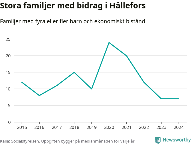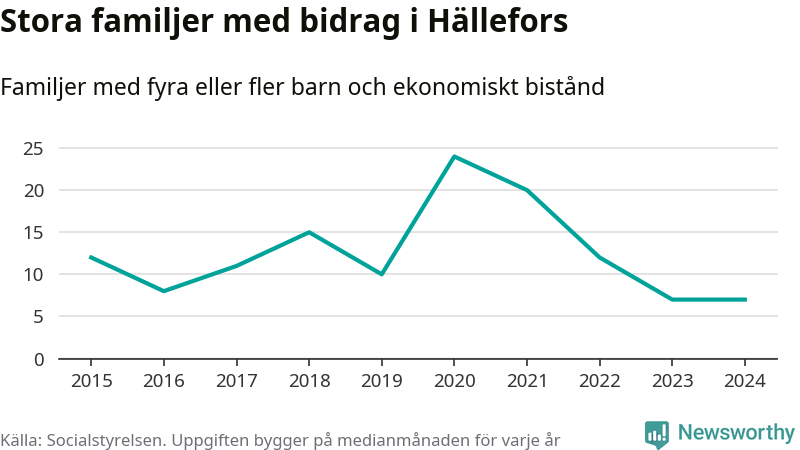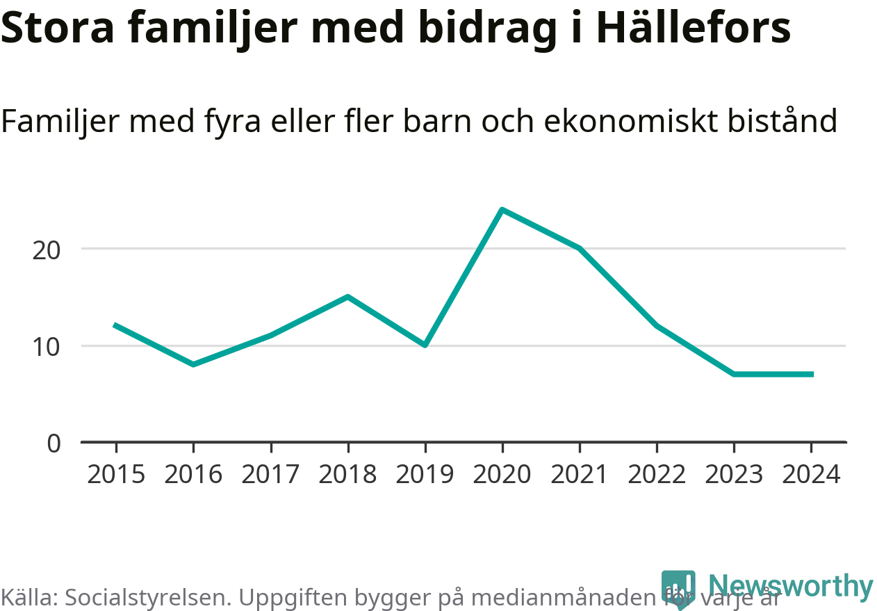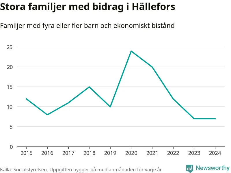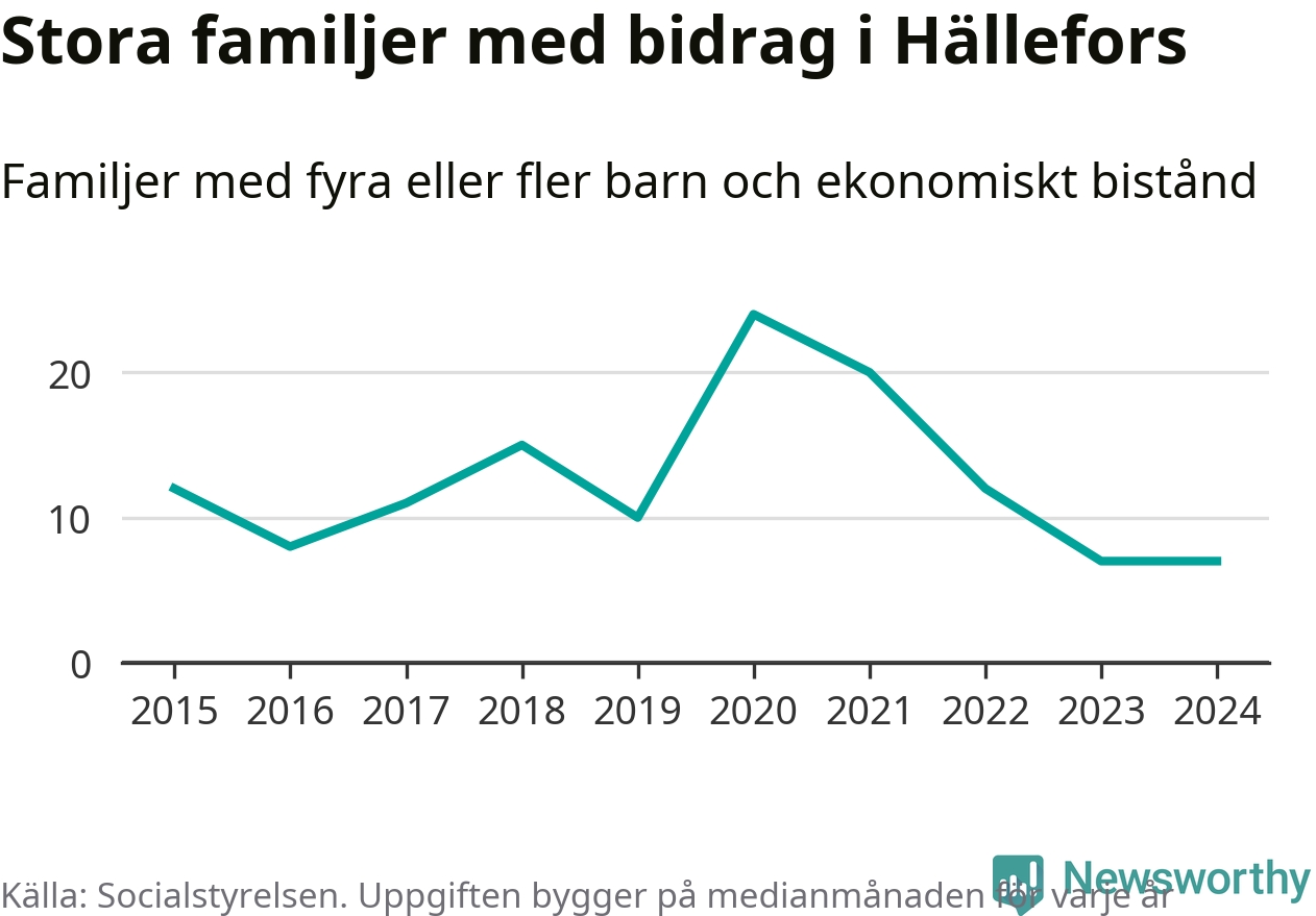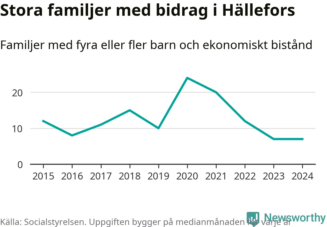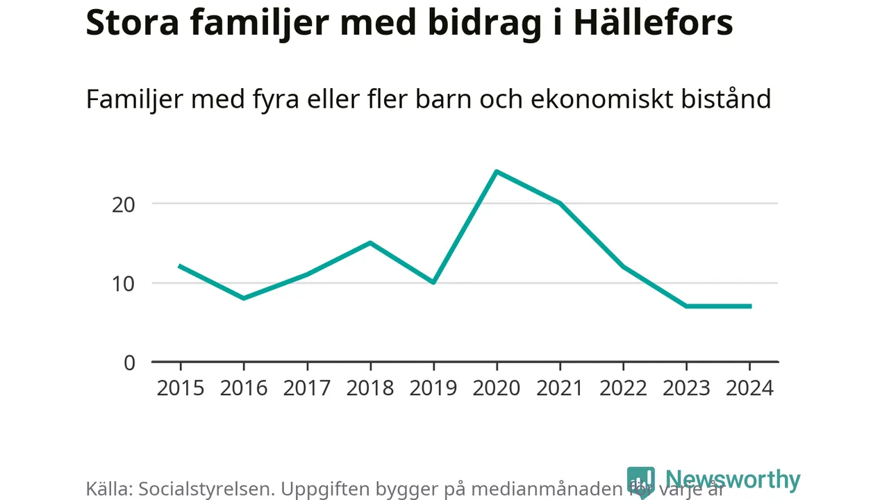 I Hällefors kommun fick en högre andel av befolkningen ekonomiskt bistånd än de flesta andra kommuner i landet 2024. Sammanlagt 106 hushåll fick någon gång under året ekonomiskt bistånd, enligt Socialstyrelsens statistik. Av dem var några få barnfamiljer. Vi har inte siffror på hur många unika familjer med fyra barn eller fler det handlar om, men enligt Socialstyrelsens preliminära månadsstatistik betalades ekonomiskt bistånd ut till mellan fem och åtta familjer per månad under fjolåret – i snitt sju familjer.