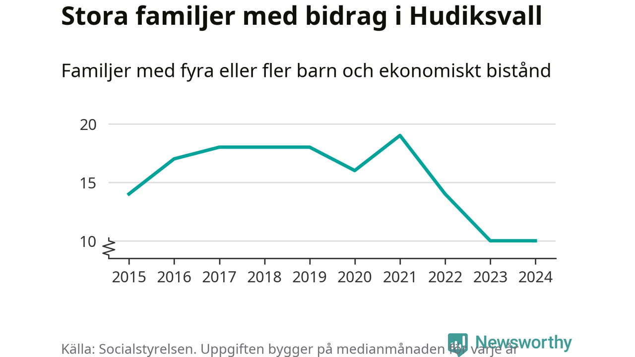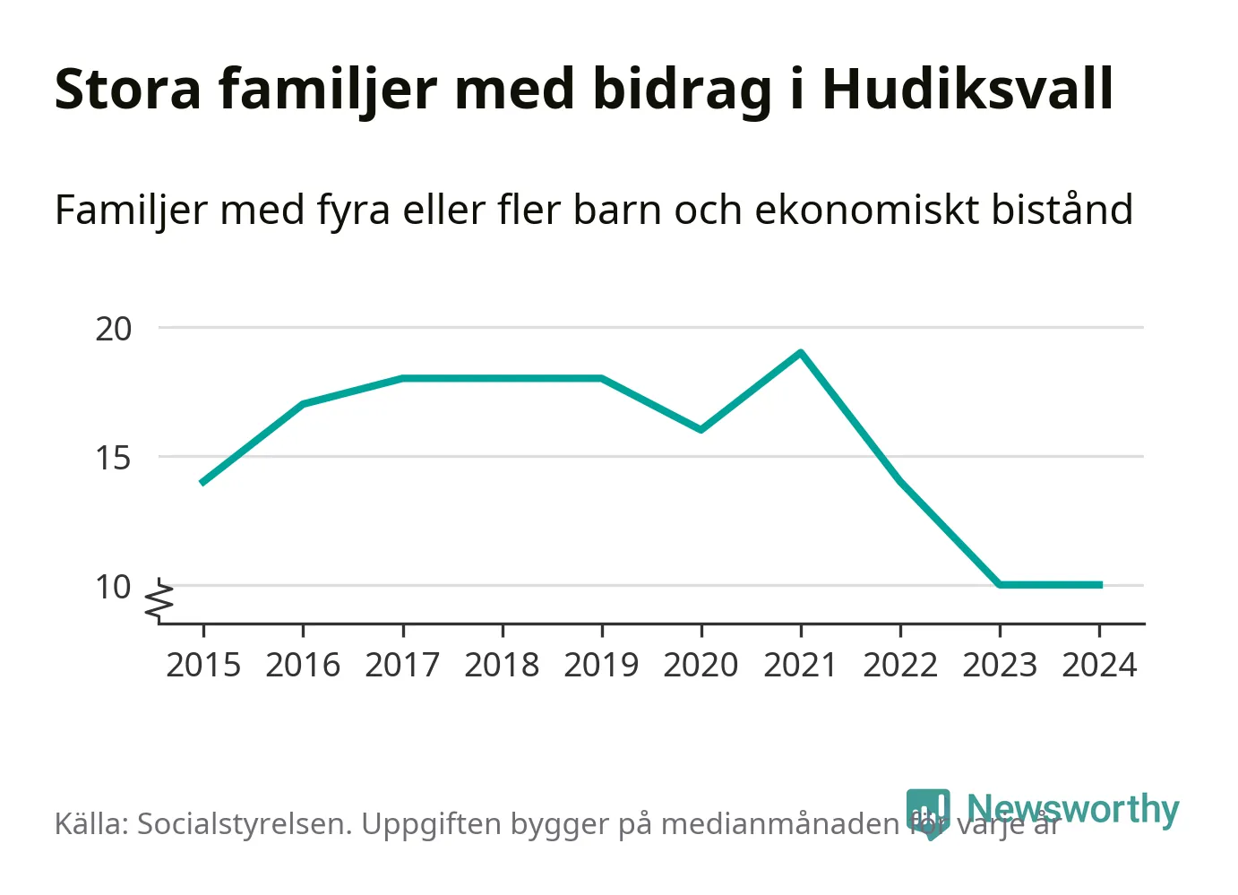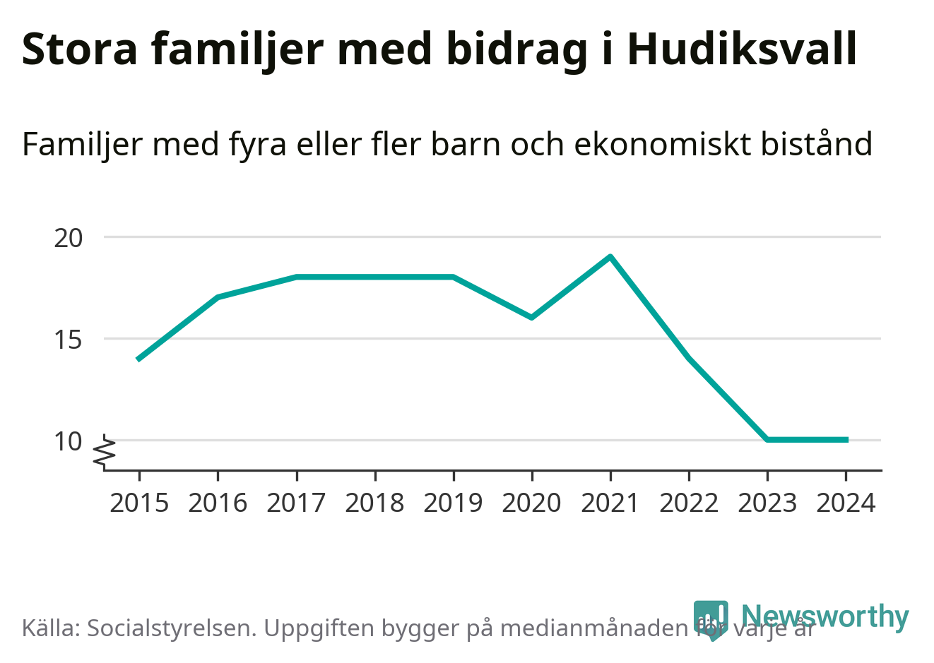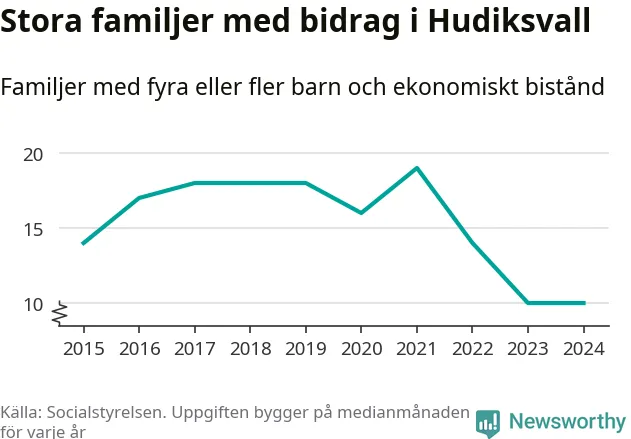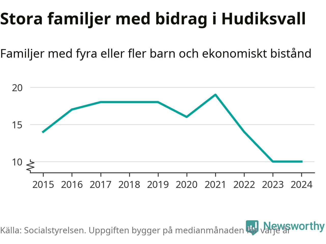 I Hudiksvalls kommun fick en högre andel av befolkningen ekonomiskt bistånd än de flesta andra kommuner i landet 2024. Sammanlagt 696 hushåll fick någon gång under året ekonomiskt bistånd, enligt Socialstyrelsens statistik. Av dem var 207 barnfamiljer. Vi har inte siffror på hur många unika familjer med fyra barn eller fler det handlar om, men enligt Socialstyrelsens preliminära månadsstatistik betalades ekonomiskt bistånd ut till mellan sju och 13 familjer per månad under fjolåret – i snitt tio familjer.