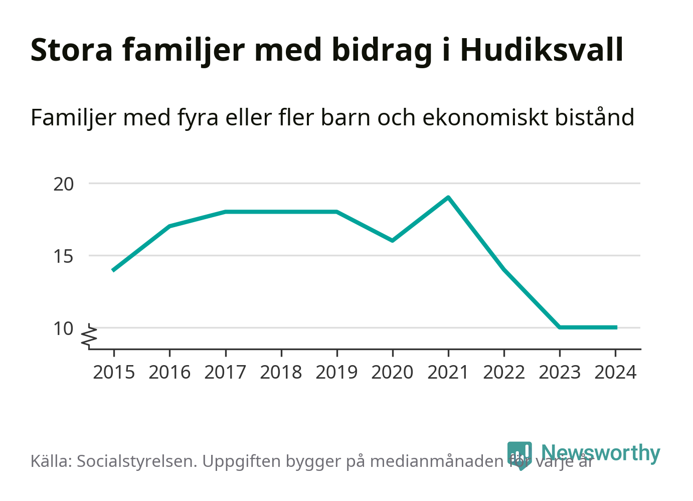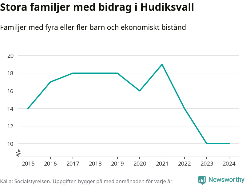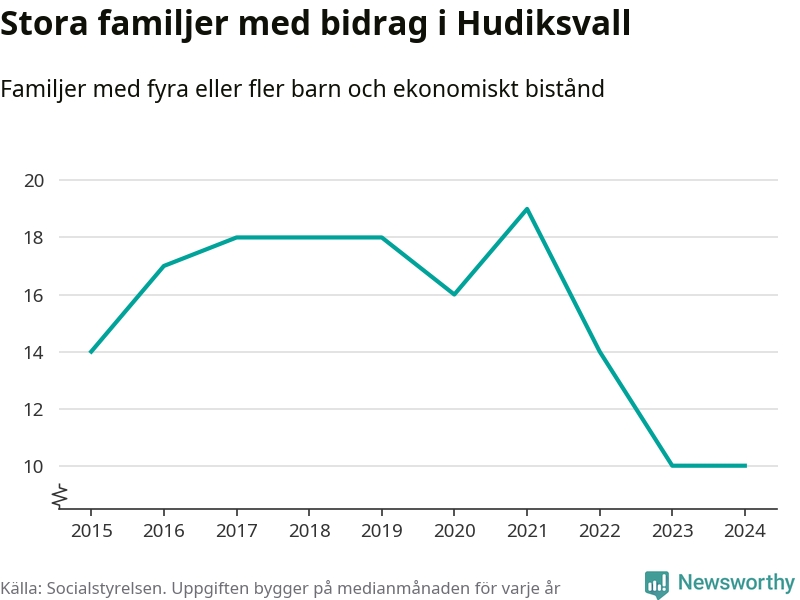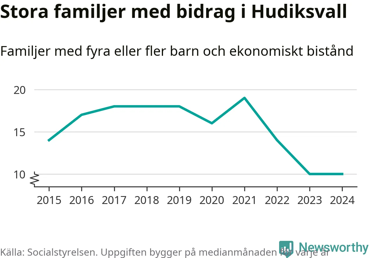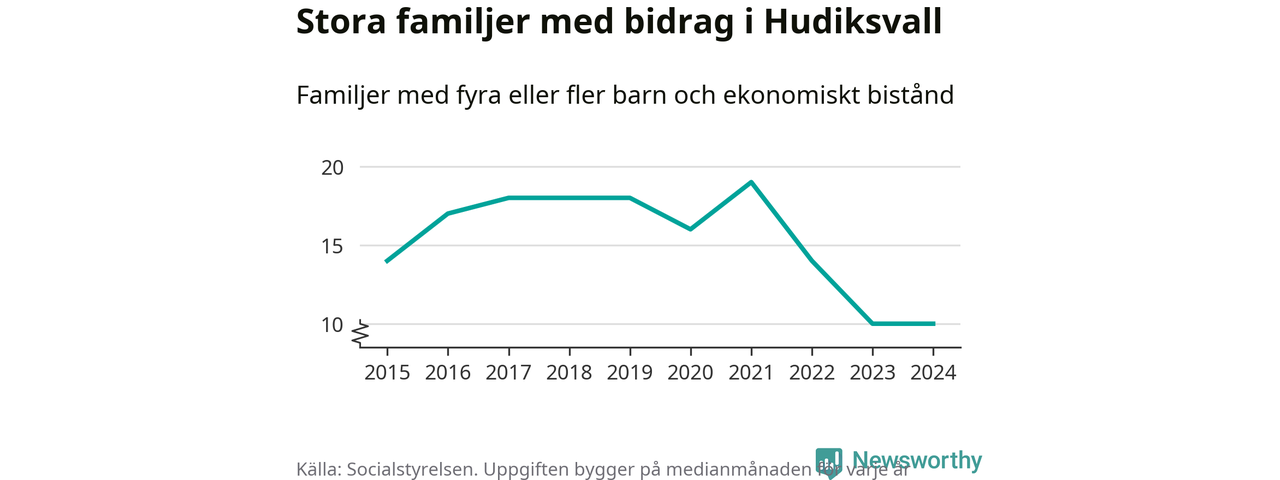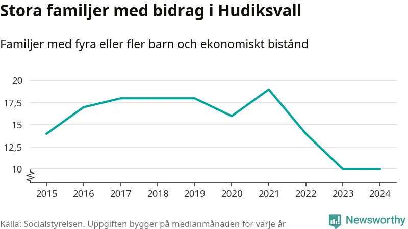 I Hudiksvalls kommun fick en högre andel av befolkningen ekonomiskt bistånd än de flesta andra kommuner i landet 2024. Sammanlagt 696 hushåll fick någon gång under året ekonomiskt bistånd, enligt Socialstyrelsens statistik. Av dem var 207 barnfamiljer. Vi har inte siffror på hur många unika familjer med fyra barn eller fler det handlar om, men enligt Socialstyrelsens preliminära månadsstatistik betalades ekonomiskt bistånd ut till mellan sju och 13 familjer per månad under fjolåret – i snitt tio familjer.