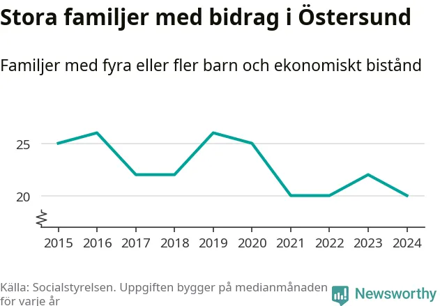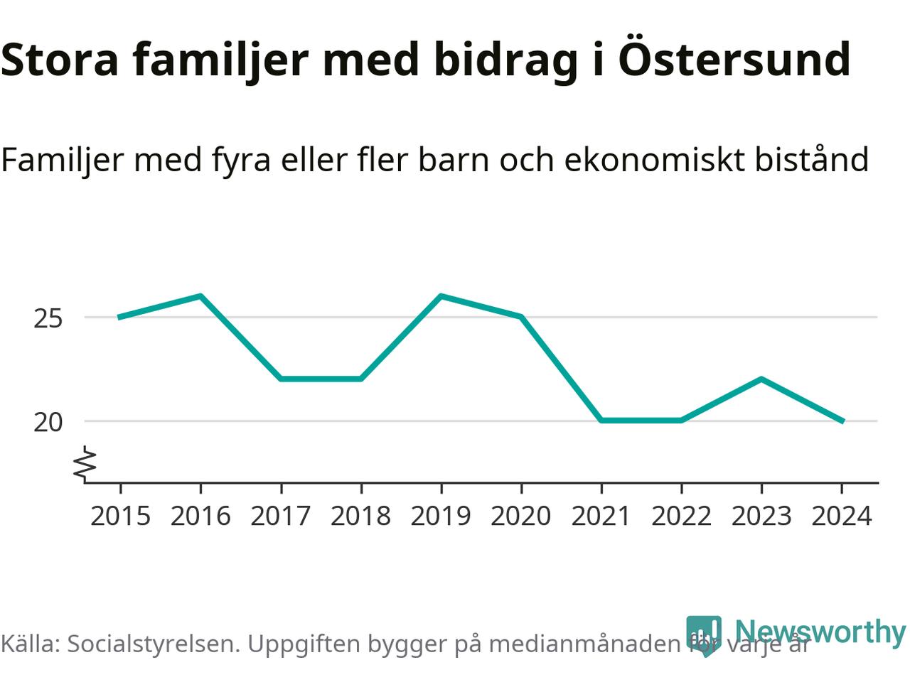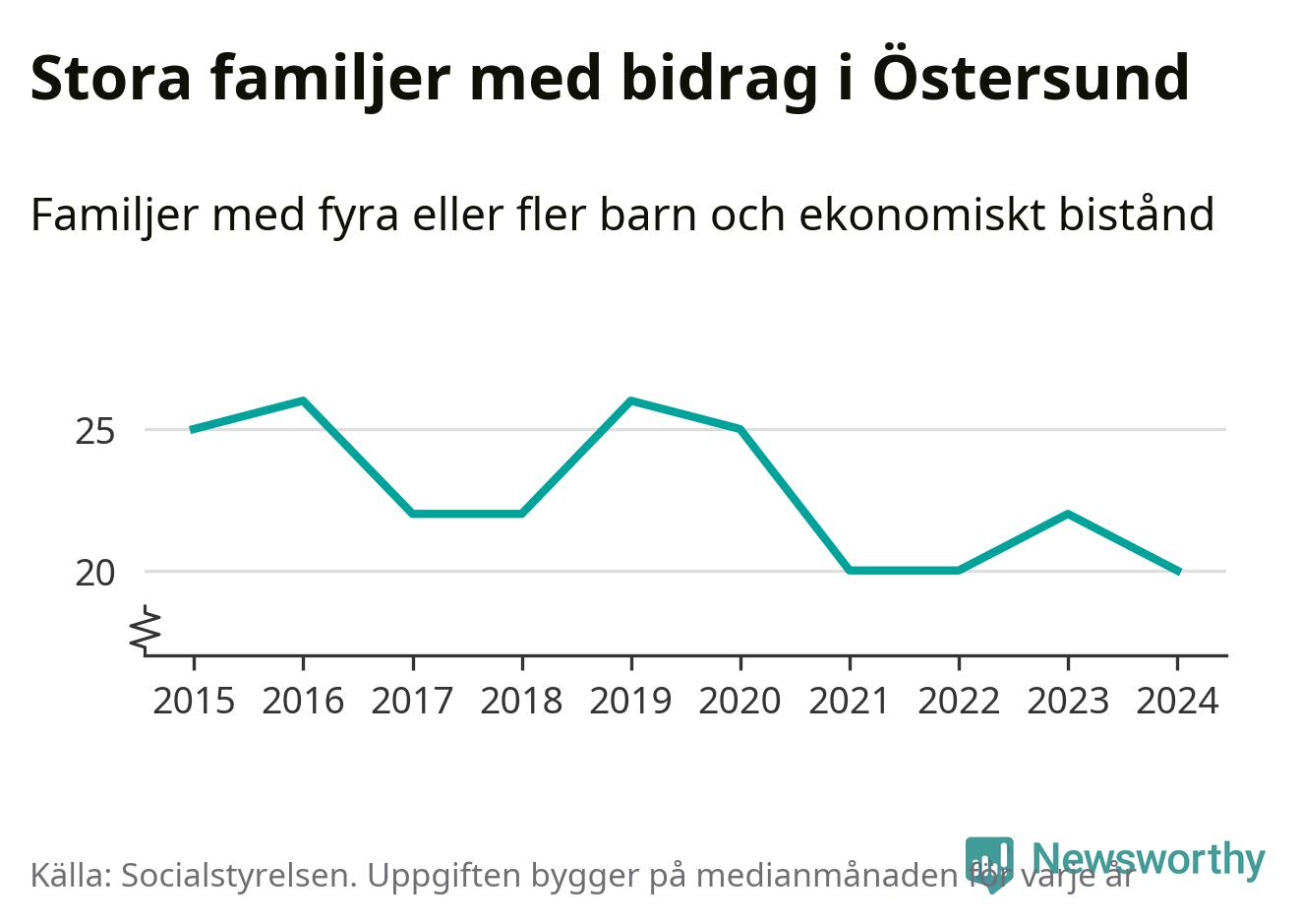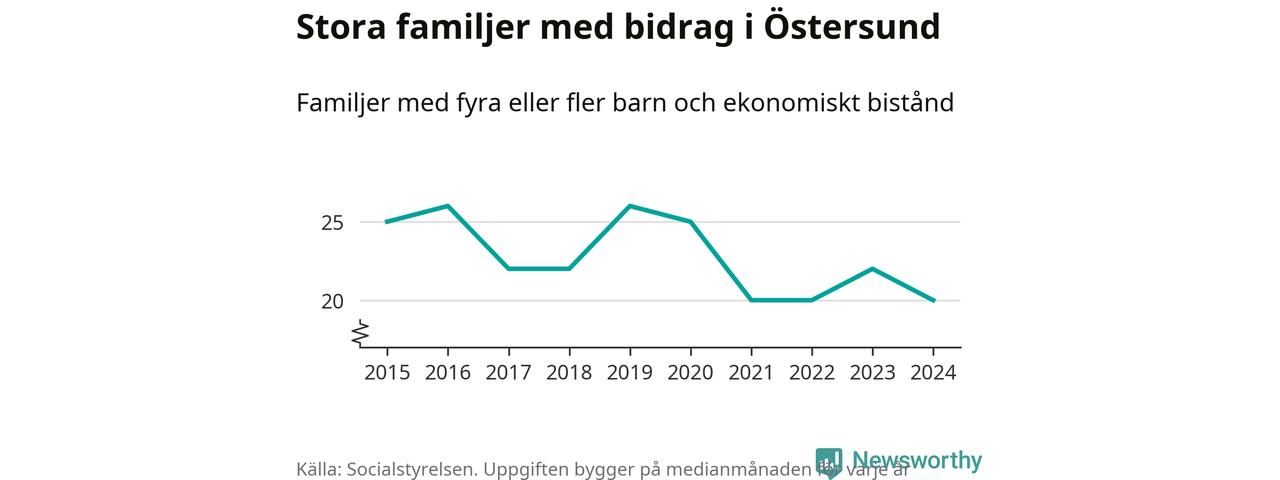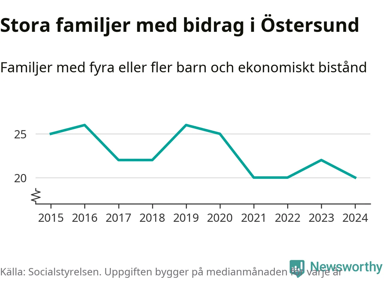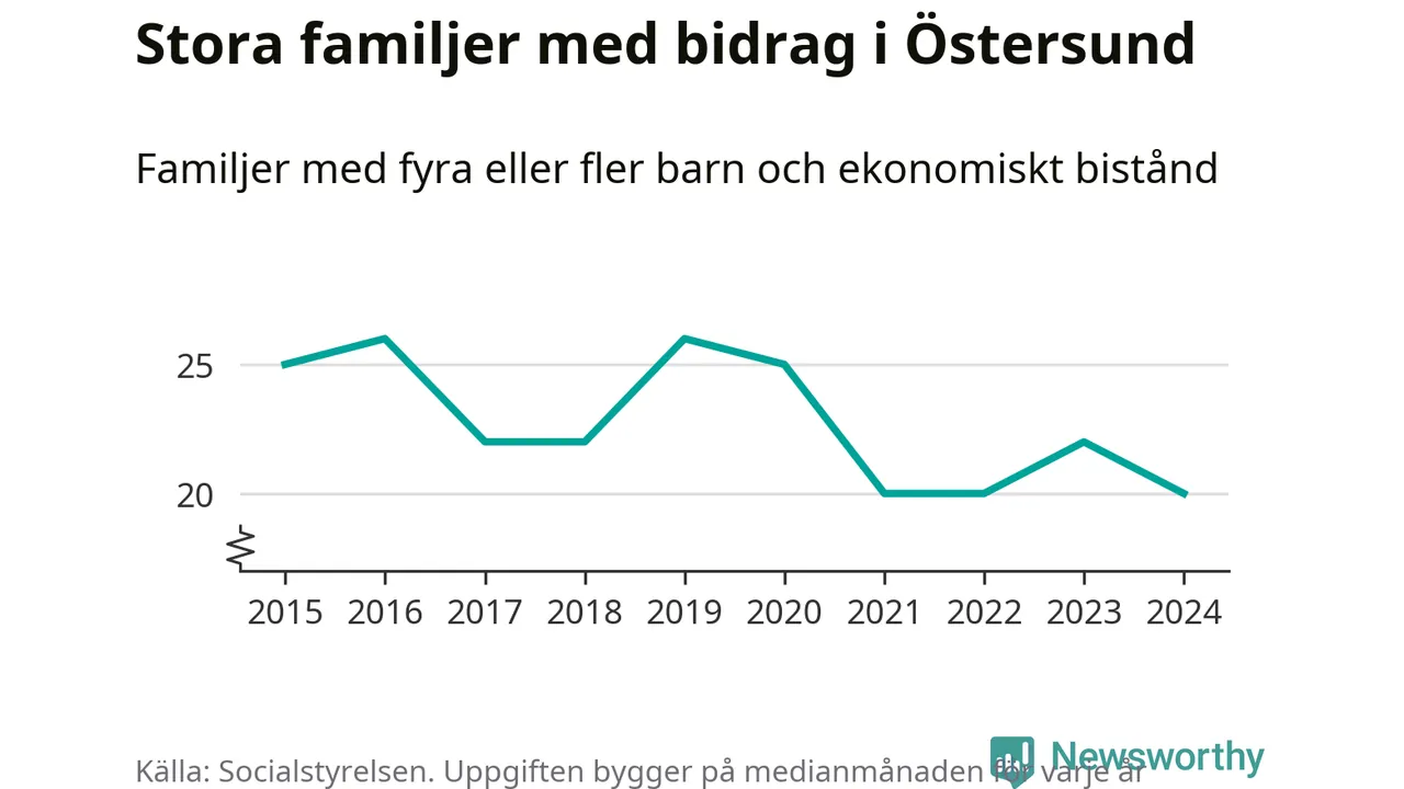Östersunds kommun tillhör varken de kommuner där högst eller lägst andel av befolkningen som fick ekonomiskt bistånd i landet 2024. Sammanlagt 1 018 hushåll fick någon gång under året ekonomiskt bistånd, enligt Socialstyrelsens statistik. Av dem var 281 barnfamiljer. Vi har inte siffror på hur många unika familjer med fyra barn eller fler det handlar om, men enligt Socialstyrelsens preliminära månadsstatistik betalades ekonomiskt bistånd ut till mellan 17 och 28 familjer per månad under fjolåret – i snitt 20 familjer.