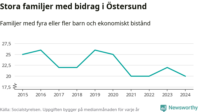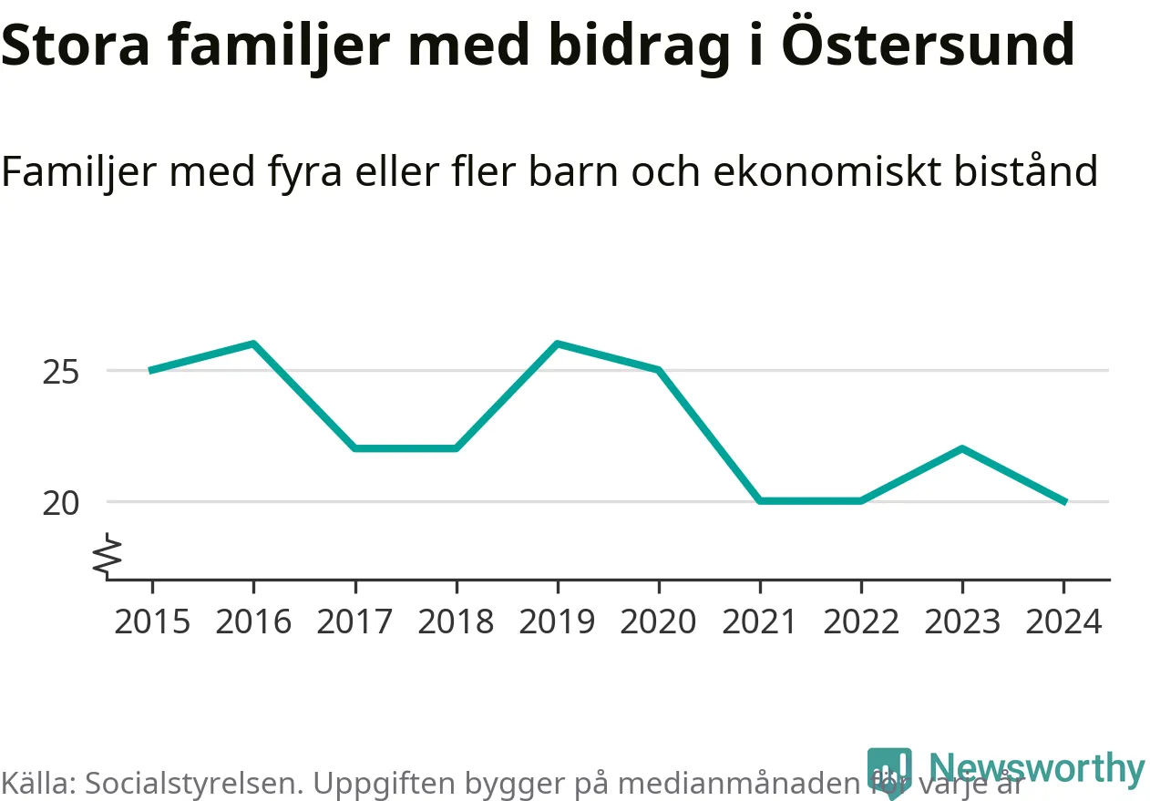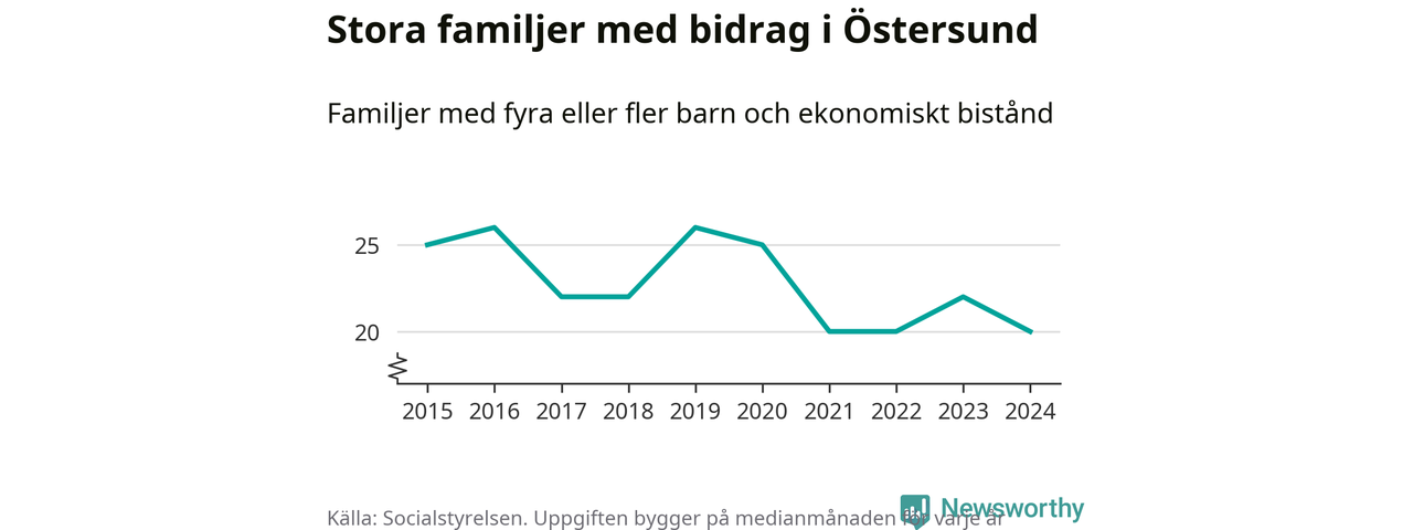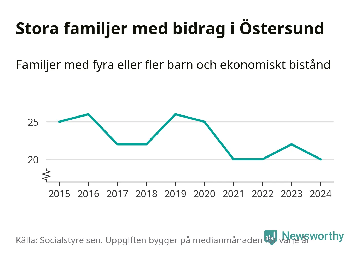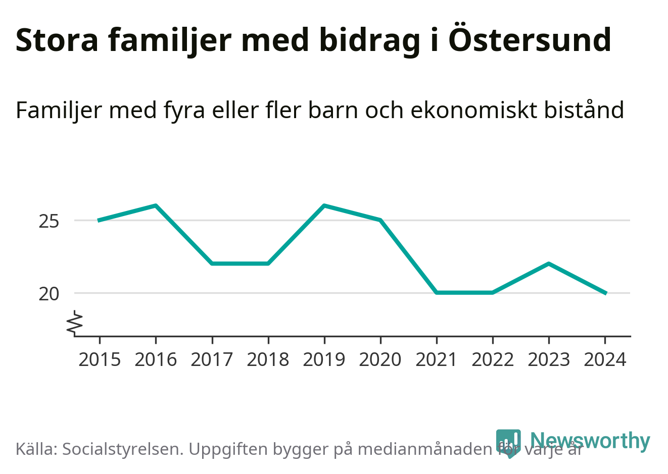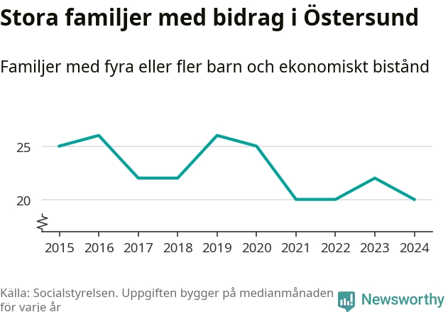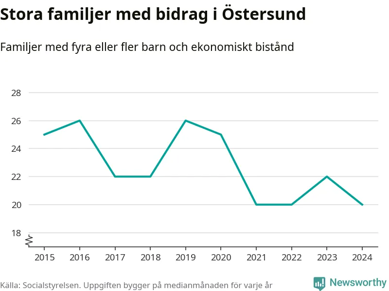 Östersunds kommun tillhör varken de kommuner där högst eller lägst andel av befolkningen som fick ekonomiskt bistånd i landet 2024. Sammanlagt 1 018 hushåll fick någon gång under året ekonomiskt bistånd, enligt Socialstyrelsens statistik. Av dem var 281 barnfamiljer. Vi har inte siffror på hur många unika familjer med fyra barn eller fler det handlar om, men enligt Socialstyrelsens preliminära månadsstatistik betalades ekonomiskt bistånd ut till mellan 17 och 28 familjer per månad under fjolåret – i snitt 20 familjer.