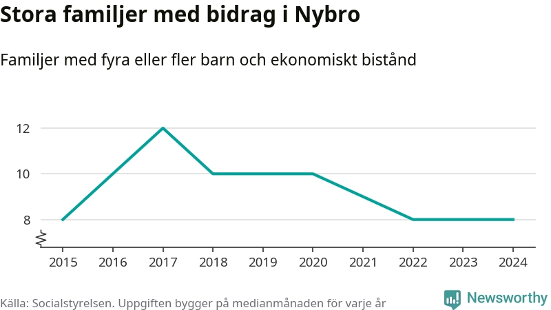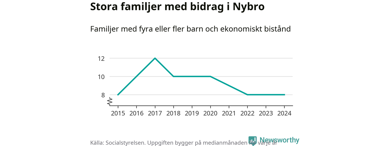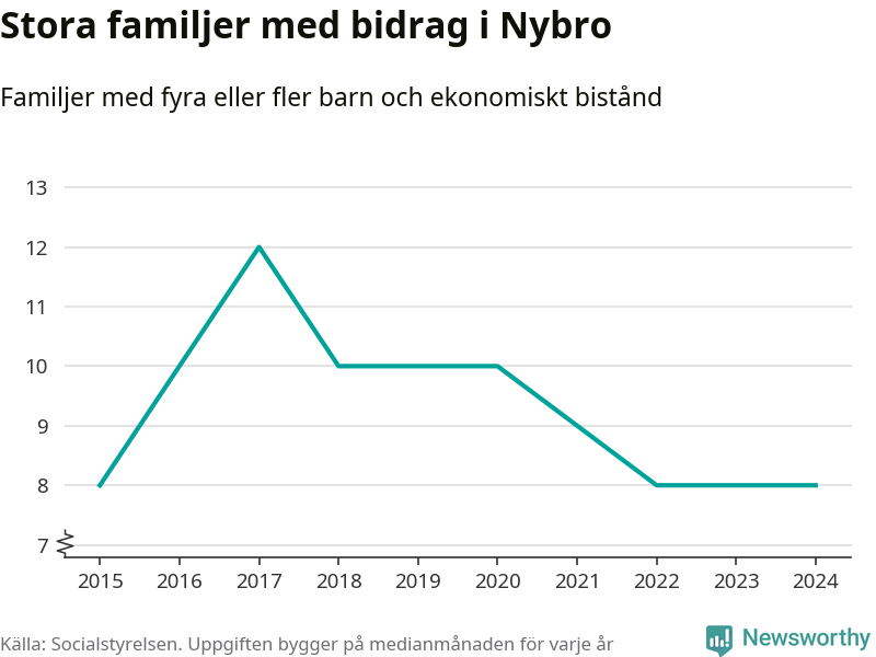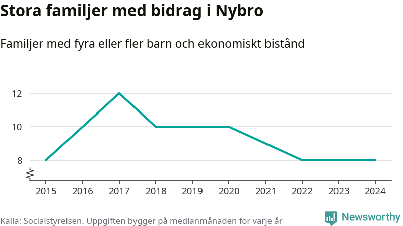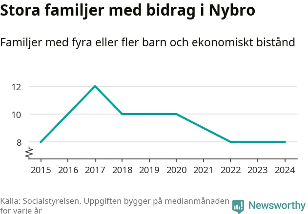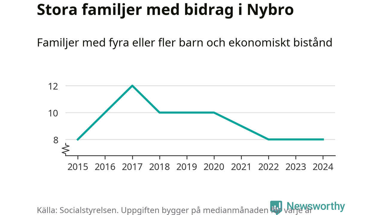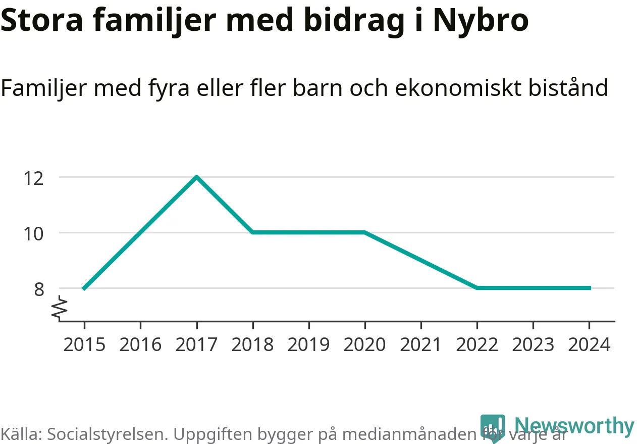 Nybro kommun tillhör varken de kommuner där högst eller lägst andel av befolkningen som fick ekonomiskt bistånd i landet 2024. Sammanlagt 286 hushåll fick någon gång under året ekonomiskt bistånd, enligt Socialstyrelsens statistik. Av dem var 90 barnfamiljer. Vi har inte siffror på hur många unika familjer med fyra barn eller fler det handlar om, men enligt Socialstyrelsens preliminära månadsstatistik betalades ekonomiskt bistånd ut till mellan någon eller några enstaka och tio familjer per månad under fjolåret – i snitt nio familjer.
