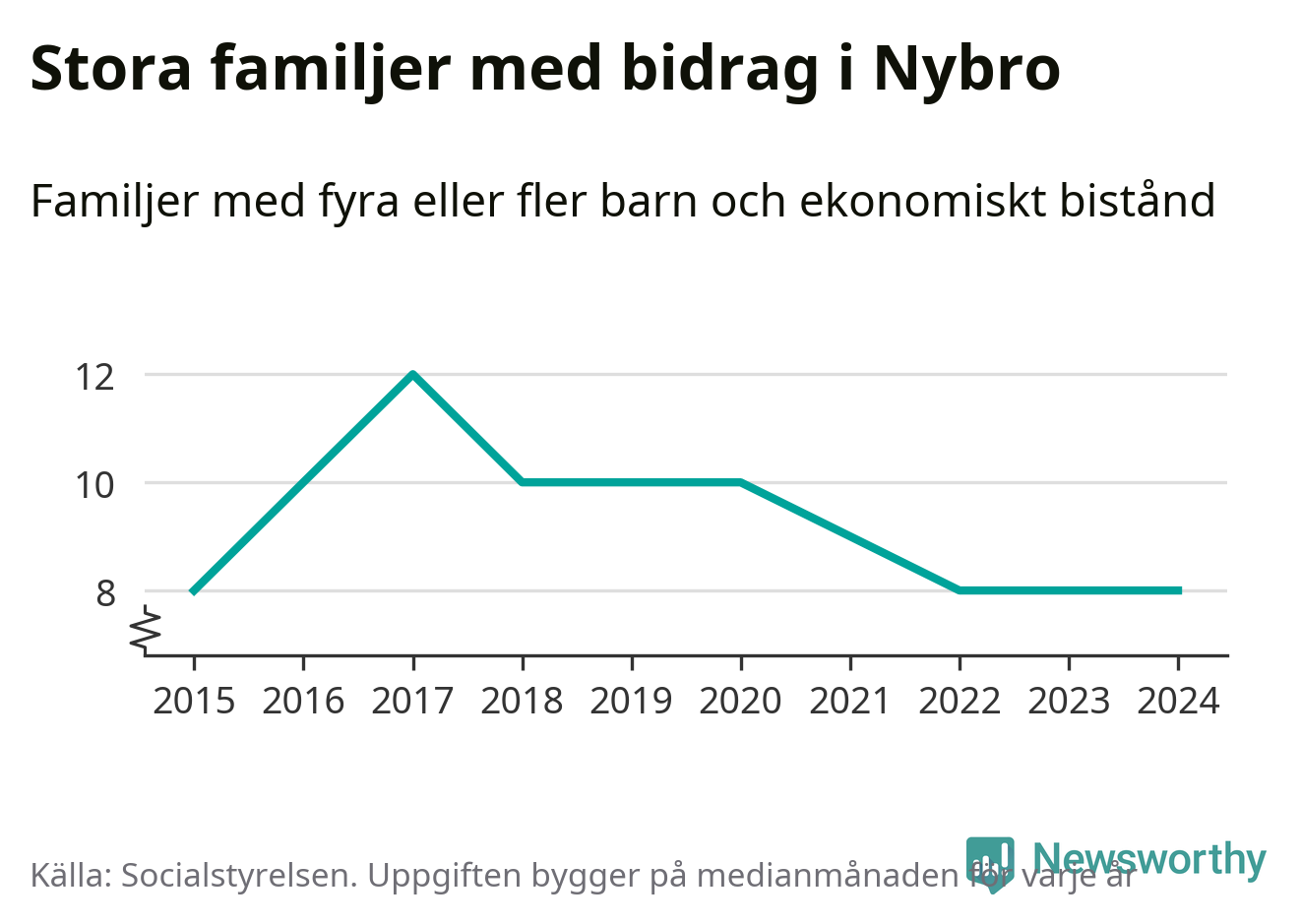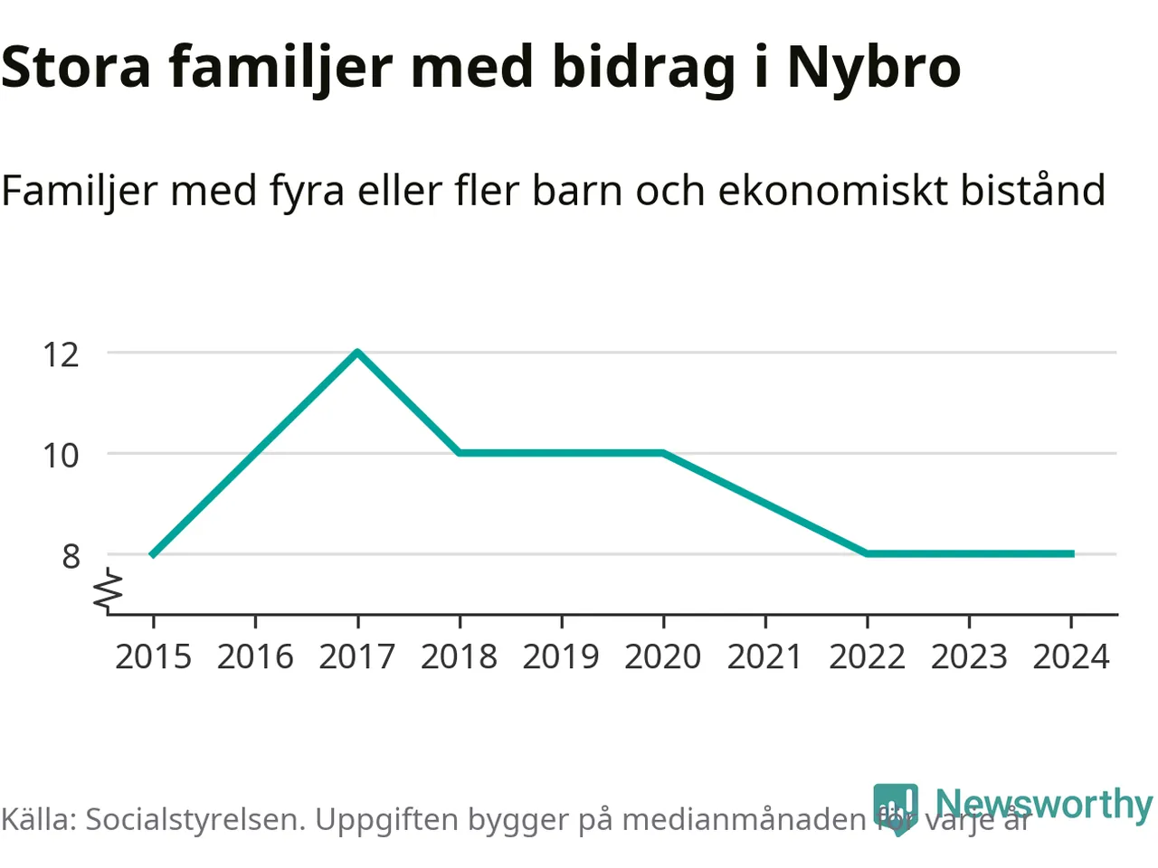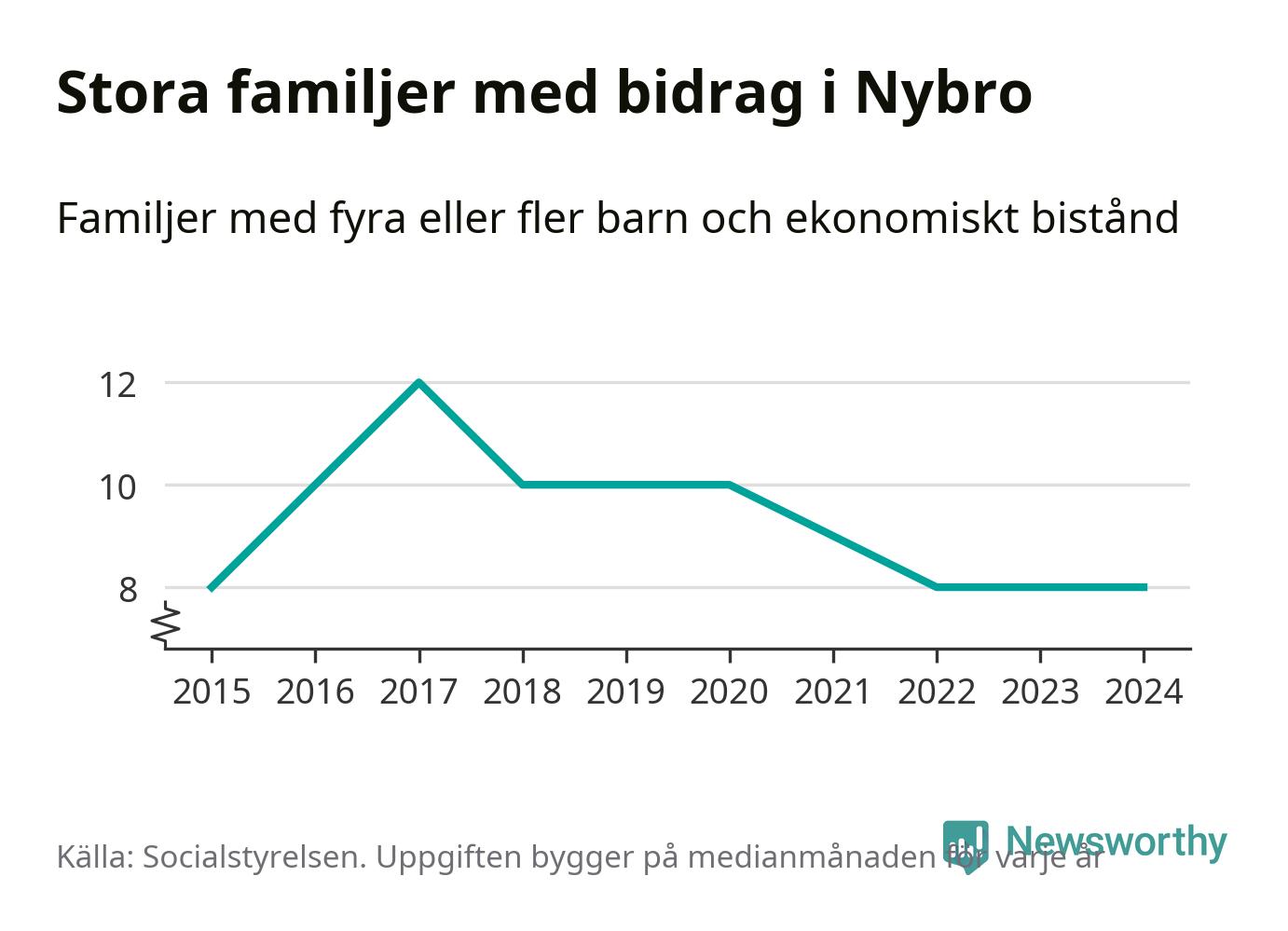 Det är den lägsta medianmånadssiffran i kommunen under de senaste tio åren. Året med högst snitt, 2017, var det tolv familjer.
