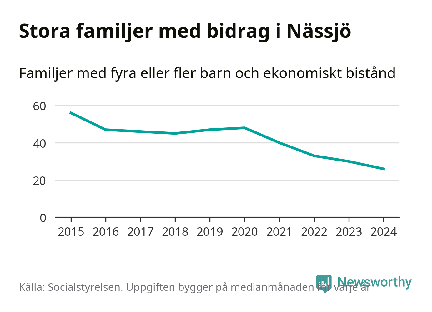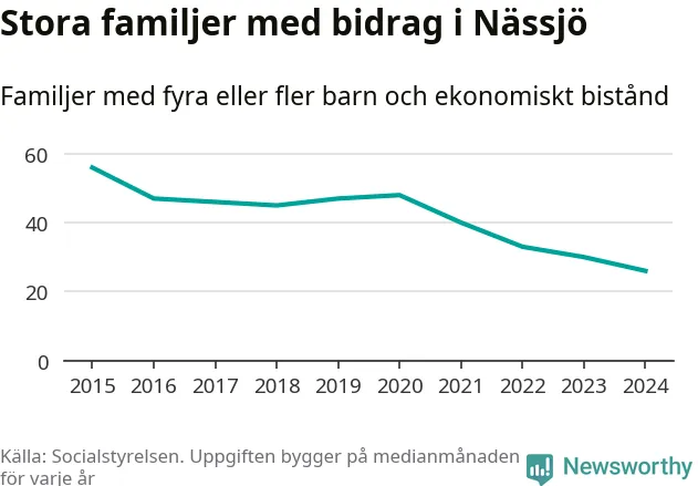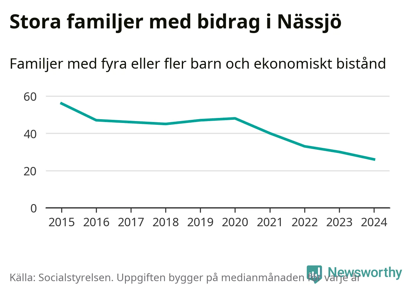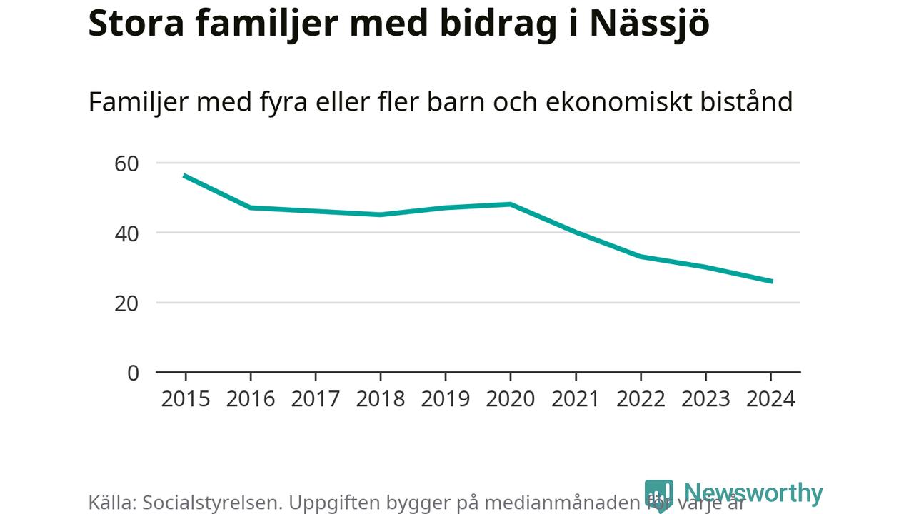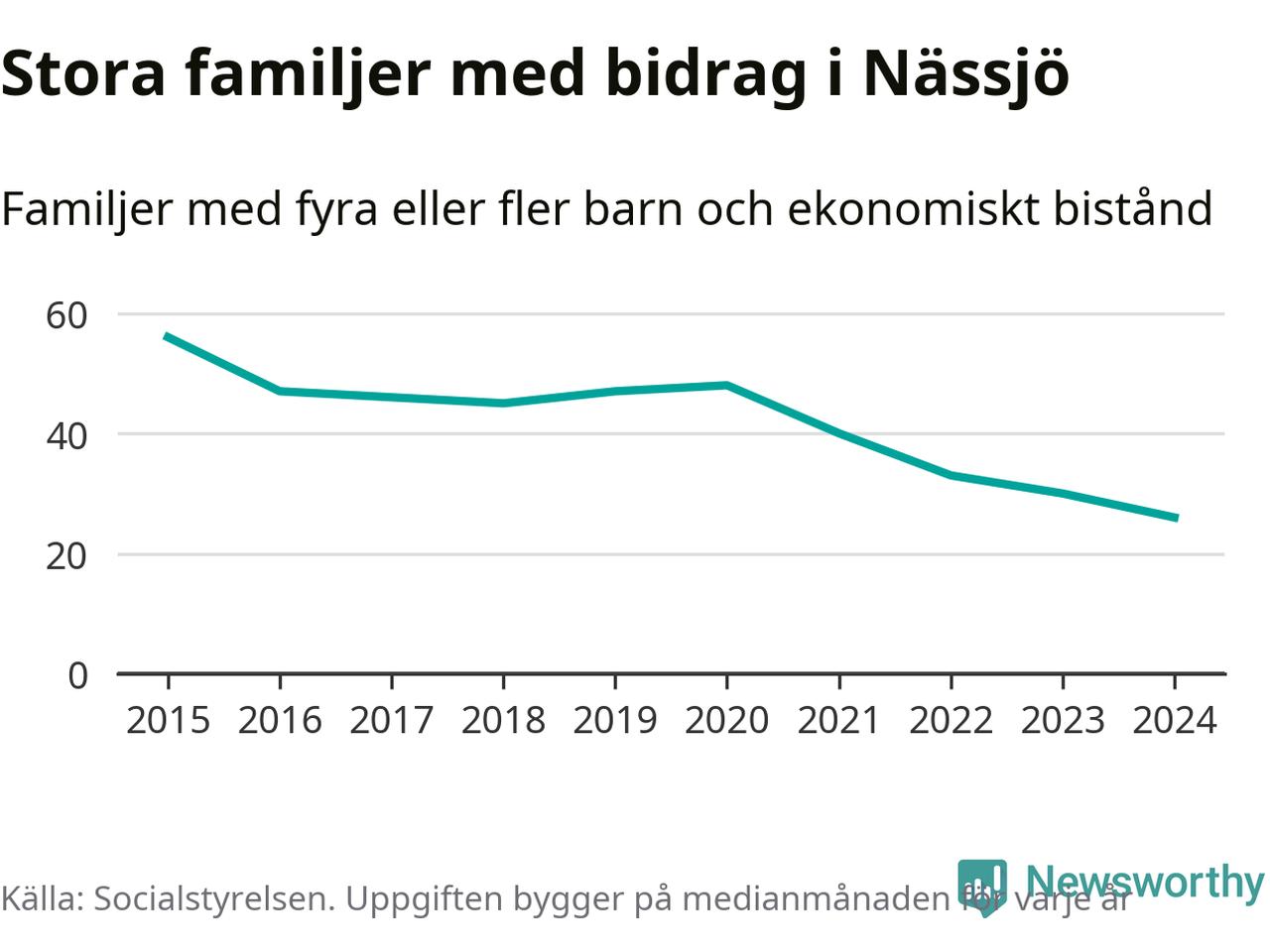 Nässjö kommun tillhör de kommuner i landet som har har högst andel av befolkningen som fick ekonomiskt bistånd 2024. Sammanlagt 790 hushåll fick någon gång under året ekonomiskt bistånd, enligt Socialstyrelsens statistik. Av dem var 247 barnfamiljer. Vi har inte siffror på hur många unika familjer med fyra barn eller fler det handlar om, men enligt Socialstyrelsens preliminära månadsstatistik betalades ekonomiskt bistånd ut till mellan 21 och 28 familjer per månad under fjolåret – i snitt 26 familjer.
