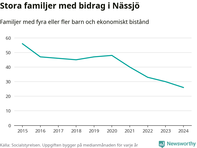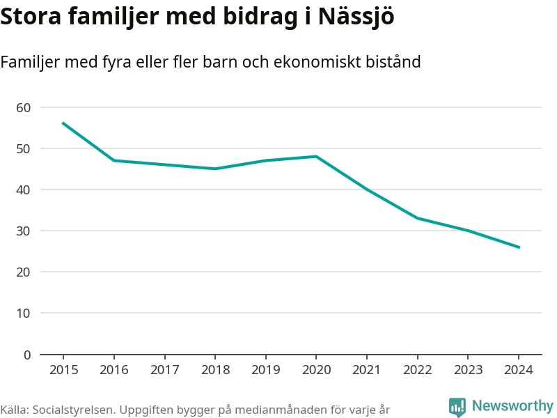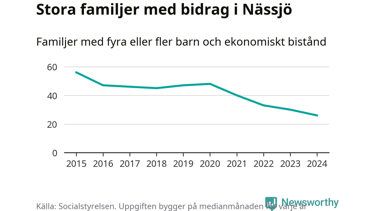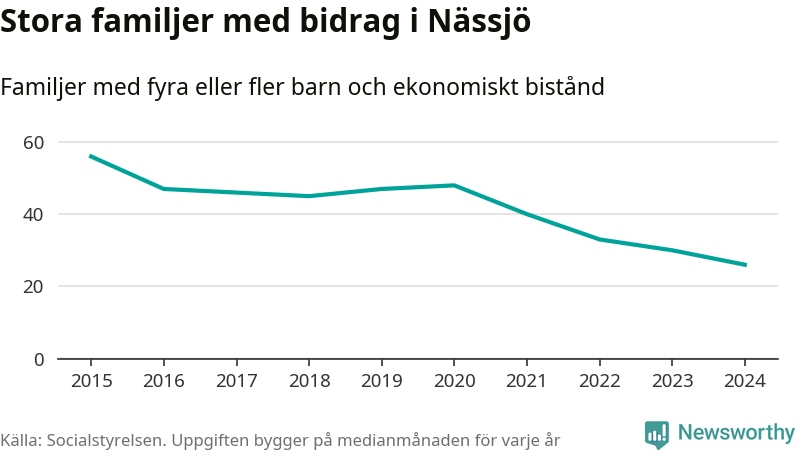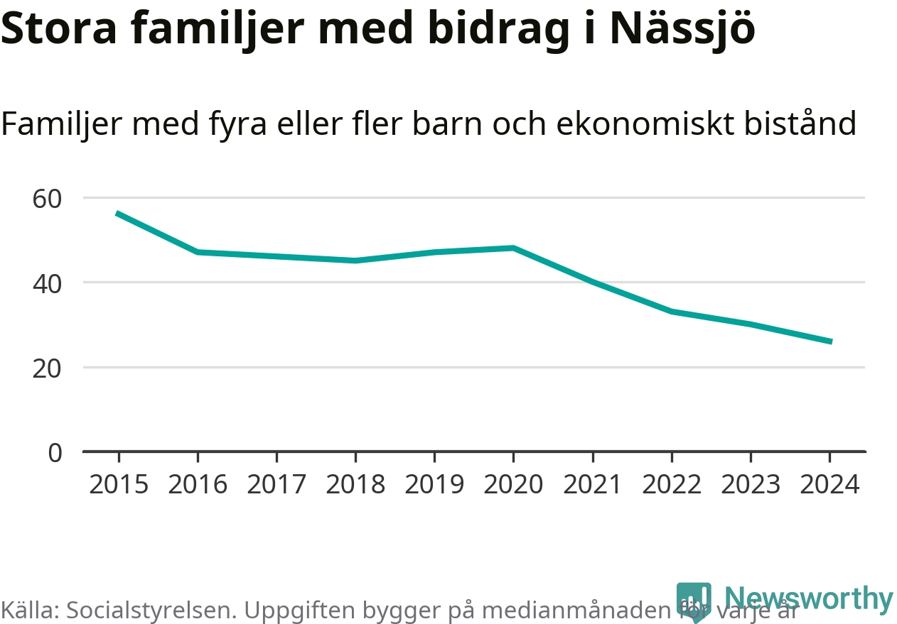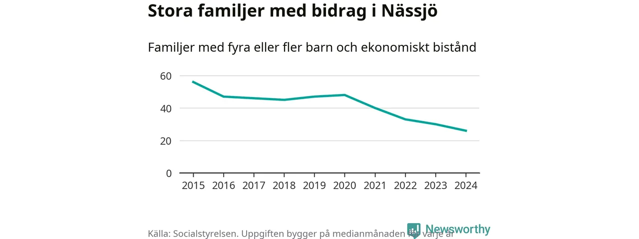 Nässjö kommun tillhör de kommuner i landet som har har högst andel av befolkningen som fick ekonomiskt bistånd 2024. Sammanlagt 790 hushåll fick någon gång under året ekonomiskt bistånd, enligt Socialstyrelsens statistik. Av dem var 247 barnfamiljer. Vi har inte siffror på hur många unika familjer med fyra barn eller fler det handlar om, men enligt Socialstyrelsens preliminära månadsstatistik betalades ekonomiskt bistånd ut till mellan 21 och 28 familjer per månad under fjolåret – i snitt 26 familjer.