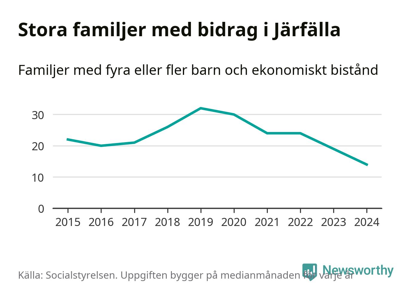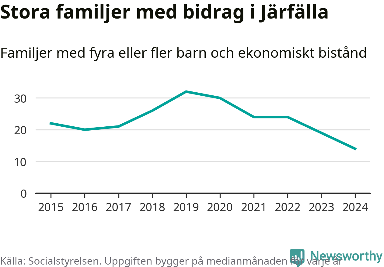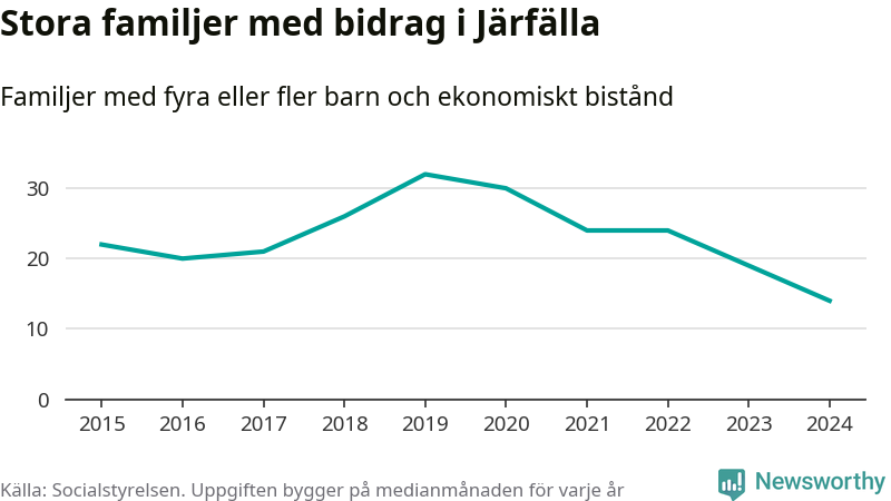 Det är den lägsta medianmånadssiffran i kommunen under de senaste tio åren. Året med högst snitt, 2019, var det 32 familjer.