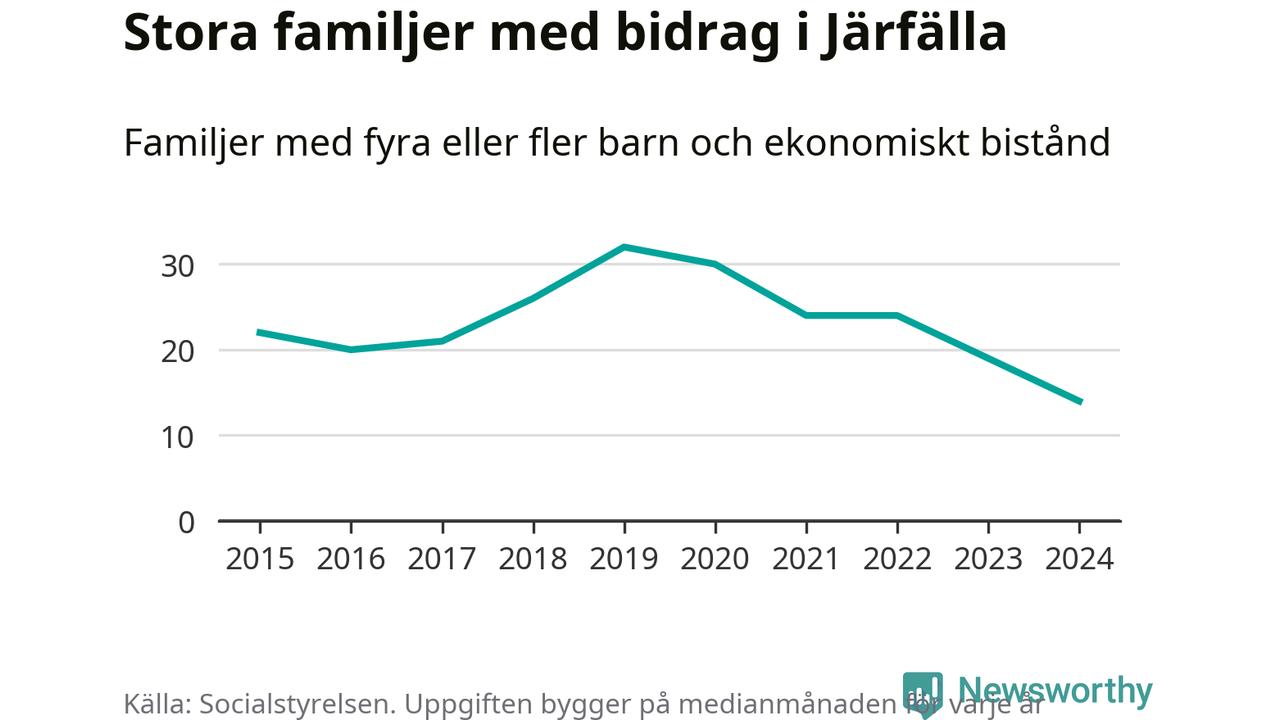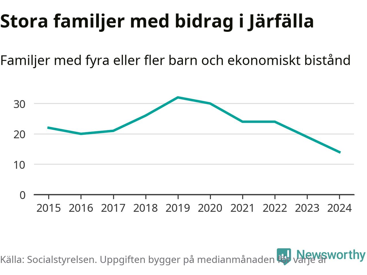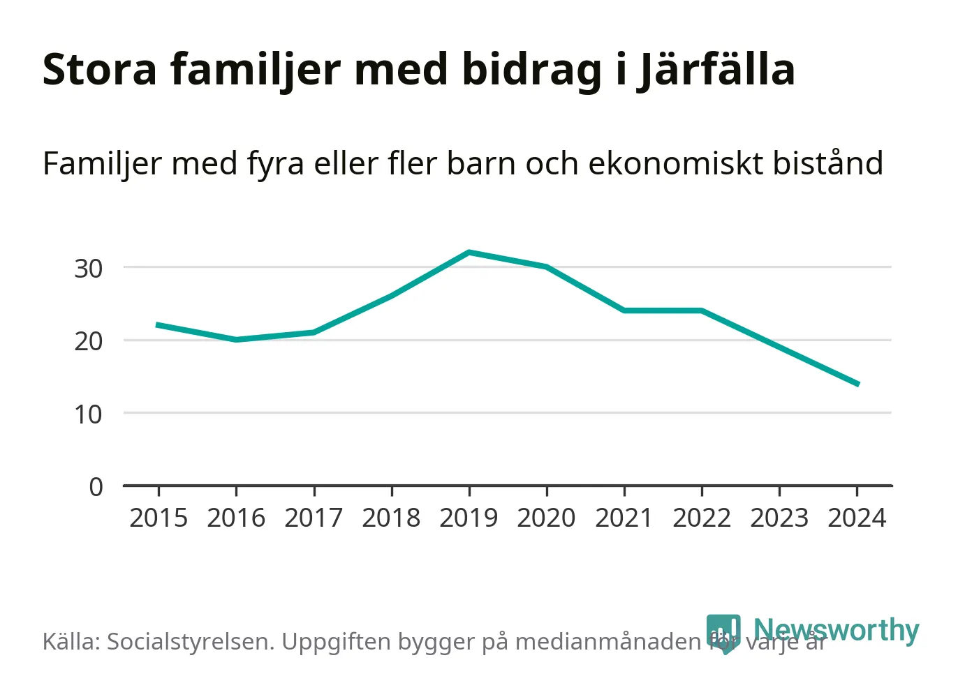 Järfälla kommun tillhör varken de kommuner där högst eller lägst andel av befolkningen som fick ekonomiskt bistånd i landet 2024. Sammanlagt 992 hushåll fick någon gång under året ekonomiskt bistånd, enligt Socialstyrelsens statistik. Av dem var 230 barnfamiljer. Vi har inte siffror på hur många unika familjer med fyra barn eller fler det handlar om, men enligt Socialstyrelsens preliminära månadsstatistik betalades ekonomiskt bistånd ut till mellan tio och 22 familjer per månad under fjolåret – i snitt 14 familjer.