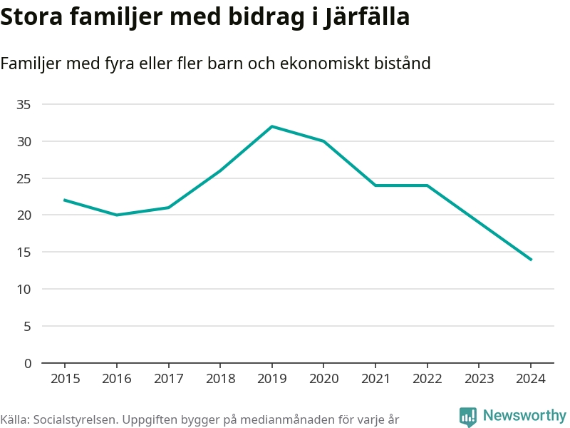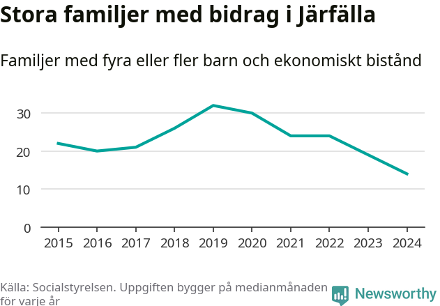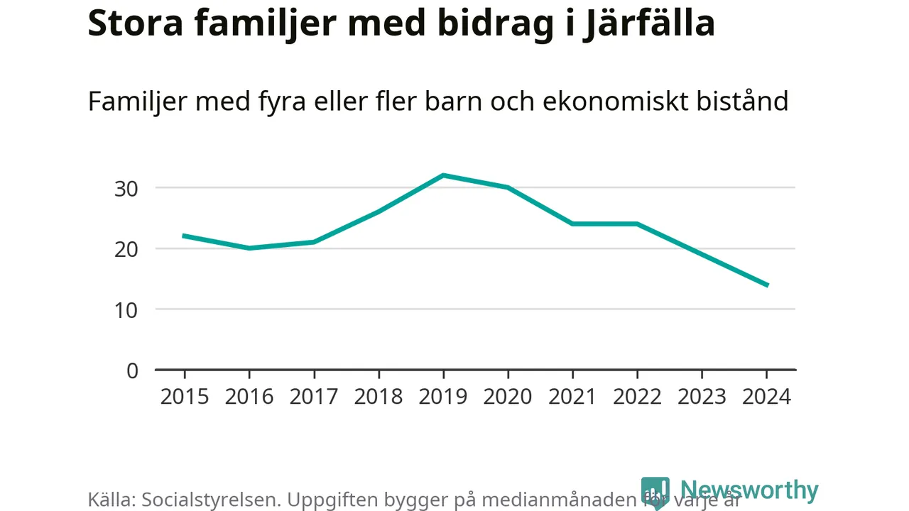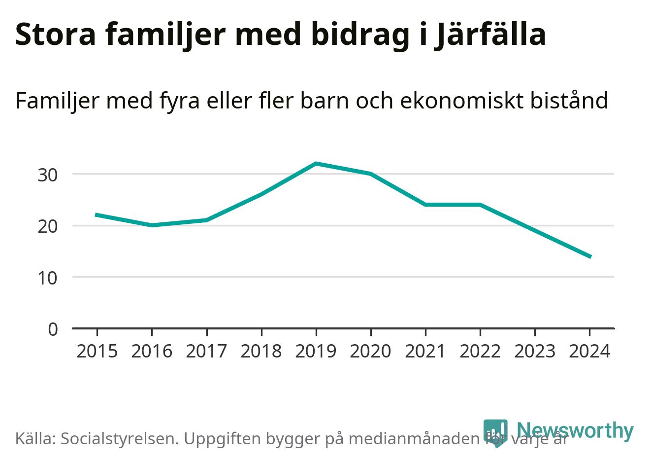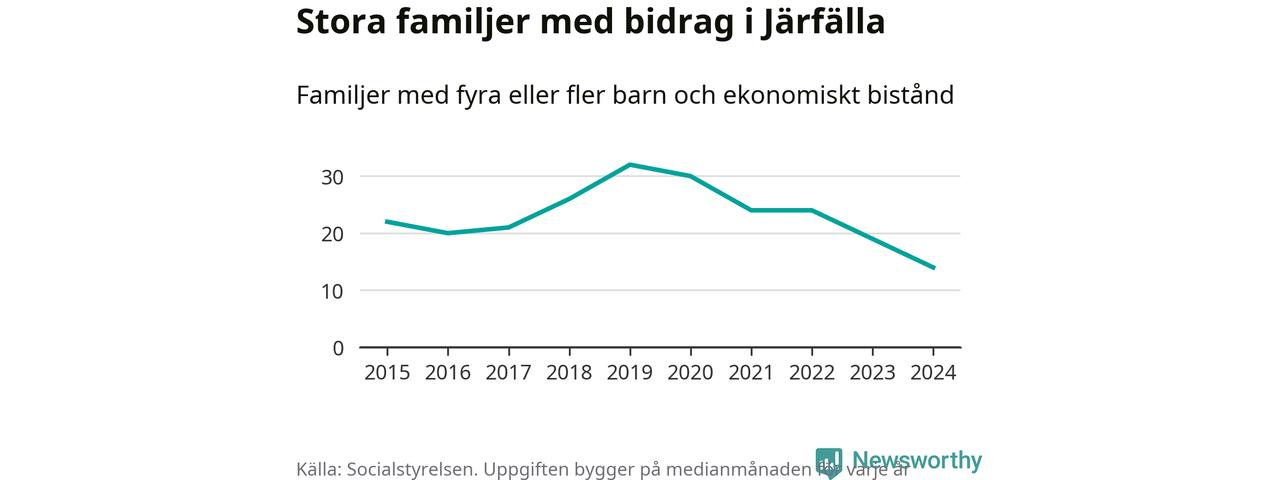 Järfälla kommun tillhör varken de kommuner där högst eller lägst andel av befolkningen som fick ekonomiskt bistånd i landet 2024. Sammanlagt 992 hushåll fick någon gång under året ekonomiskt bistånd, enligt Socialstyrelsens statistik. Av dem var 230 barnfamiljer. Vi har inte siffror på hur många unika familjer med fyra barn eller fler det handlar om, men enligt Socialstyrelsens preliminära månadsstatistik betalades ekonomiskt bistånd ut till mellan tio och 22 familjer per månad under fjolåret – i snitt 14 familjer.