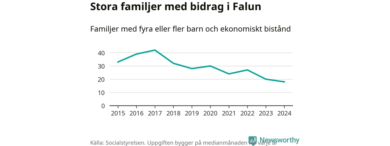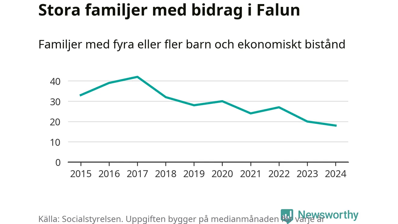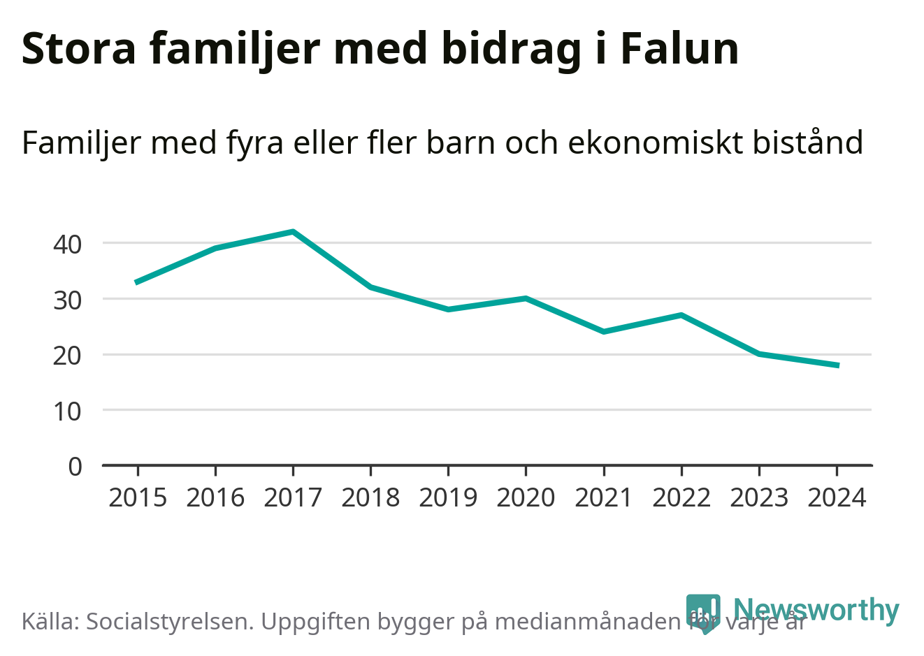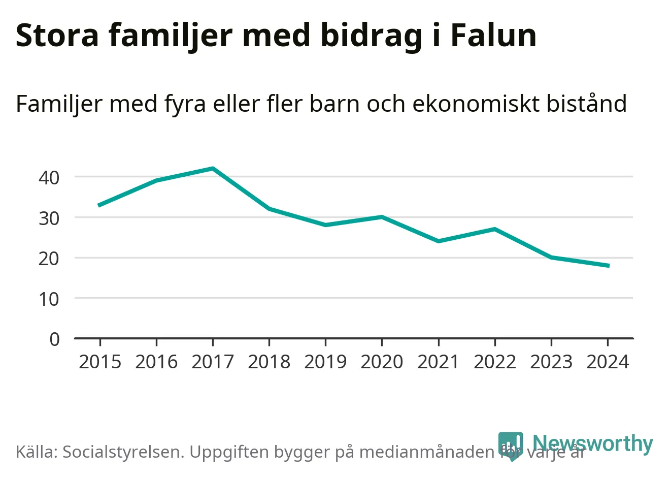 Falu kommun tillhör varken de kommuner där högst eller lägst andel av befolkningen som fick ekonomiskt bistånd i landet 2024. Sammanlagt 821 hushåll fick någon gång under året ekonomiskt bistånd, enligt Socialstyrelsens statistik. Av dem var 207 barnfamiljer. Vi har inte siffror på hur många unika familjer med fyra barn eller fler det handlar om, men enligt Socialstyrelsens preliminära månadsstatistik betalades ekonomiskt bistånd ut till mellan 14 och 20 familjer per månad under fjolåret – i snitt 18 familjer.