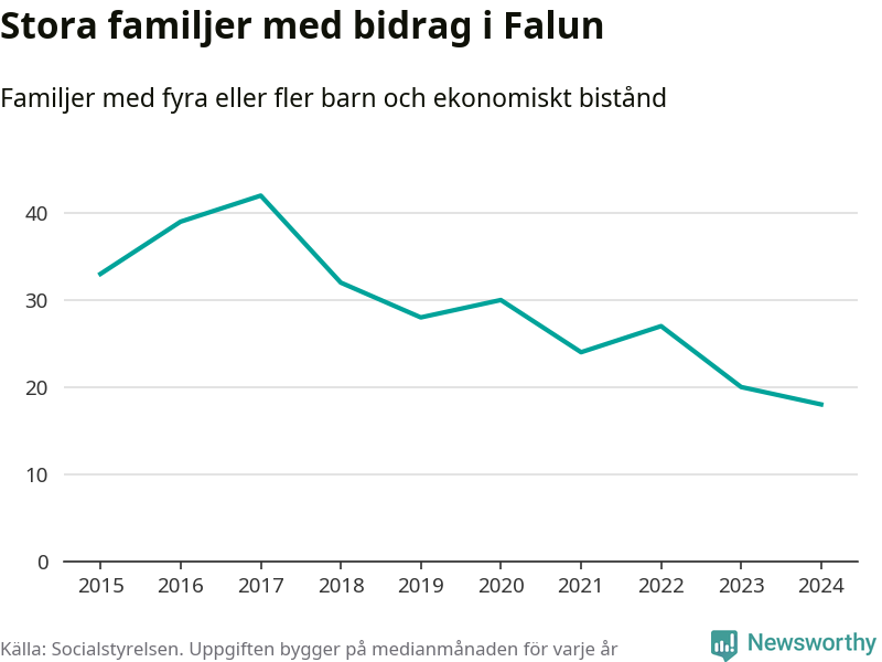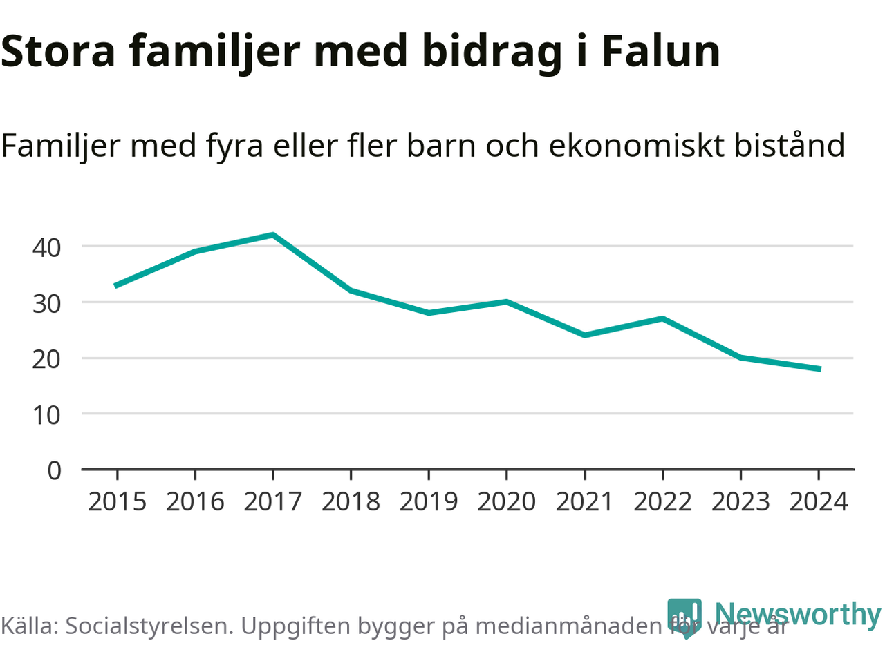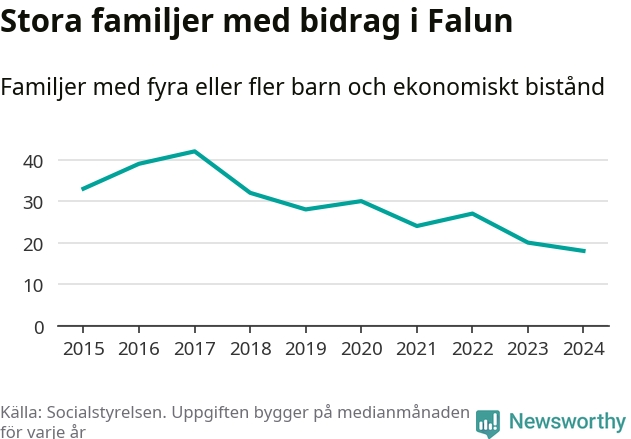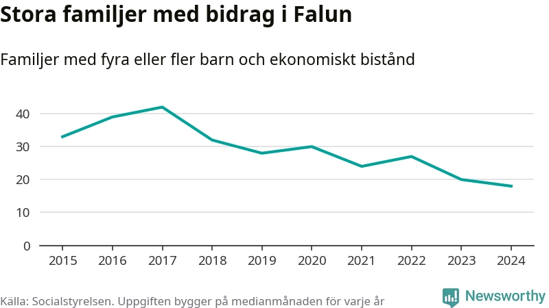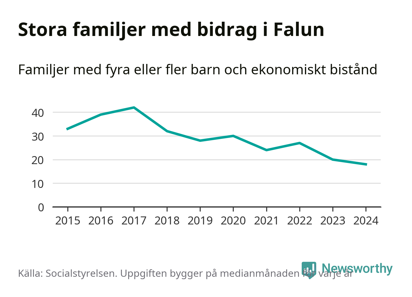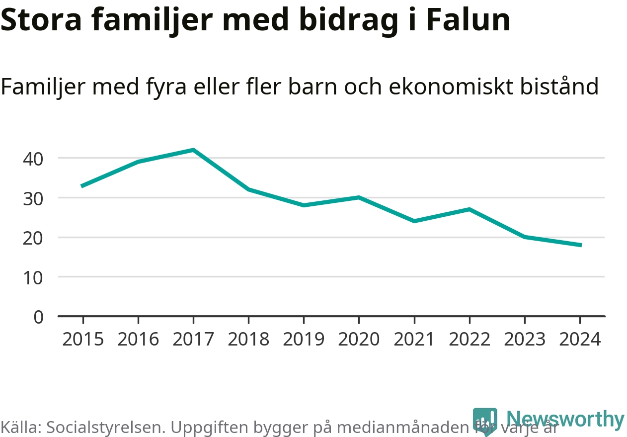 Falu kommun tillhör varken de kommuner där högst eller lägst andel av befolkningen som fick ekonomiskt bistånd i landet 2024. Sammanlagt 821 hushåll fick någon gång under året ekonomiskt bistånd, enligt Socialstyrelsens statistik. Av dem var 207 barnfamiljer. Vi har inte siffror på hur många unika familjer med fyra barn eller fler det handlar om, men enligt Socialstyrelsens preliminära månadsstatistik betalades ekonomiskt bistånd ut till mellan 14 och 20 familjer per månad under fjolåret – i snitt 18 familjer.