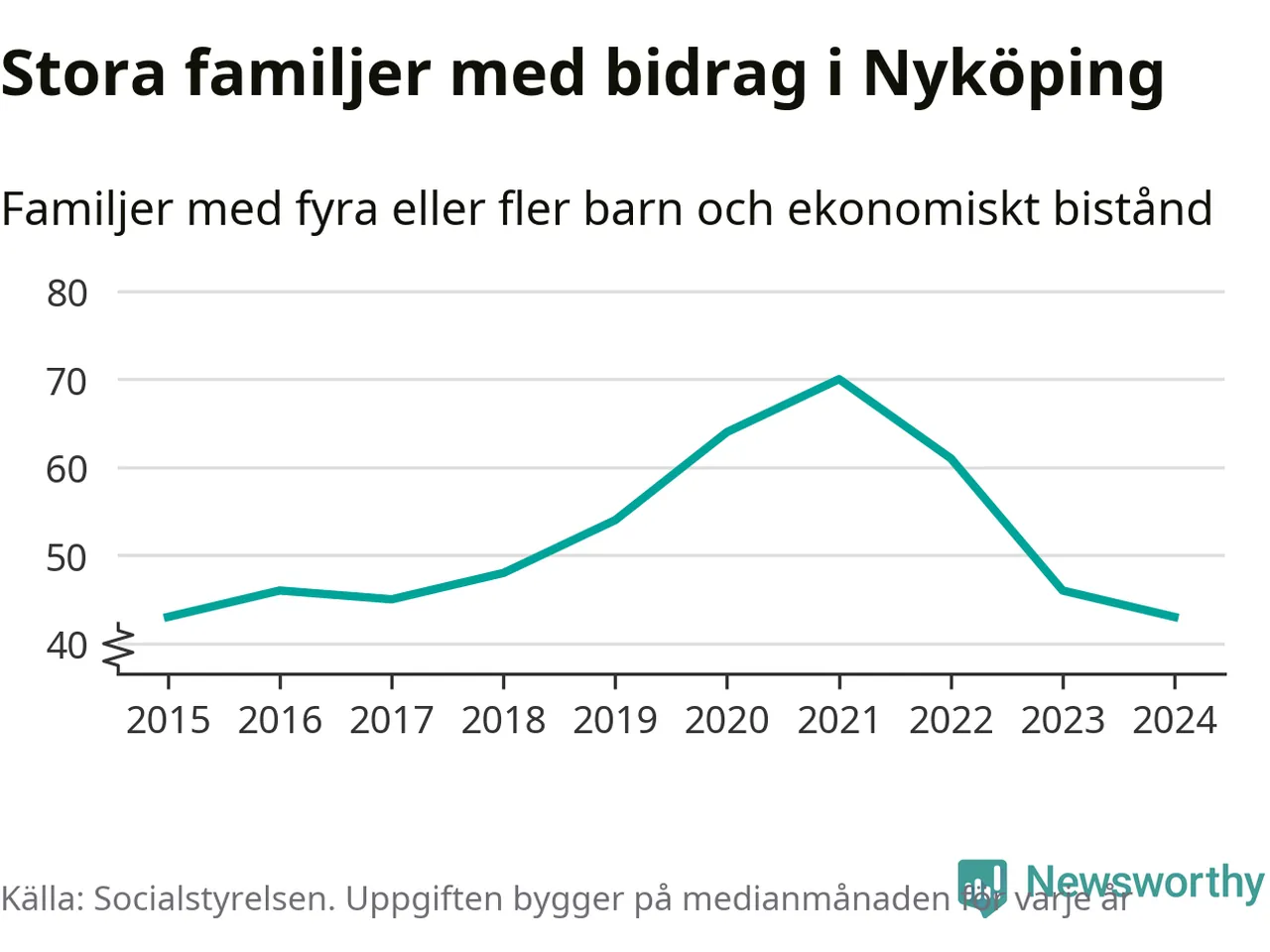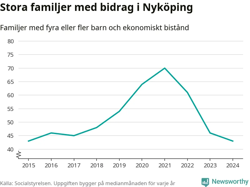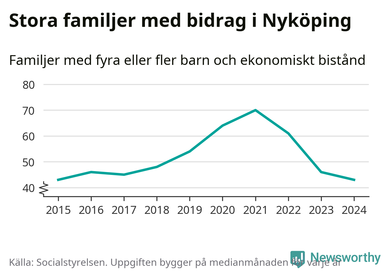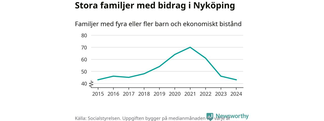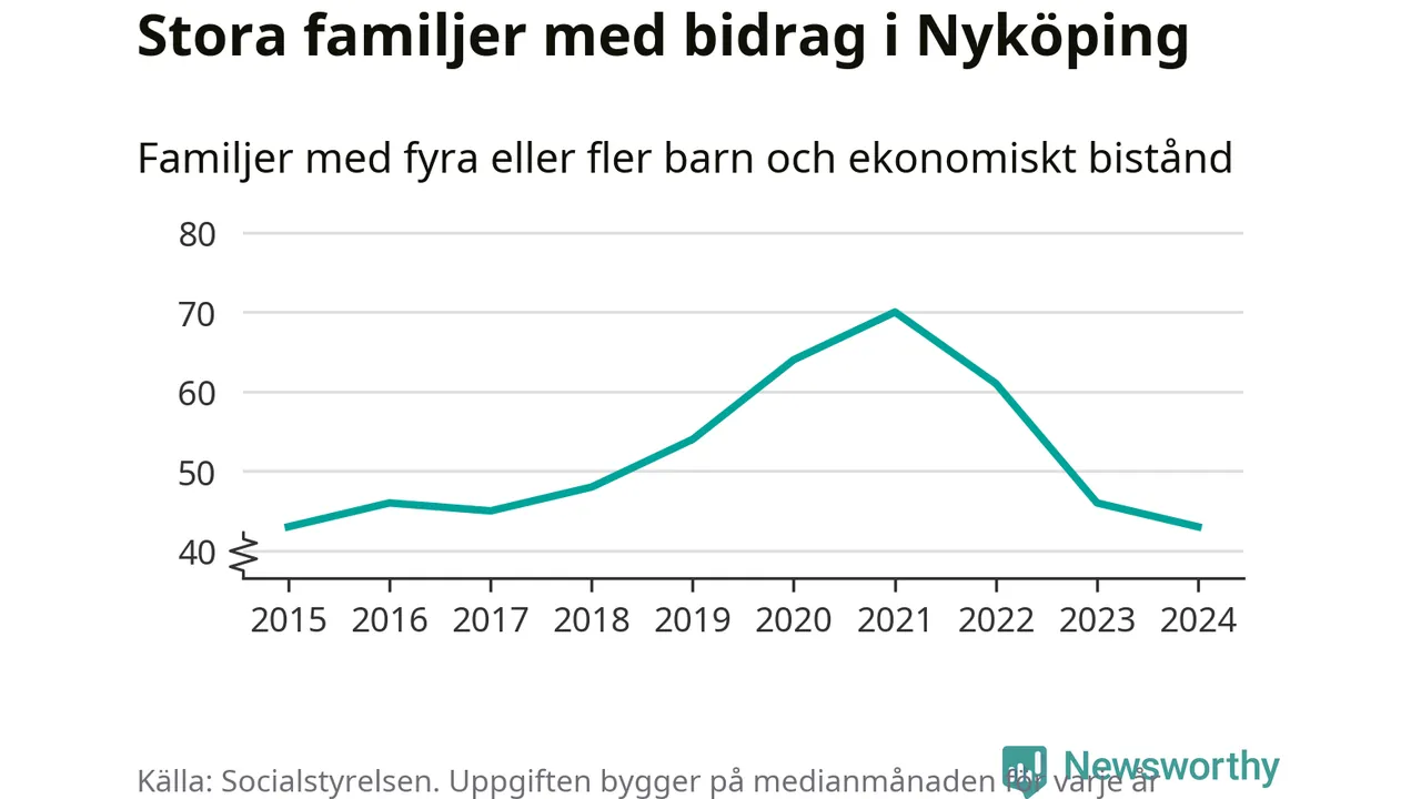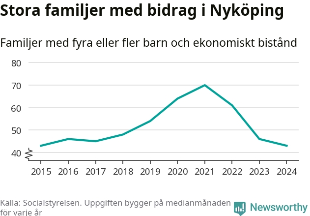 I Nyköpings kommun fick en högre andel av befolkningen ekonomiskt bistånd än de flesta andra kommuner i landet 2024. Sammanlagt 1 088 hushåll fick någon gång under året ekonomiskt bistånd, enligt Socialstyrelsens statistik. Av dem var 338 barnfamiljer. Vi har inte siffror på hur många unika familjer med fyra barn eller fler det handlar om, men enligt Socialstyrelsens preliminära månadsstatistik betalades ekonomiskt bistånd ut till mellan 37 och 47 familjer per månad under fjolåret – i snitt 43 familjer.