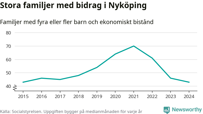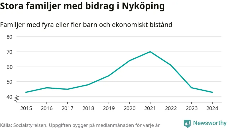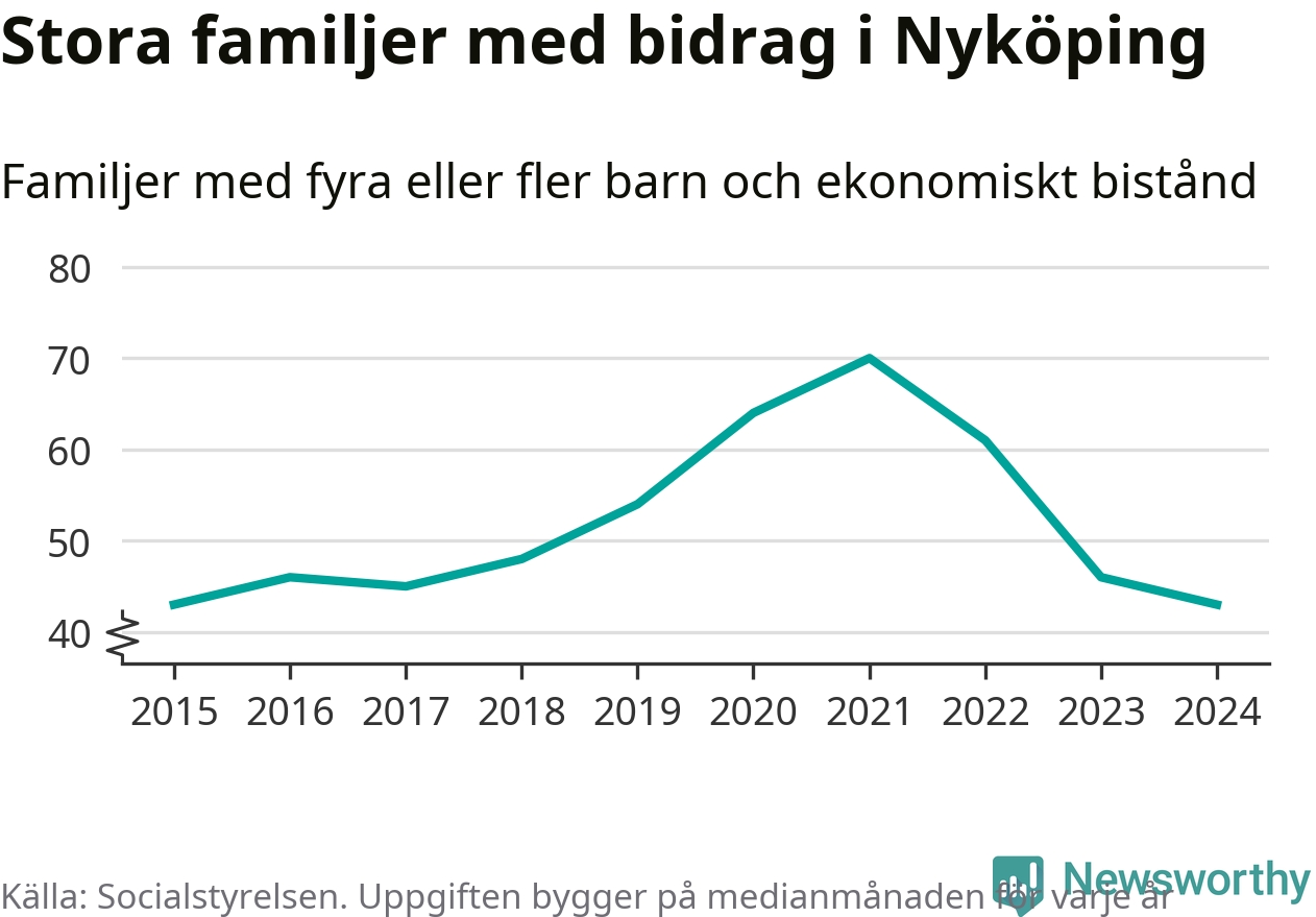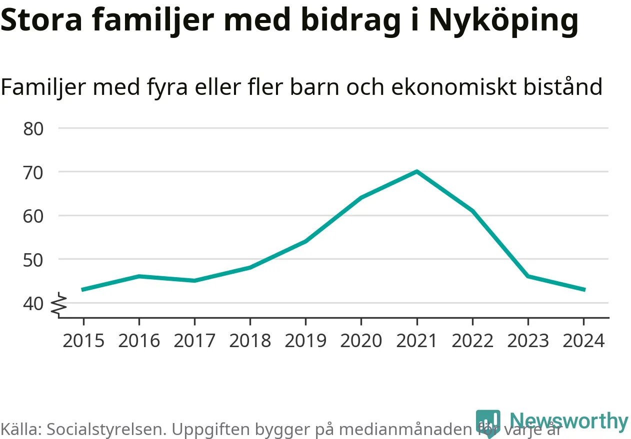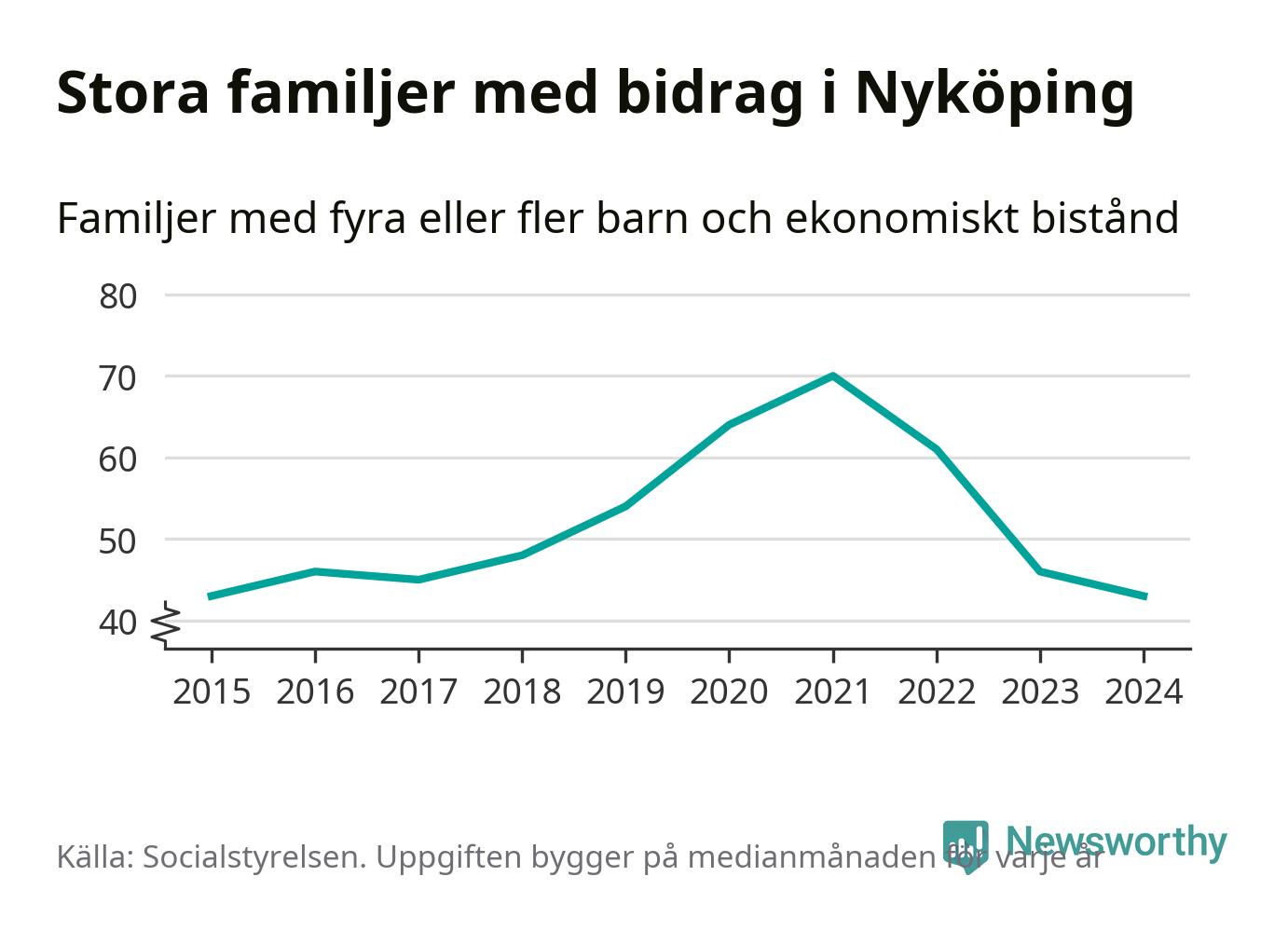 I Nyköpings kommun fick en högre andel av befolkningen ekonomiskt bistånd än de flesta andra kommuner i landet 2024. Sammanlagt 1 088 hushåll fick någon gång under året ekonomiskt bistånd, enligt Socialstyrelsens statistik. Av dem var 338 barnfamiljer. Vi har inte siffror på hur många unika familjer med fyra barn eller fler det handlar om, men enligt Socialstyrelsens preliminära månadsstatistik betalades ekonomiskt bistånd ut till mellan 37 och 47 familjer per månad under fjolåret – i snitt 43 familjer.