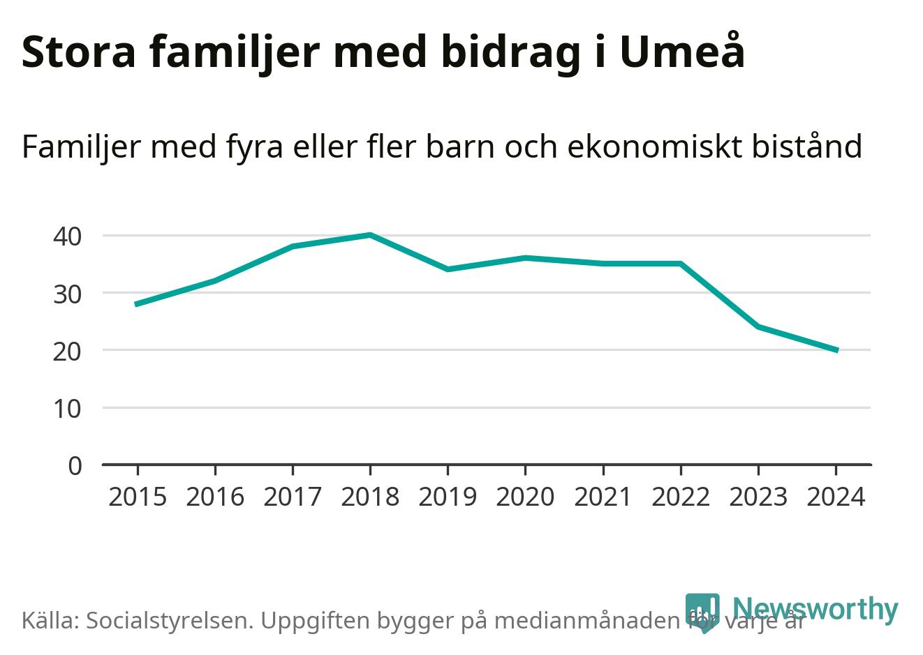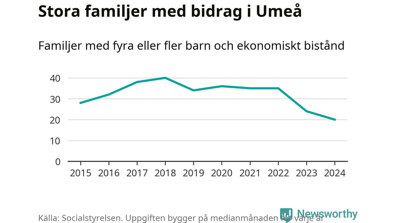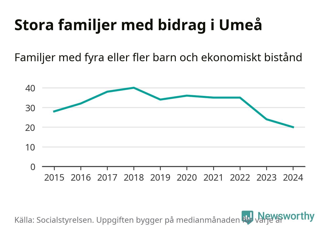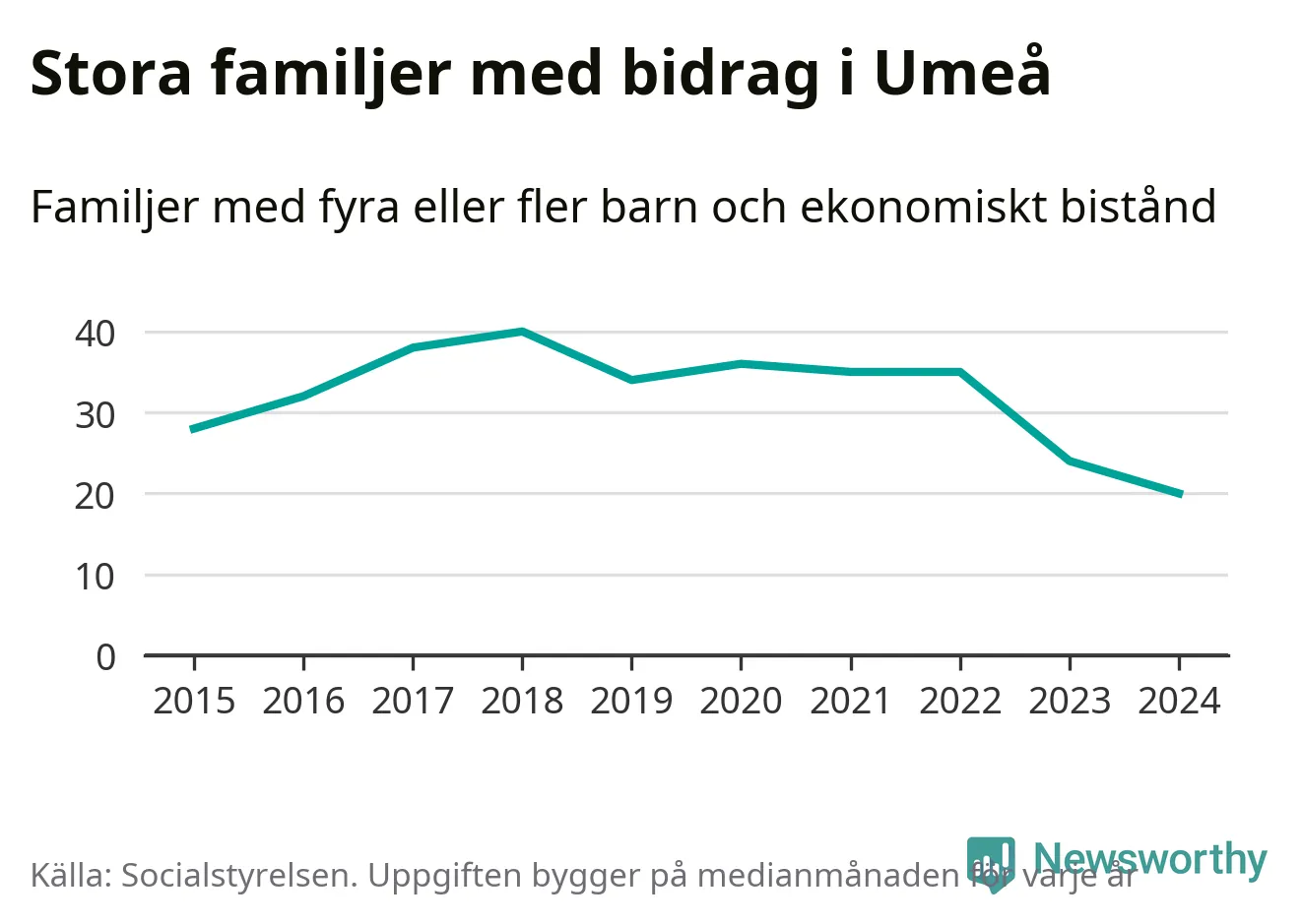 I Umeå kommun fick en lägre andel av befolkningen ekonomiskt bistånd än de flesta andra kommuner i landet 2024. Sammanlagt 1 317 hushåll fick någon gång under året ekonomiskt bistånd, enligt Socialstyrelsens statistik. Av dem var 302 barnfamiljer. Vi har inte siffror på hur många unika familjer med fyra barn eller fler det handlar om, men enligt Socialstyrelsens preliminära månadsstatistik betalades ekonomiskt bistånd ut till mellan 15 och 25 familjer per månad under fjolåret – i snitt 20 familjer.