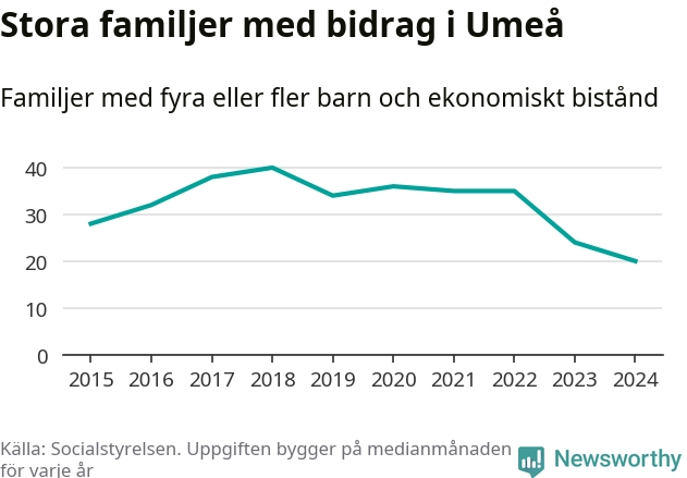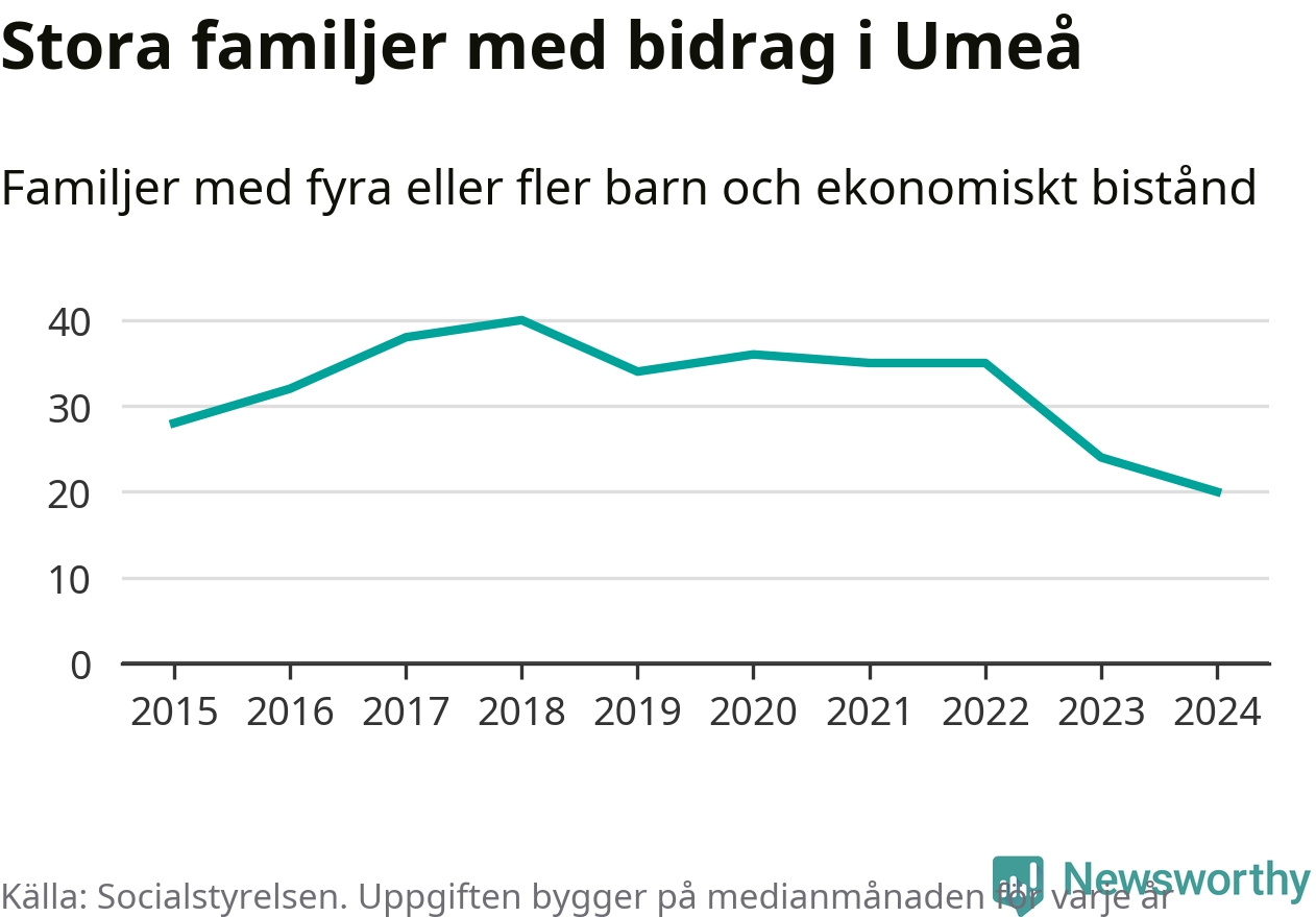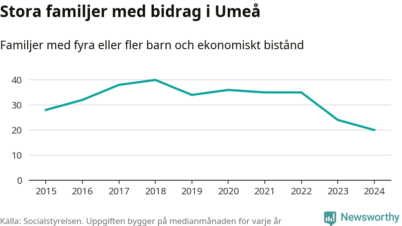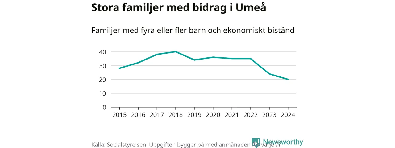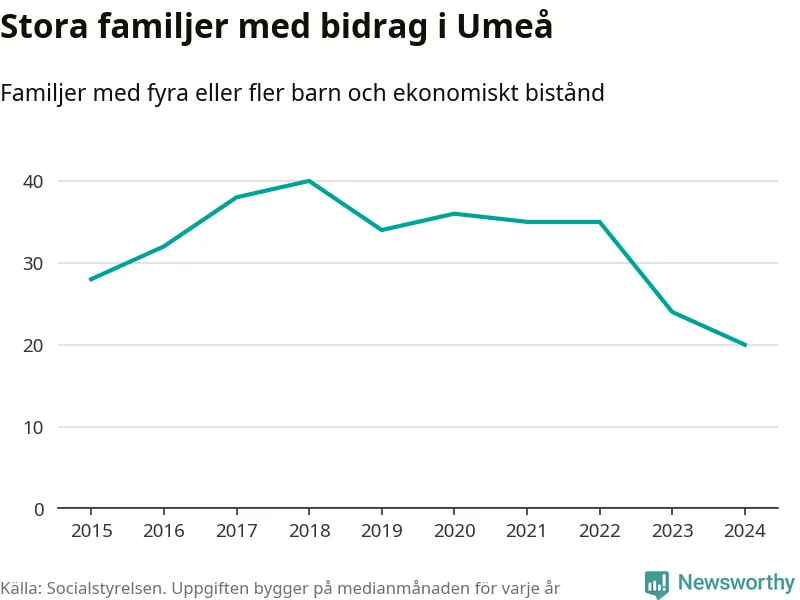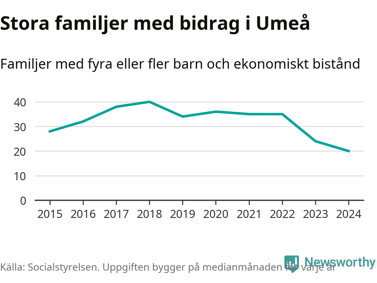 I Umeå kommun fick en lägre andel av befolkningen ekonomiskt bistånd än de flesta andra kommuner i landet 2024. Sammanlagt 1 317 hushåll fick någon gång under året ekonomiskt bistånd, enligt Socialstyrelsens statistik. Av dem var 302 barnfamiljer. Vi har inte siffror på hur många unika familjer med fyra barn eller fler det handlar om, men enligt Socialstyrelsens preliminära månadsstatistik betalades ekonomiskt bistånd ut till mellan 15 och 25 familjer per månad under fjolåret – i snitt 20 familjer.