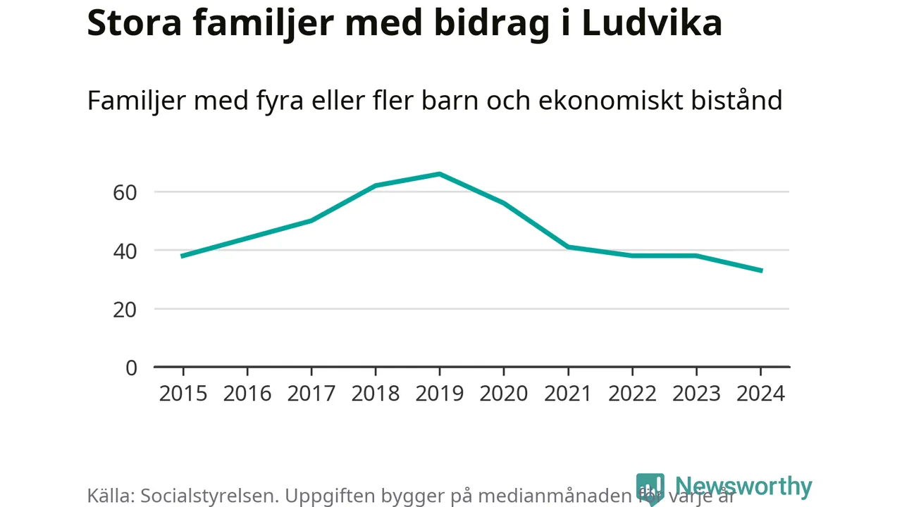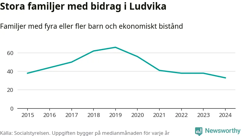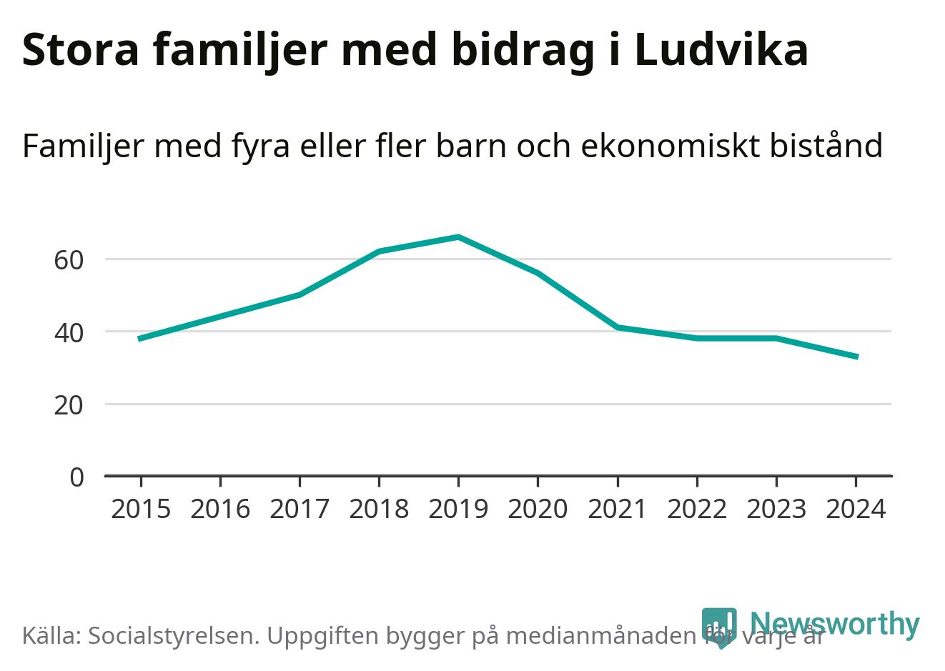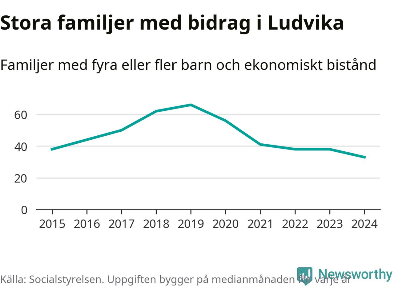 Ludvika kommun tillhör de kommuner i landet som har har högst andel av befolkningen som fick ekonomiskt bistånd 2024. Sammanlagt 669 hushåll fick någon gång under året ekonomiskt bistånd, enligt Socialstyrelsens statistik. Av dem var 171 barnfamiljer. Vi har inte siffror på hur många unika familjer med fyra barn eller fler det handlar om, men enligt Socialstyrelsens preliminära månadsstatistik betalades ekonomiskt bistånd ut till mellan 28 och 40 familjer per månad under fjolåret – i snitt 33 familjer.