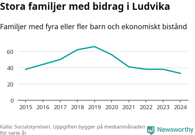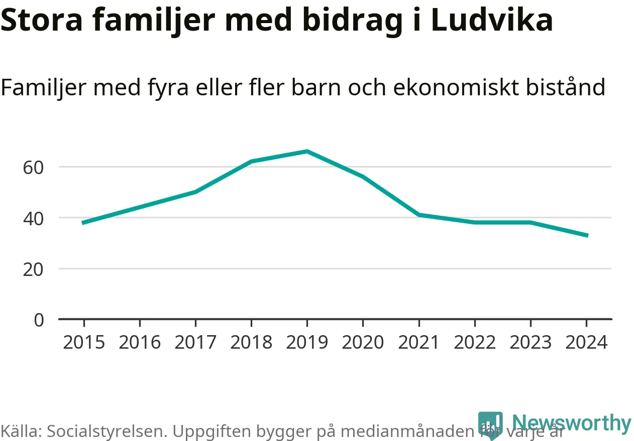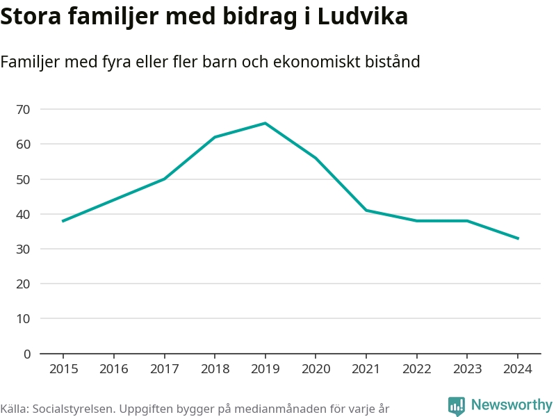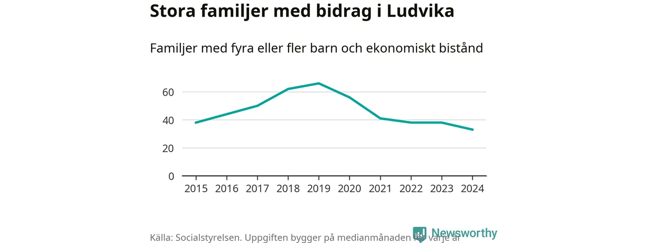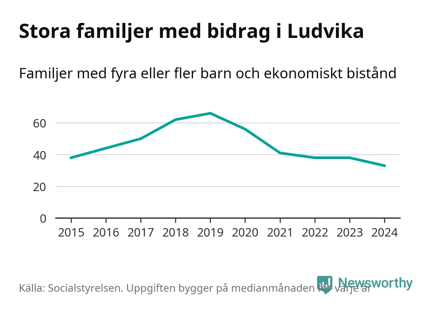 Ludvika kommun tillhör de kommuner i landet som har har högst andel av befolkningen som fick ekonomiskt bistånd 2024. Sammanlagt 669 hushåll fick någon gång under året ekonomiskt bistånd, enligt Socialstyrelsens statistik. Av dem var 171 barnfamiljer. Vi har inte siffror på hur många unika familjer med fyra barn eller fler det handlar om, men enligt Socialstyrelsens preliminära månadsstatistik betalades ekonomiskt bistånd ut till mellan 28 och 40 familjer per månad under fjolåret – i snitt 33 familjer.