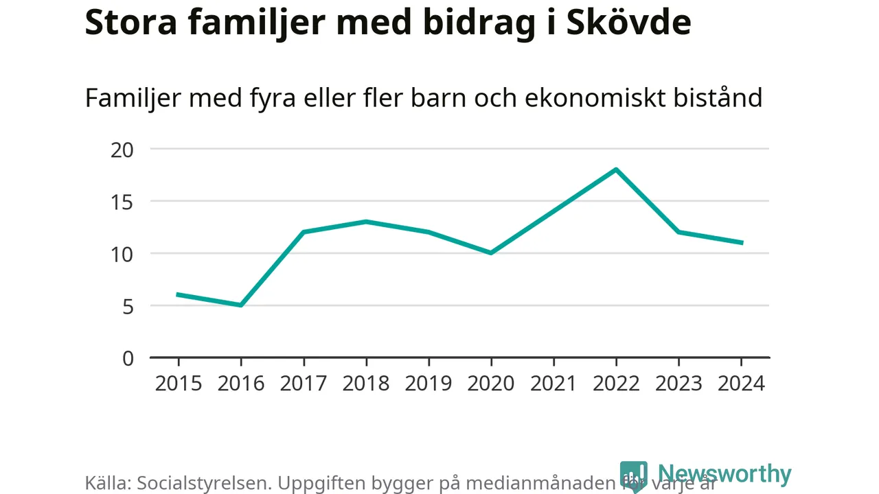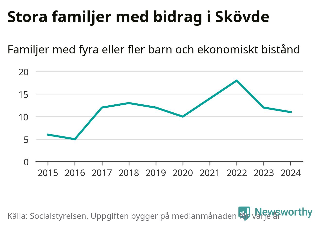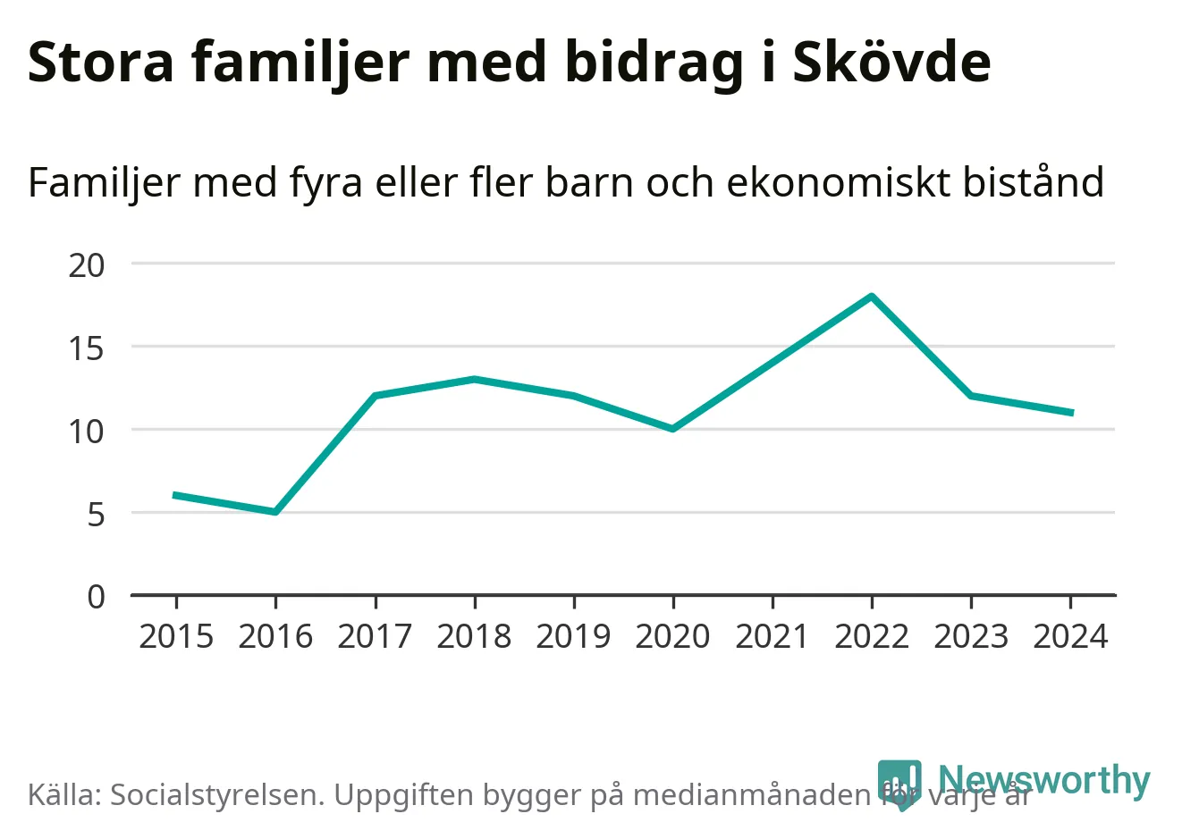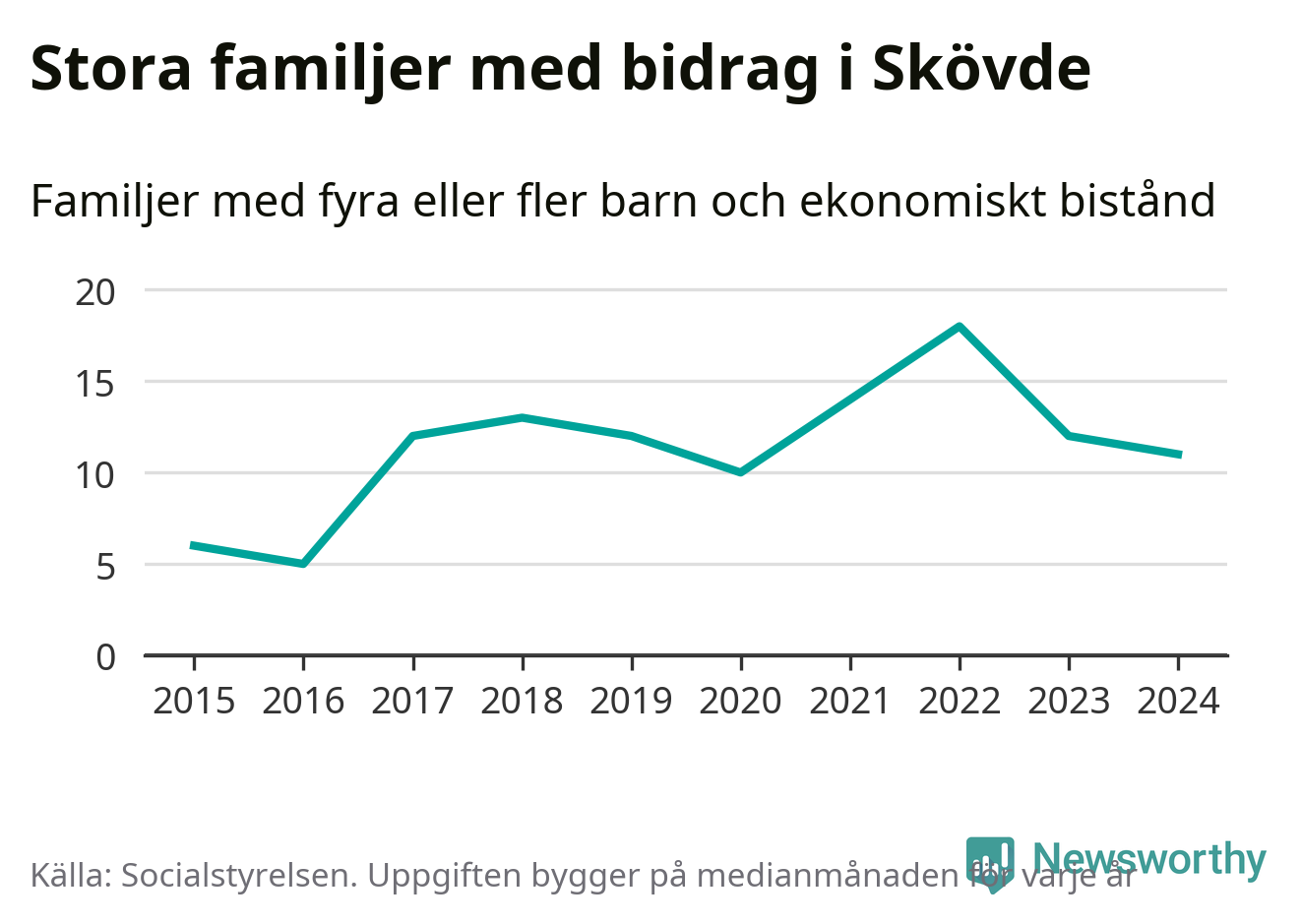 I Skövde kommun fick en lägre andel av befolkningen ekonomiskt bistånd än de flesta andra kommuner i landet 2024. Sammanlagt 492 hushåll fick någon gång under året ekonomiskt bistånd, enligt Socialstyrelsens statistik. Av dem var 114 barnfamiljer. Vi har inte siffror på hur många unika familjer med fyra barn eller fler det handlar om, men enligt Socialstyrelsens preliminära månadsstatistik betalades ekonomiskt bistånd ut till mellan sju och 15 familjer per månad under fjolåret – i snitt elva familjer.