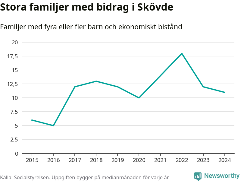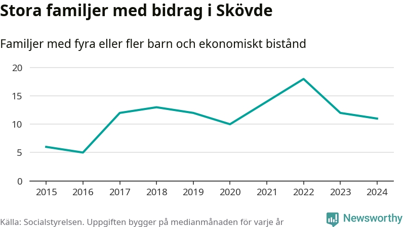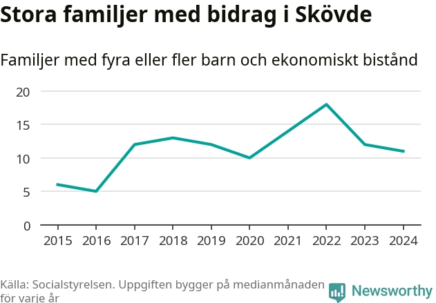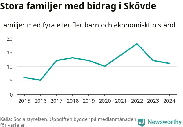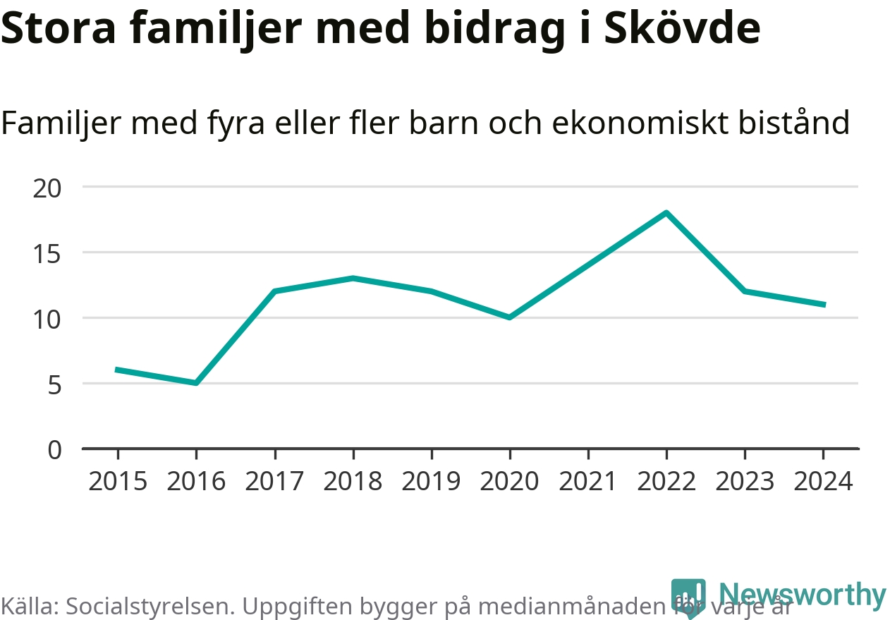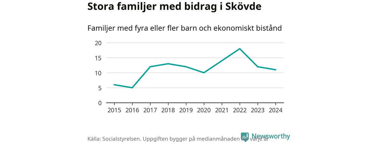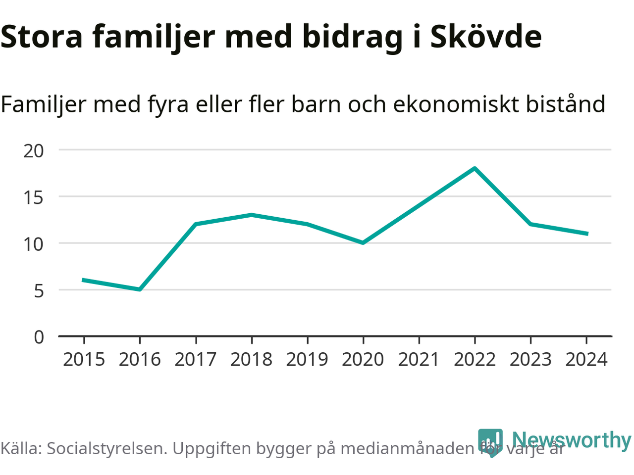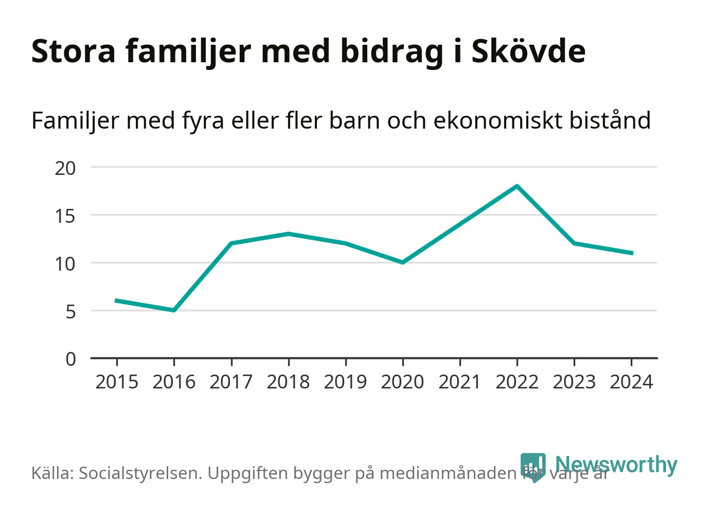 I Skövde kommun fick en lägre andel av befolkningen ekonomiskt bistånd än de flesta andra kommuner i landet 2024. Sammanlagt 492 hushåll fick någon gång under året ekonomiskt bistånd, enligt Socialstyrelsens statistik. Av dem var 114 barnfamiljer. Vi har inte siffror på hur många unika familjer med fyra barn eller fler det handlar om, men enligt Socialstyrelsens preliminära månadsstatistik betalades ekonomiskt bistånd ut till mellan sju och 15 familjer per månad under fjolåret – i snitt elva familjer.