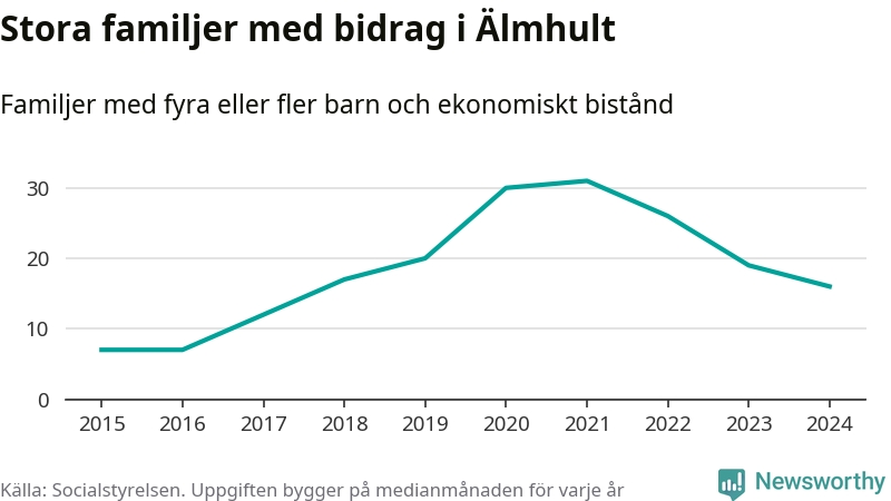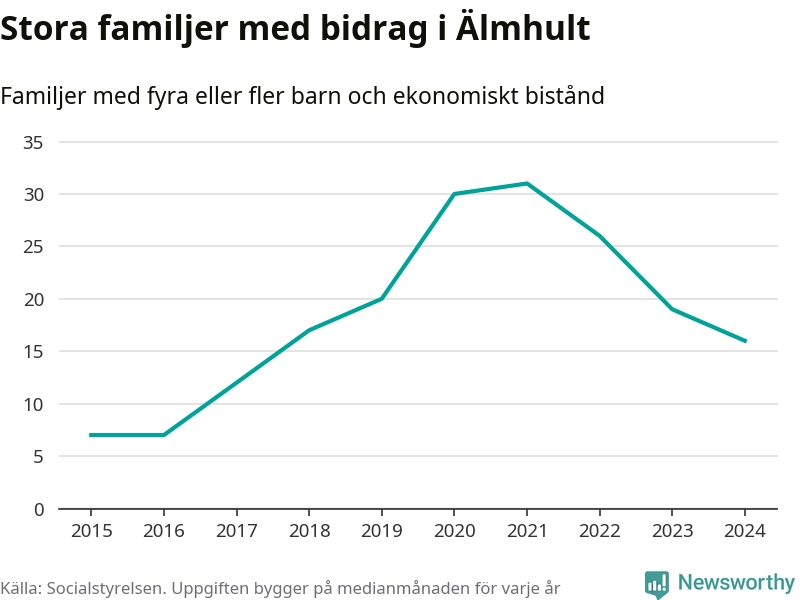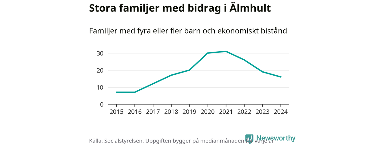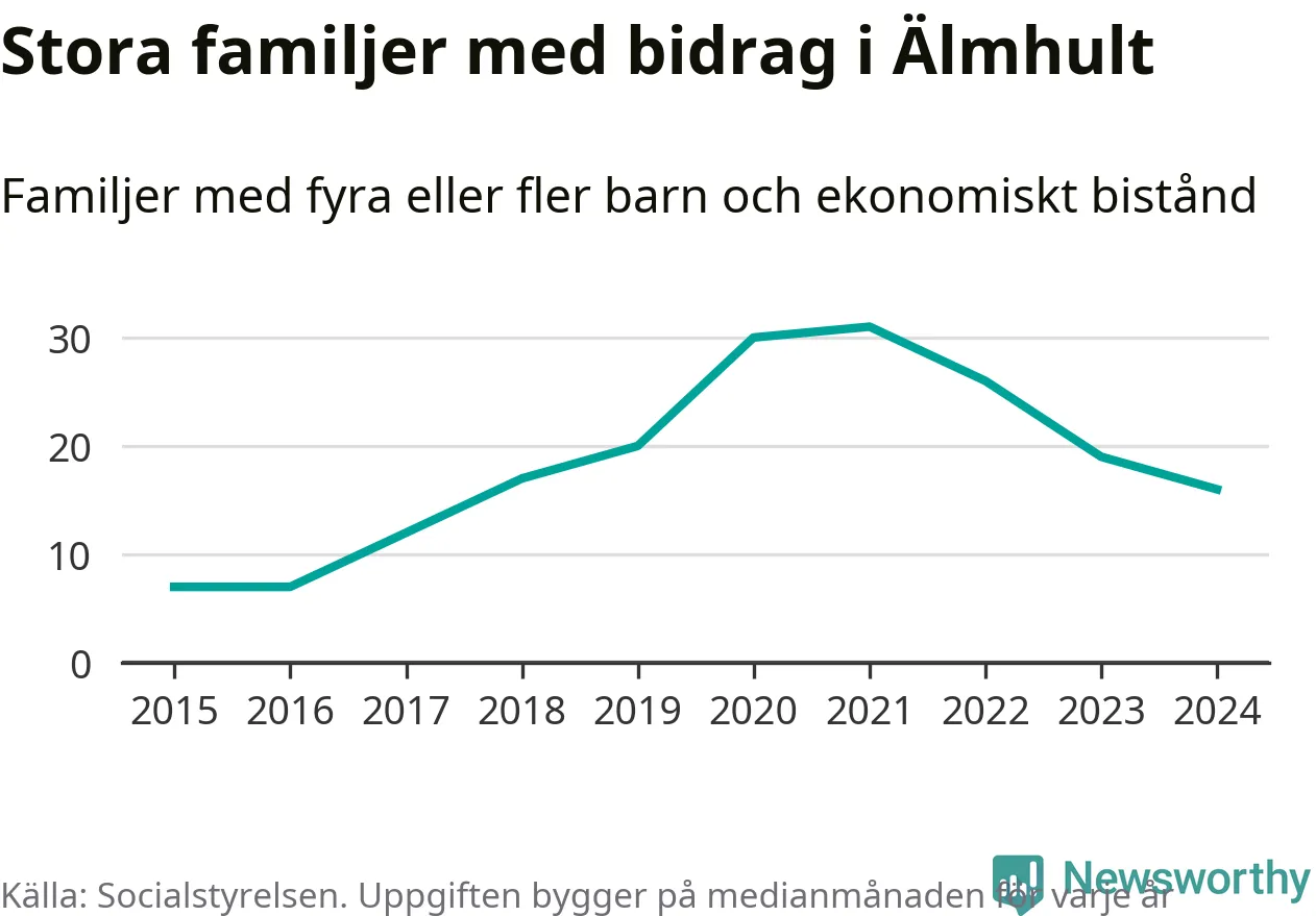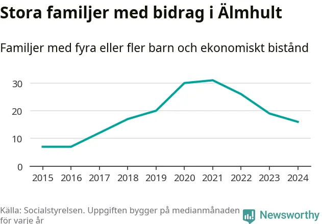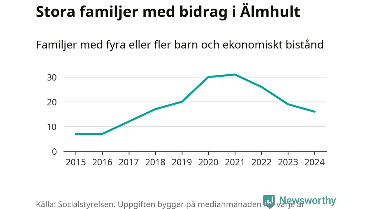 Älmhults kommun tillhör varken de kommuner där högst eller lägst andel av befolkningen som fick ekonomiskt bistånd i landet 2024. Sammanlagt 245 hushåll fick någon gång under året ekonomiskt bistånd, enligt Socialstyrelsens statistik. Av dem var några få barnfamiljer. Vi har inte siffror på hur många unika familjer med fyra barn eller fler det handlar om, men enligt Socialstyrelsens preliminära månadsstatistik betalades ekonomiskt bistånd ut till mellan 13 och 19 familjer per månad under fjolåret – i snitt 16 familjer.