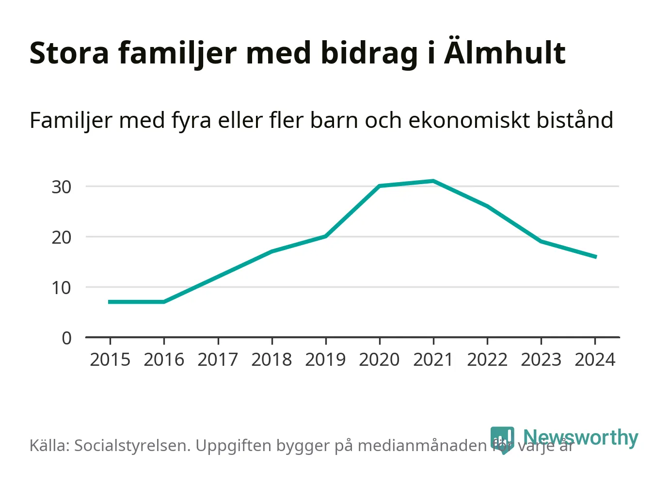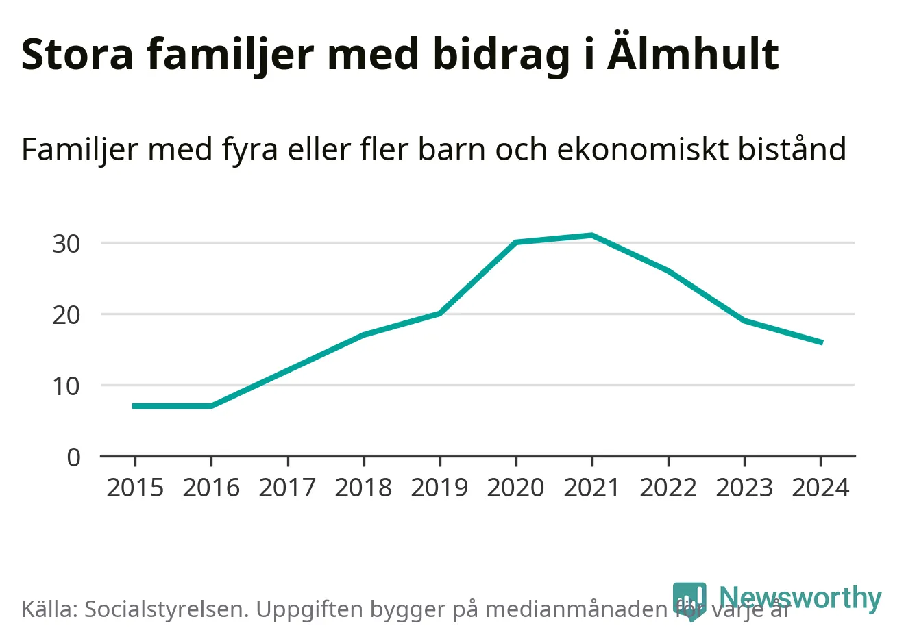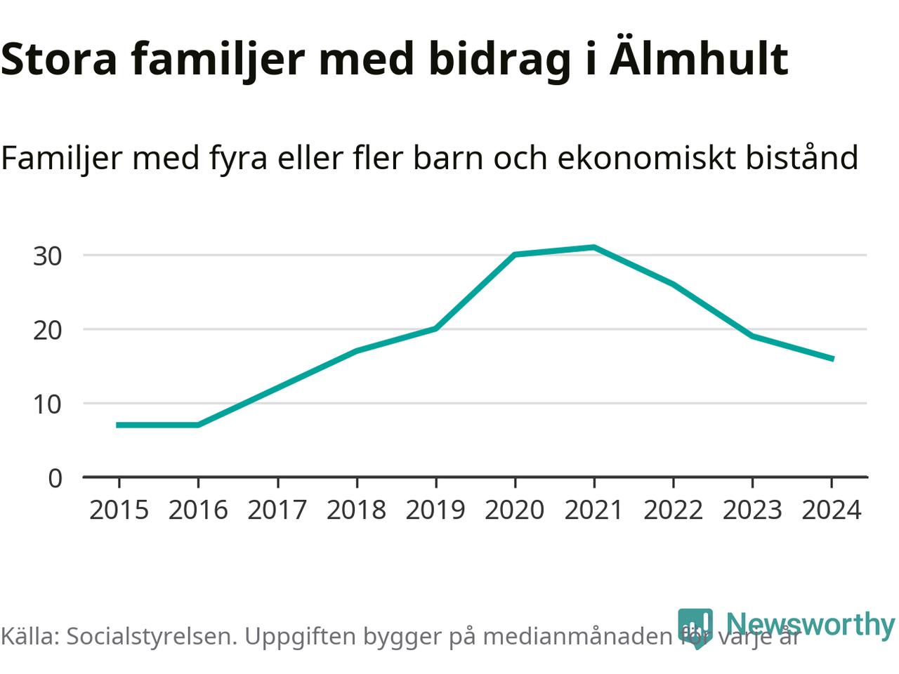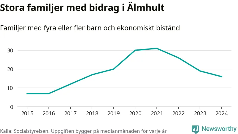 Älmhults kommun tillhör varken de kommuner där högst eller lägst andel av befolkningen som fick ekonomiskt bistånd i landet 2024. Sammanlagt 245 hushåll fick någon gång under året ekonomiskt bistånd, enligt Socialstyrelsens statistik. Av dem var några få barnfamiljer. Vi har inte siffror på hur många unika familjer med fyra barn eller fler det handlar om, men enligt Socialstyrelsens preliminära månadsstatistik betalades ekonomiskt bistånd ut till mellan 13 och 19 familjer per månad under fjolåret – i snitt 16 familjer.