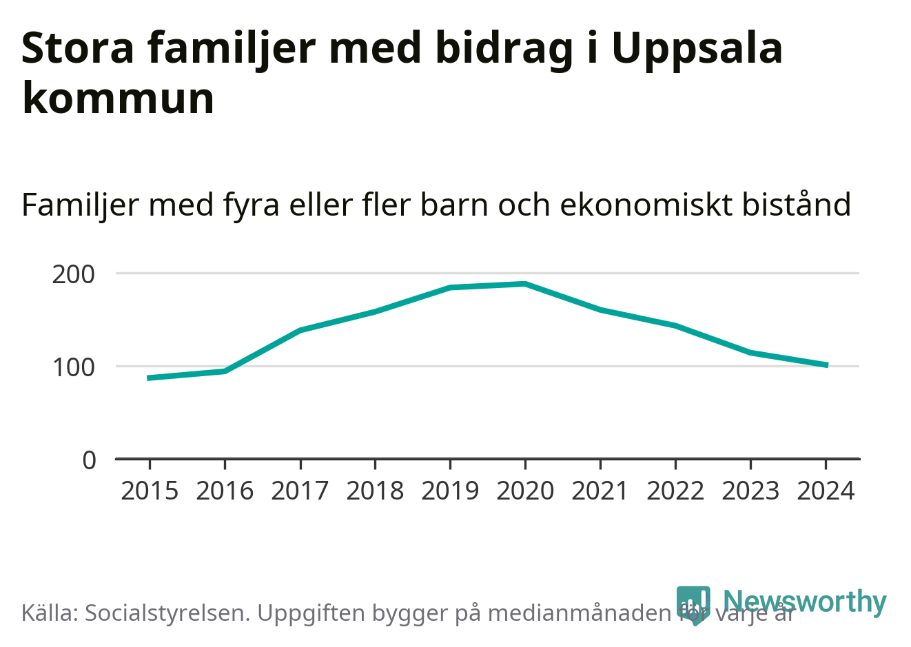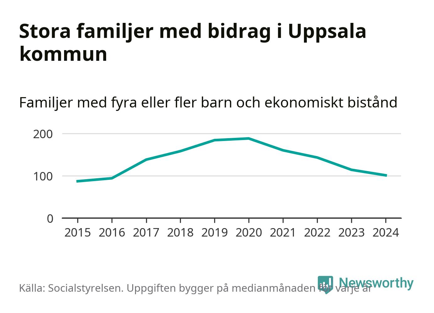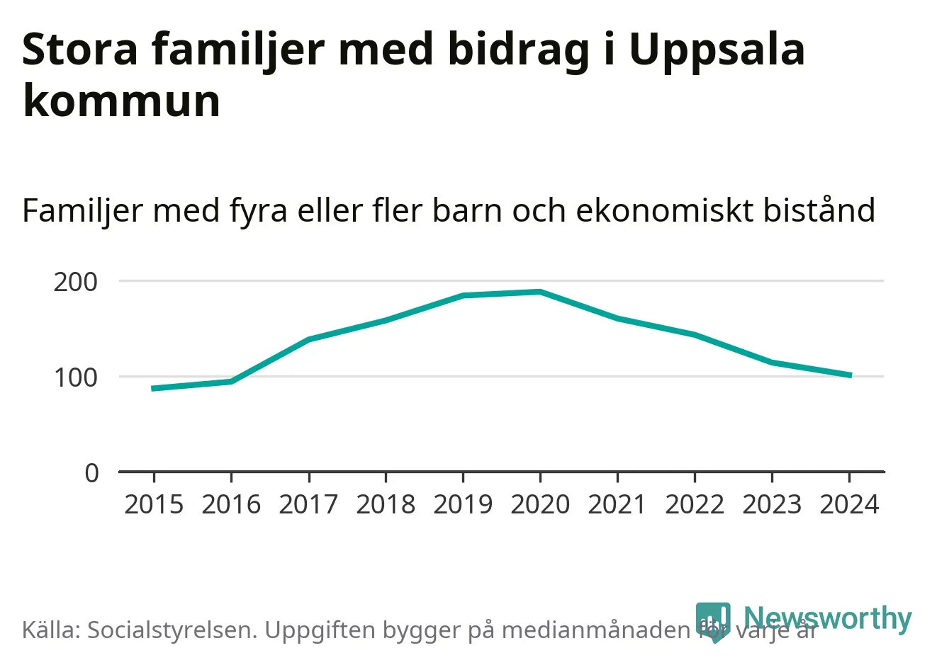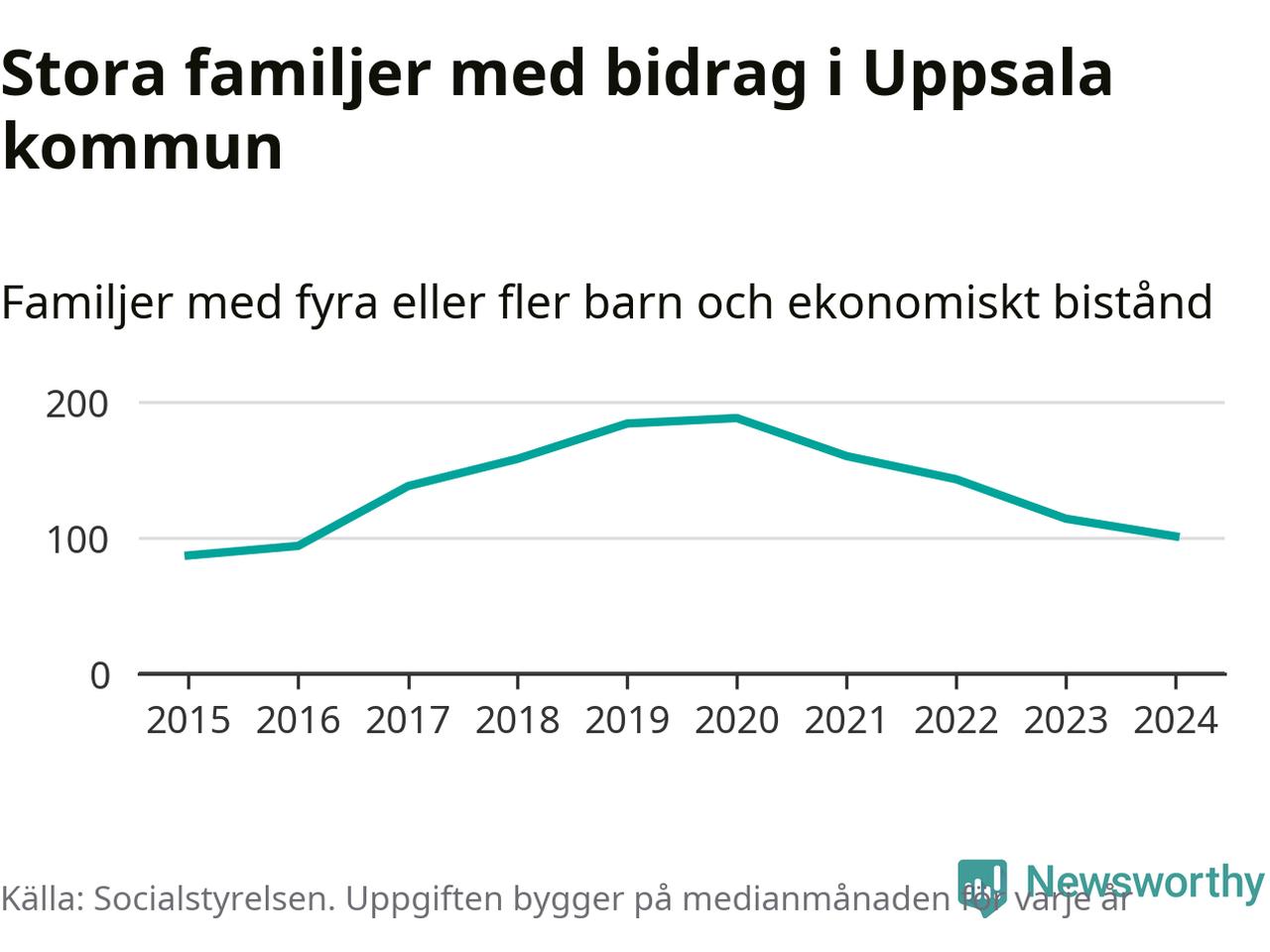 Uppsala kommun tillhör varken de kommuner där högst eller lägst andel av befolkningen som fick ekonomiskt bistånd i landet 2024. Sammanlagt 4 154 hushåll fick någon gång under året ekonomiskt bistånd, enligt Socialstyrelsens statistik. Av dem var 1 040 barnfamiljer. Vi har inte siffror på hur många unika familjer med fyra barn eller fler det handlar om, men enligt Socialstyrelsens preliminära månadsstatistik betalades ekonomiskt bistånd ut till mellan 96 och 104 familjer per månad under fjolåret – i snitt 101 familjer.