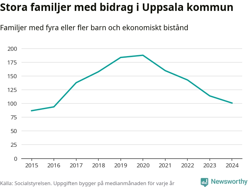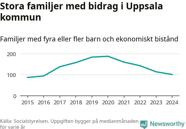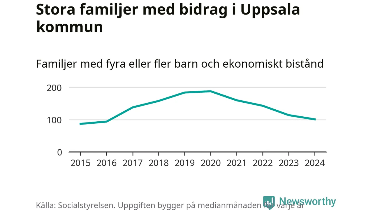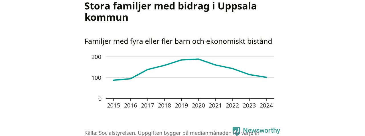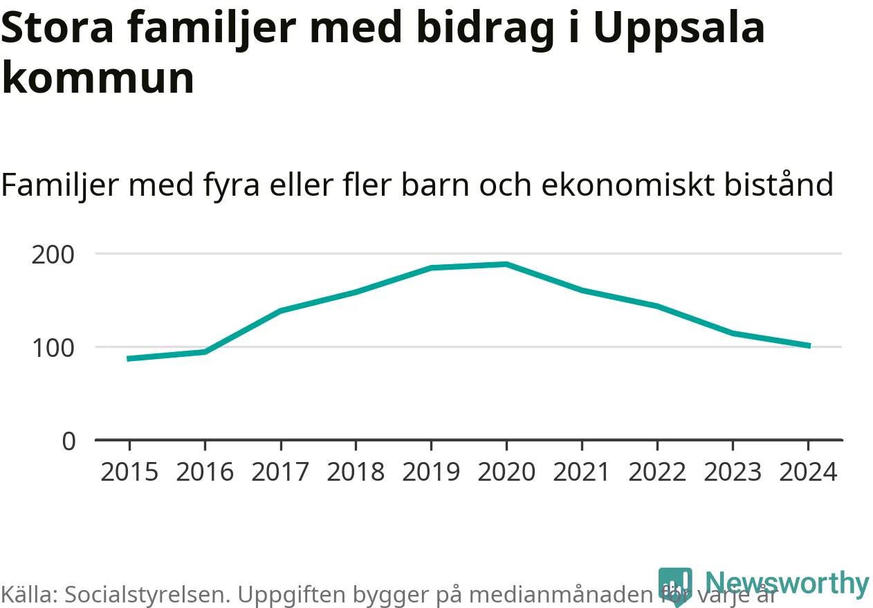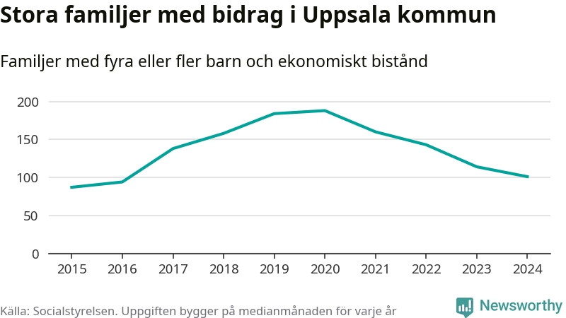 Uppsala kommun tillhör varken de kommuner där högst eller lägst andel av befolkningen som fick ekonomiskt bistånd i landet 2024. Sammanlagt 4 154 hushåll fick någon gång under året ekonomiskt bistånd, enligt Socialstyrelsens statistik. Av dem var 1 040 barnfamiljer. Vi har inte siffror på hur många unika familjer med fyra barn eller fler det handlar om, men enligt Socialstyrelsens preliminära månadsstatistik betalades ekonomiskt bistånd ut till mellan 96 och 104 familjer per månad under fjolåret – i snitt 101 familjer.