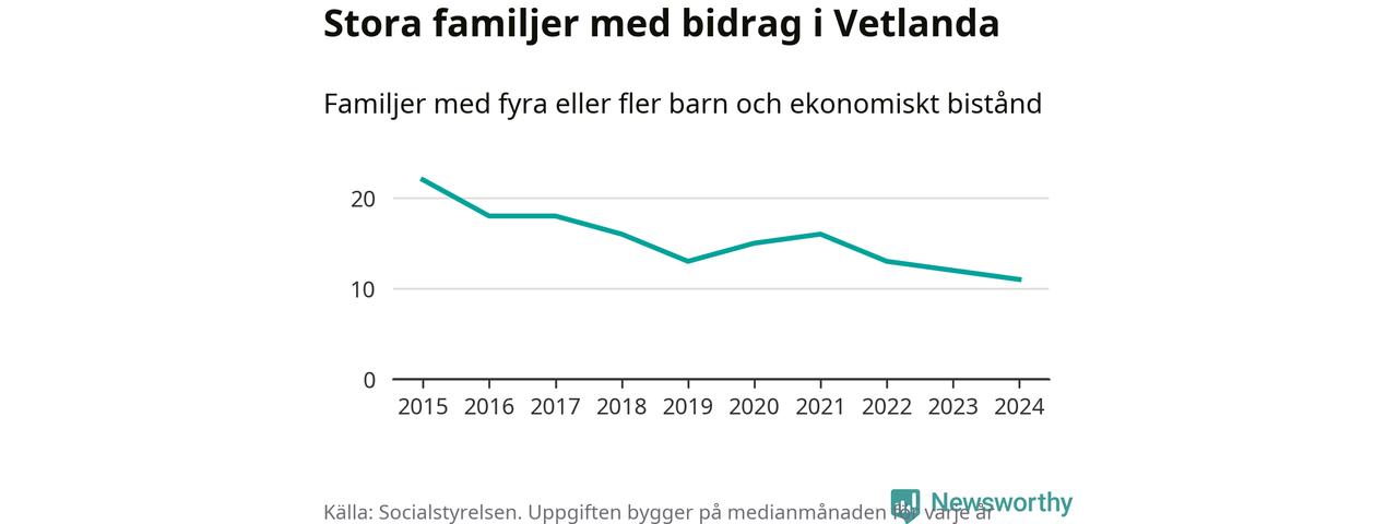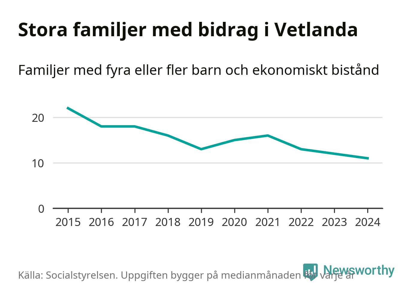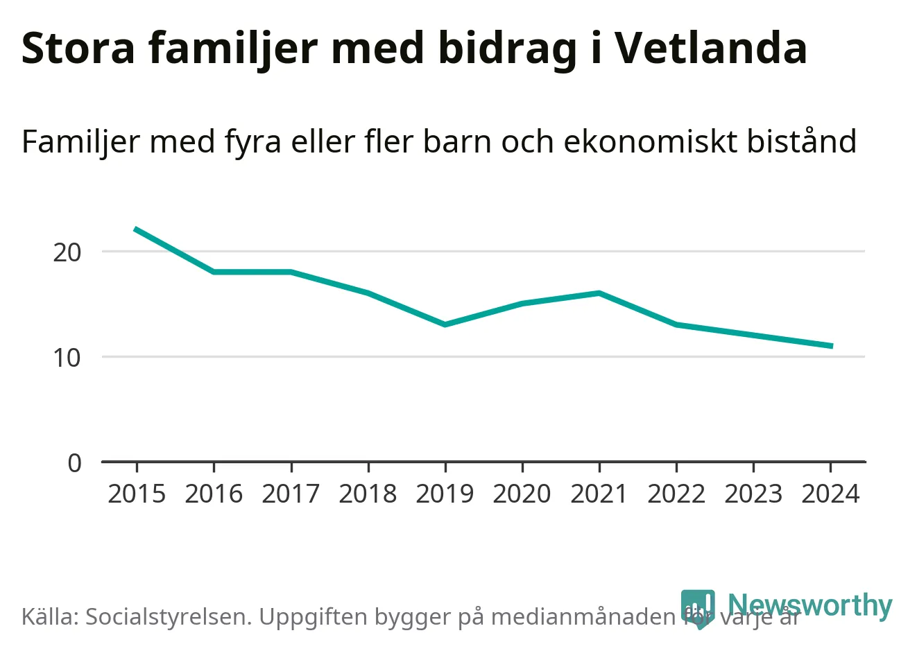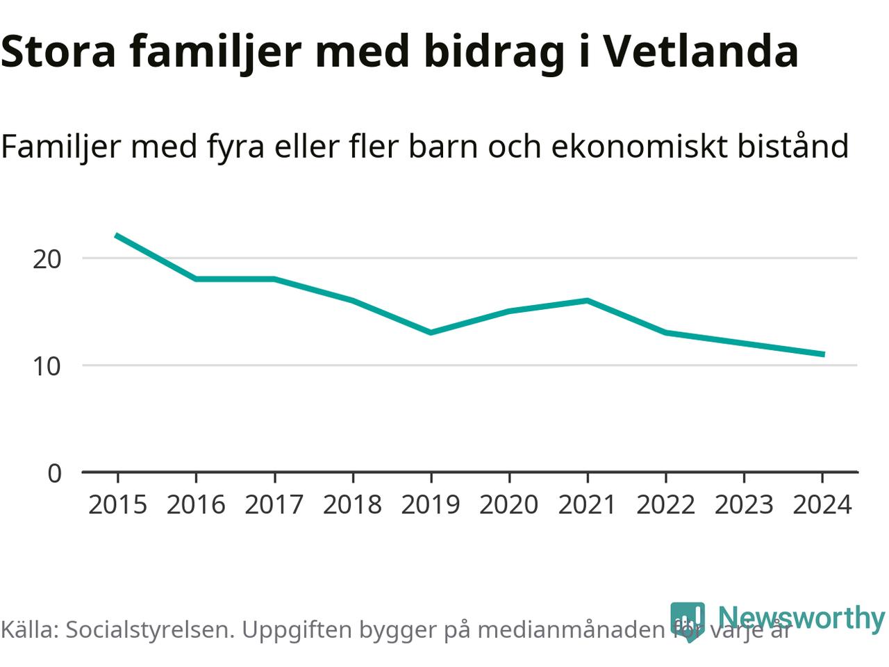 I Vetlanda kommun fick en högre andel av befolkningen ekonomiskt bistånd än de flesta andra kommuner i landet 2024. Sammanlagt 457 hushåll fick någon gång under året ekonomiskt bistånd, enligt Socialstyrelsens statistik. Av dem var 146 barnfamiljer. Vi har inte siffror på hur många unika familjer med fyra barn eller fler det handlar om, men enligt Socialstyrelsens preliminära månadsstatistik betalades ekonomiskt bistånd ut till mellan åtta och 14 familjer per månad under fjolåret – i snitt elva familjer.
