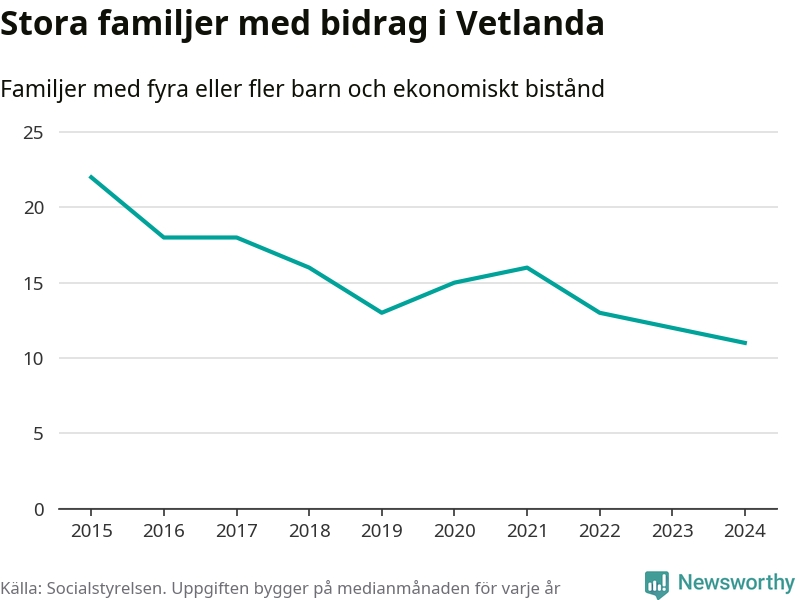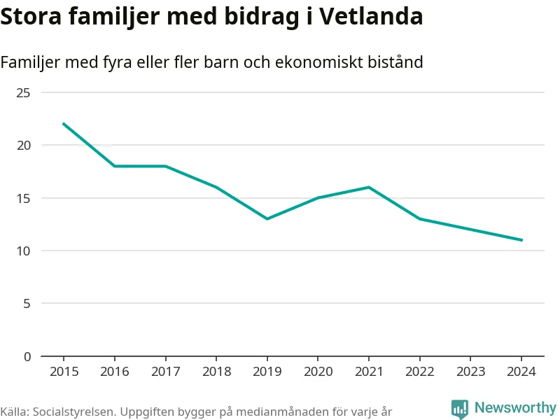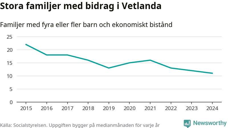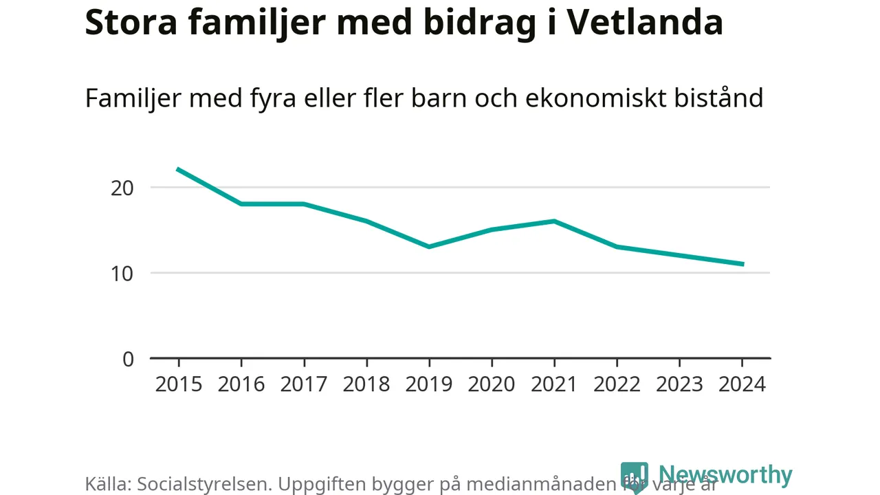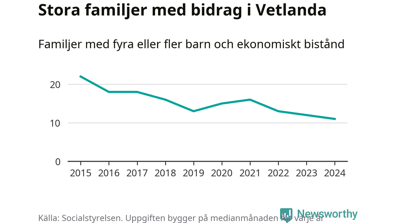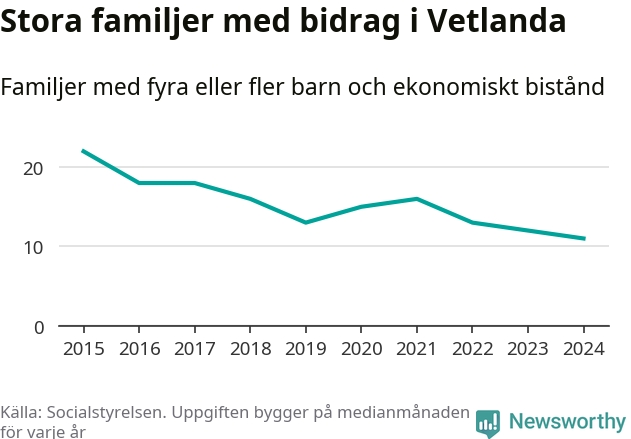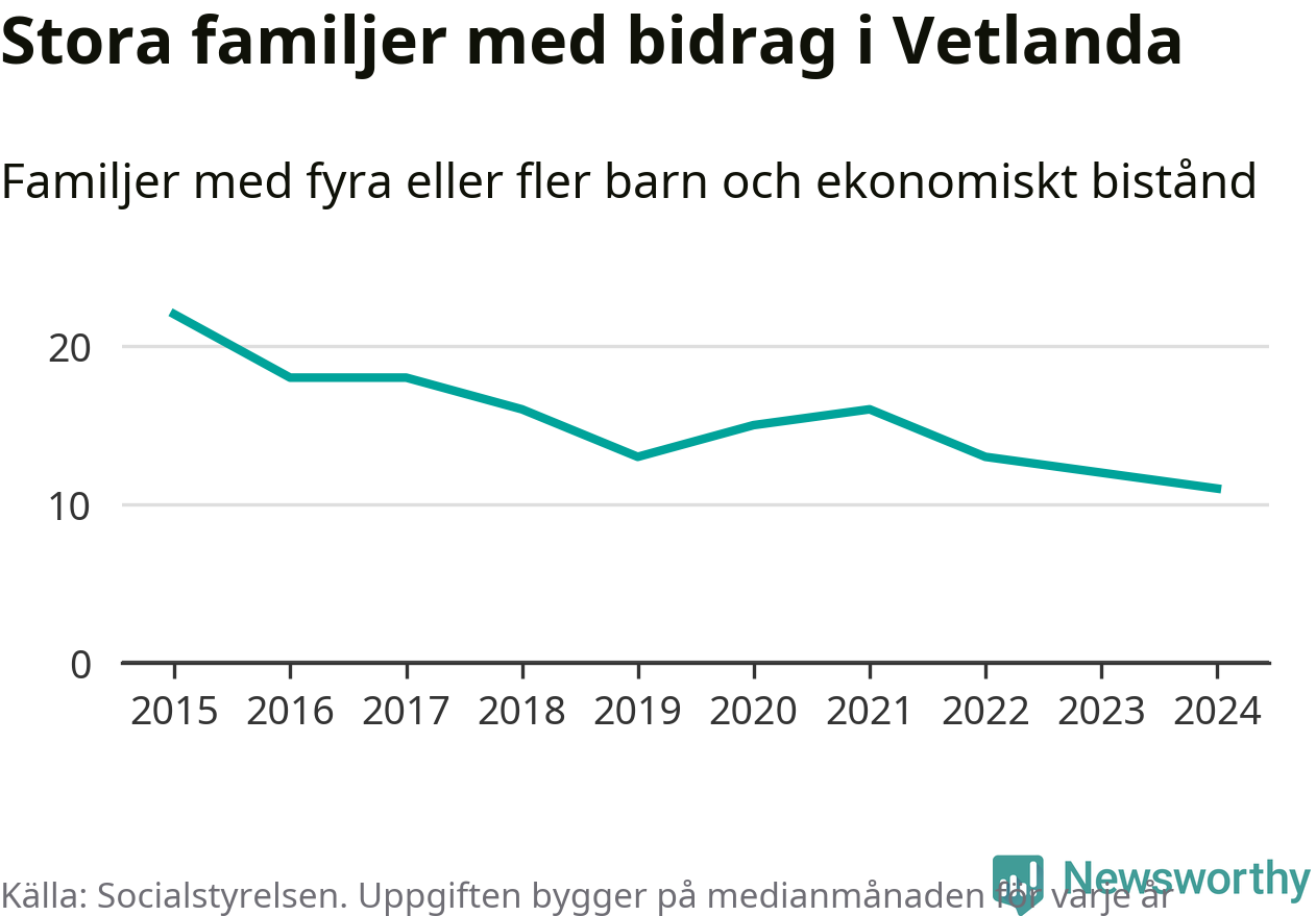 I Vetlanda kommun fick en högre andel av befolkningen ekonomiskt bistånd än de flesta andra kommuner i landet 2024. Sammanlagt 457 hushåll fick någon gång under året ekonomiskt bistånd, enligt Socialstyrelsens statistik. Av dem var 146 barnfamiljer. Vi har inte siffror på hur många unika familjer med fyra barn eller fler det handlar om, men enligt Socialstyrelsens preliminära månadsstatistik betalades ekonomiskt bistånd ut till mellan åtta och 14 familjer per månad under fjolåret – i snitt elva familjer.