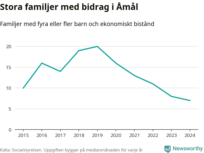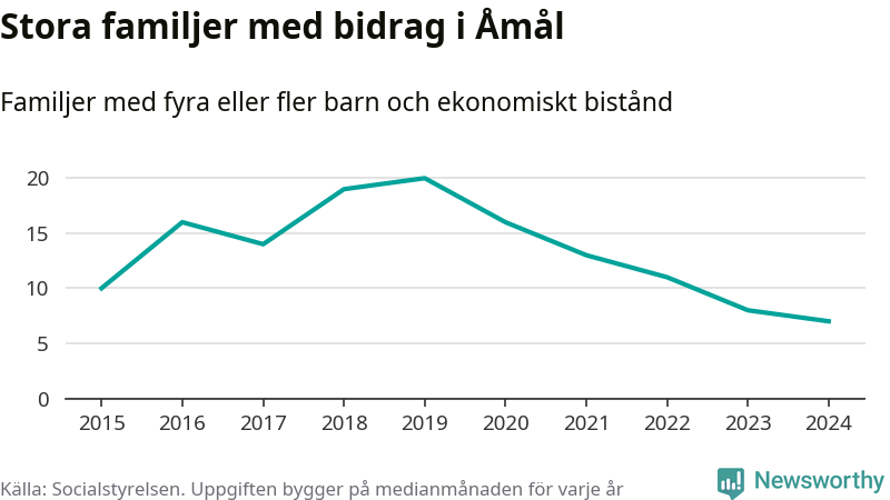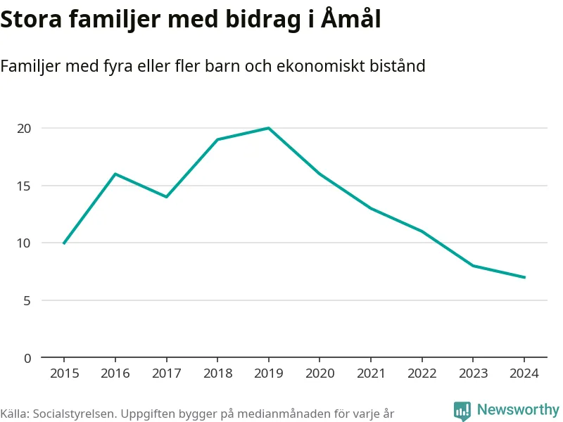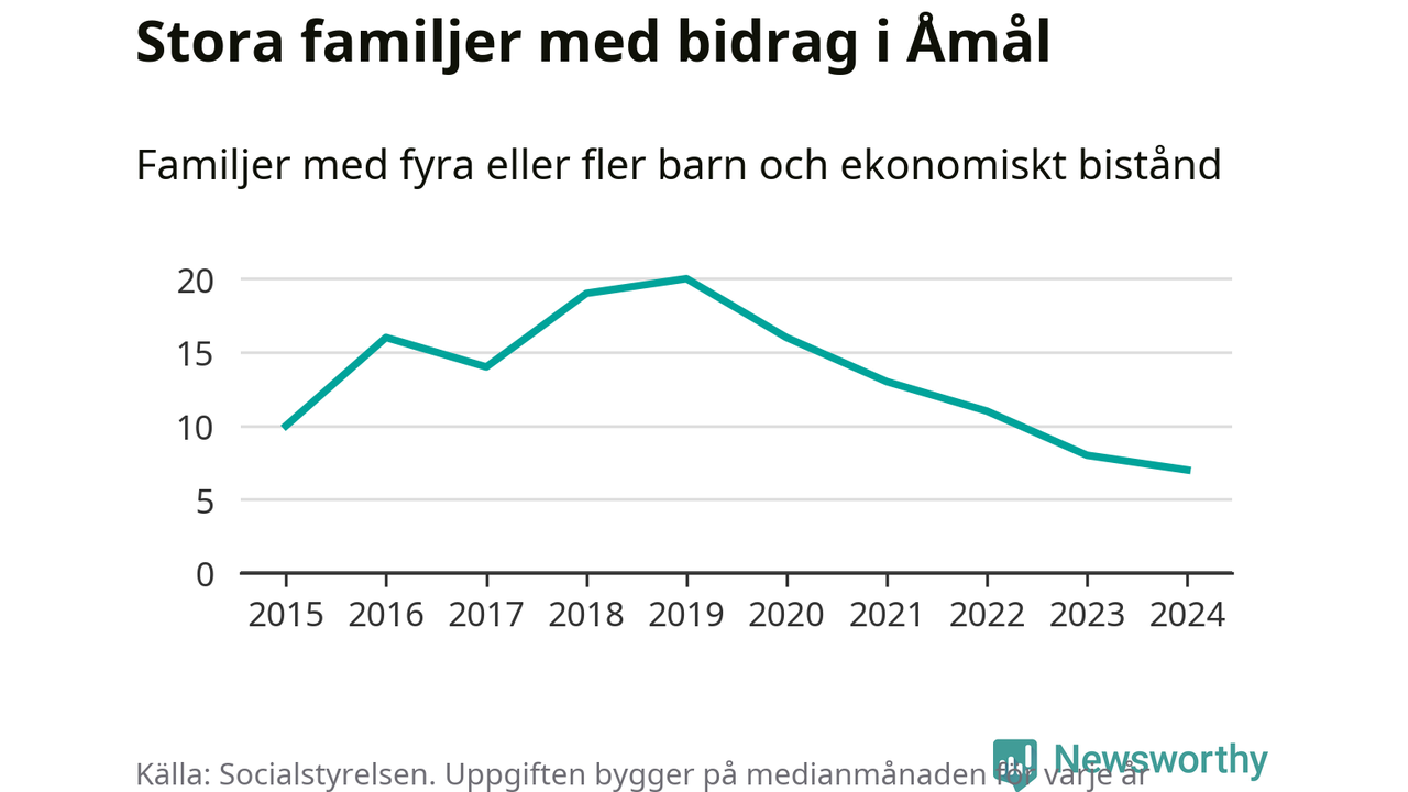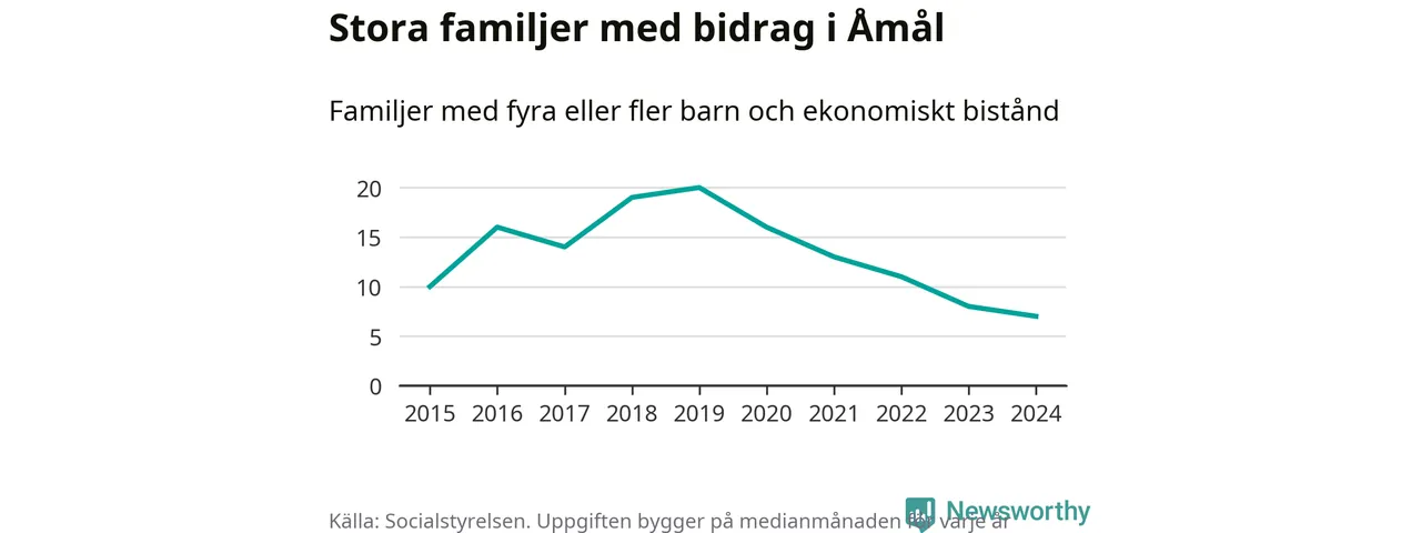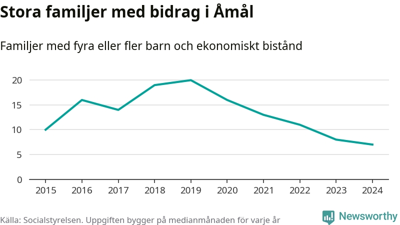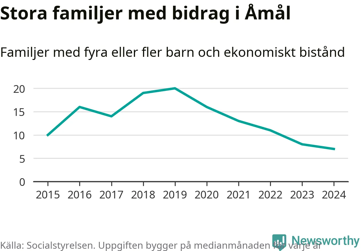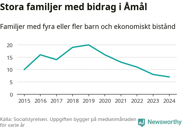 Åmåls kommun tillhör de kommuner i landet som har har högst andel av befolkningen som fick ekonomiskt bistånd 2024. Sammanlagt 276 hushåll fick någon gång under året ekonomiskt bistånd, enligt Socialstyrelsens statistik. Av dem var 93 barnfamiljer. Vi har inte siffror på hur många unika familjer med fyra barn eller fler det handlar om, men enligt Socialstyrelsens preliminära månadsstatistik betalades ekonomiskt bistånd ut till mellan sex och nio familjer per månad under fjolåret – i snitt sju familjer.