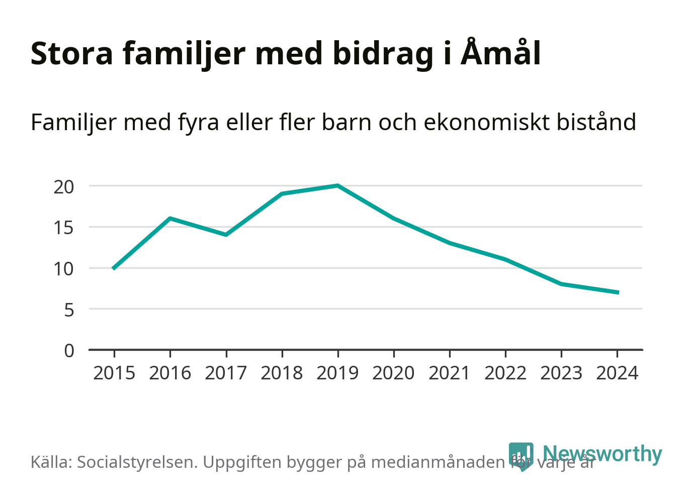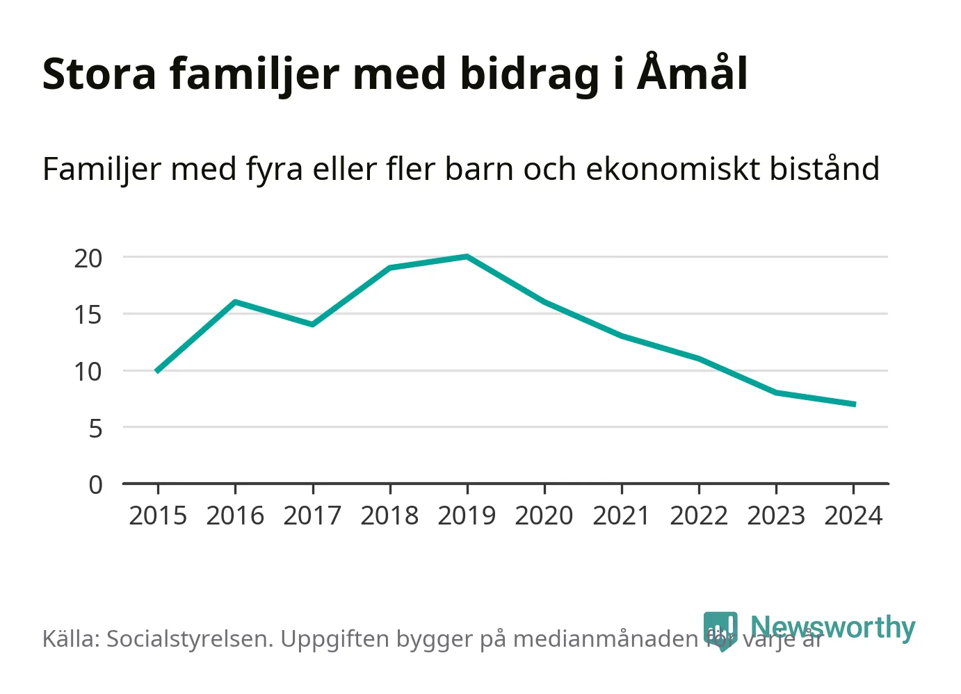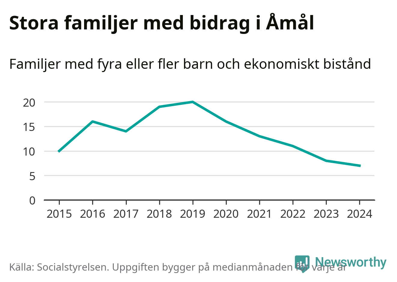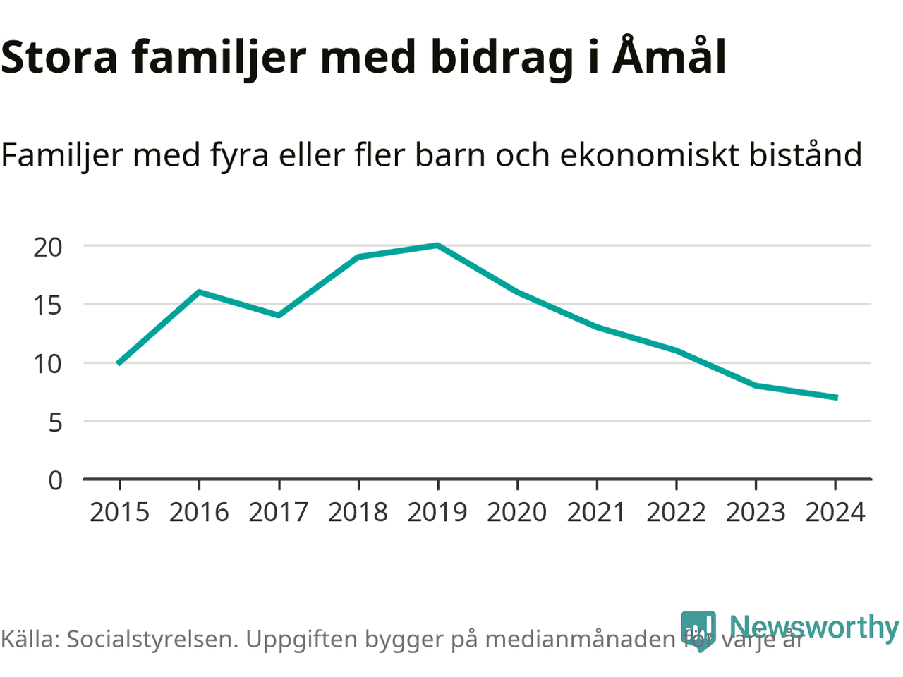 Det är den lägsta medianmånadssiffran i kommunen under de senaste tio åren. Året med högst snitt, 2019, var det 20 familjer.