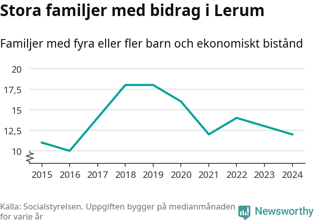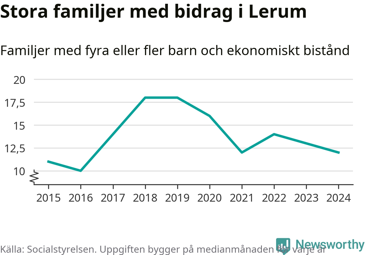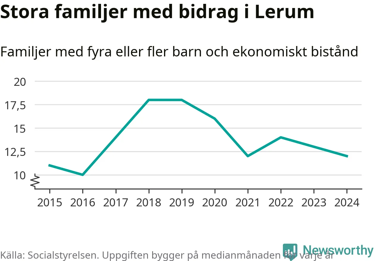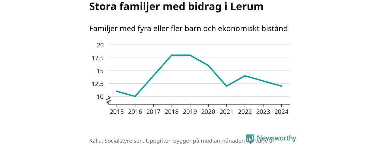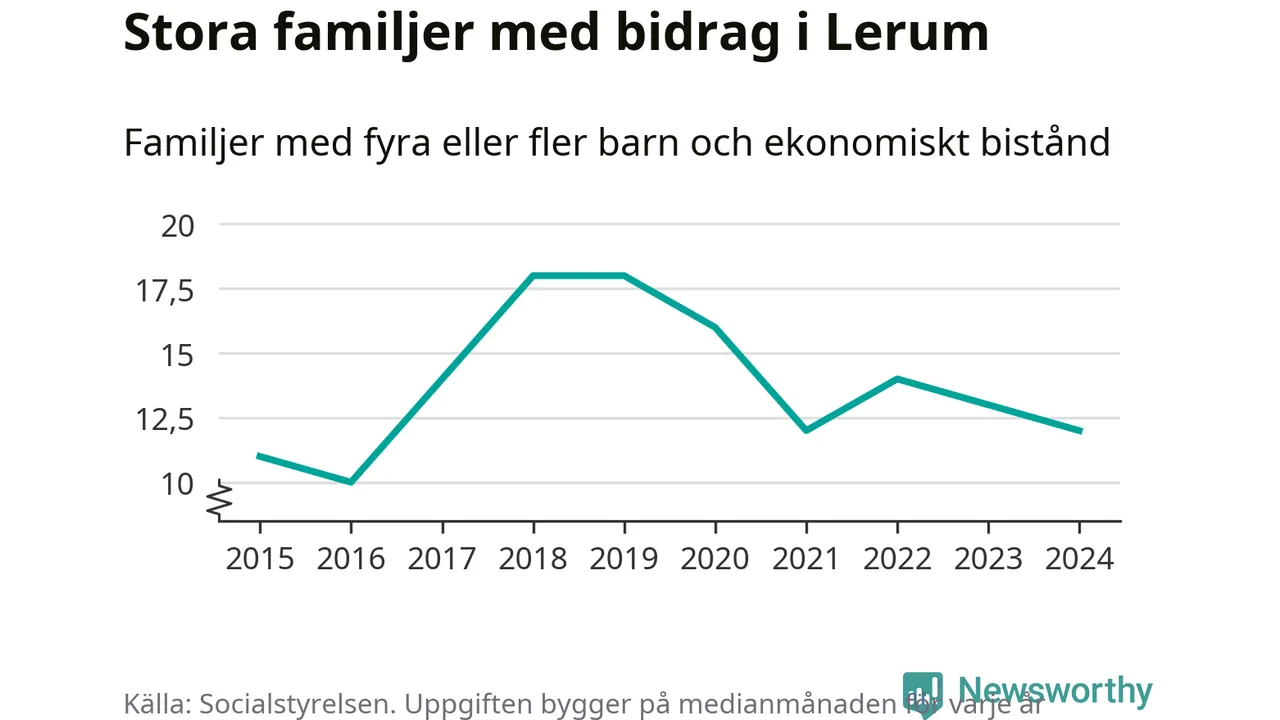 I Lerums kommun fick en lägre andel av befolkningen ekonomiskt bistånd än de flesta andra kommuner i landet 2024. Sammanlagt 357 hushåll fick någon gång under året ekonomiskt bistånd, enligt Socialstyrelsens statistik. Av dem var 94 barnfamiljer. Vi har inte siffror på hur många unika familjer med fyra barn eller fler det handlar om, men enligt Socialstyrelsens preliminära månadsstatistik betalades ekonomiskt bistånd ut till mellan någon eller några enstaka och 13 familjer per månad under fjolåret – i snitt tolv familjer.