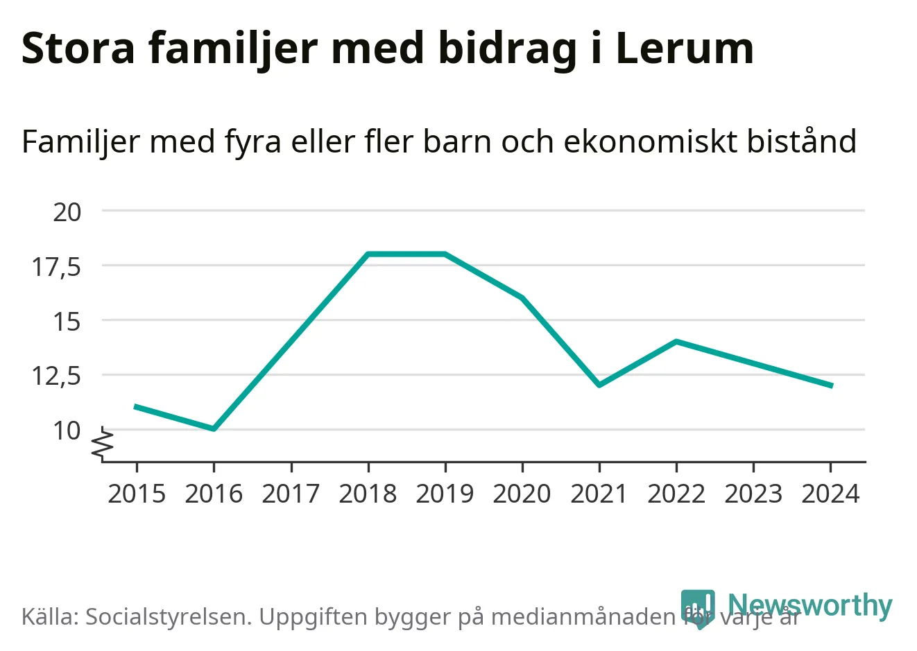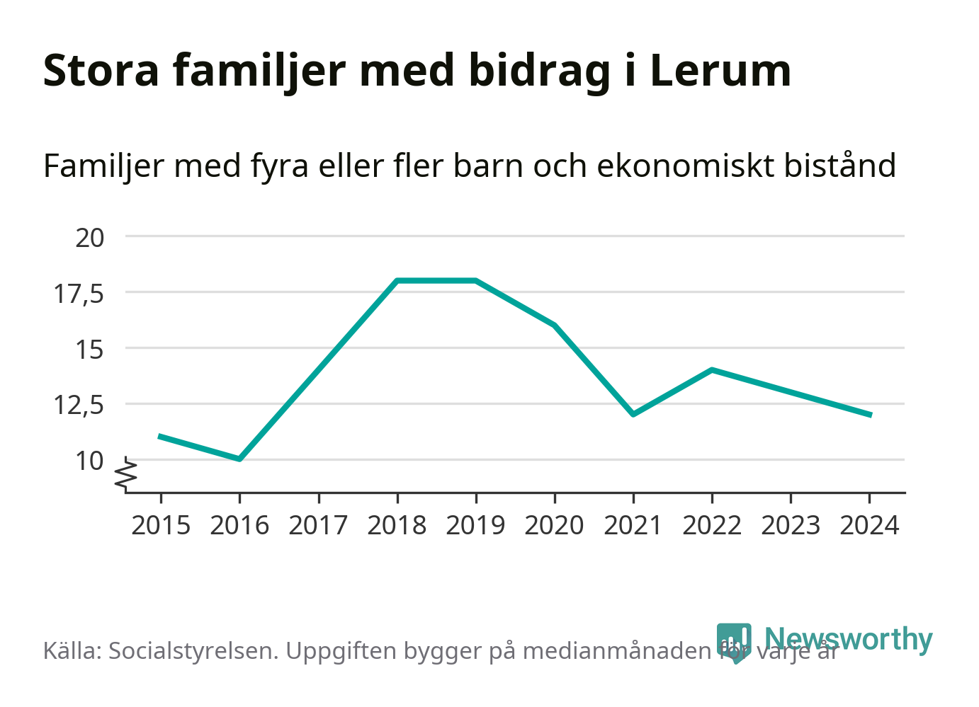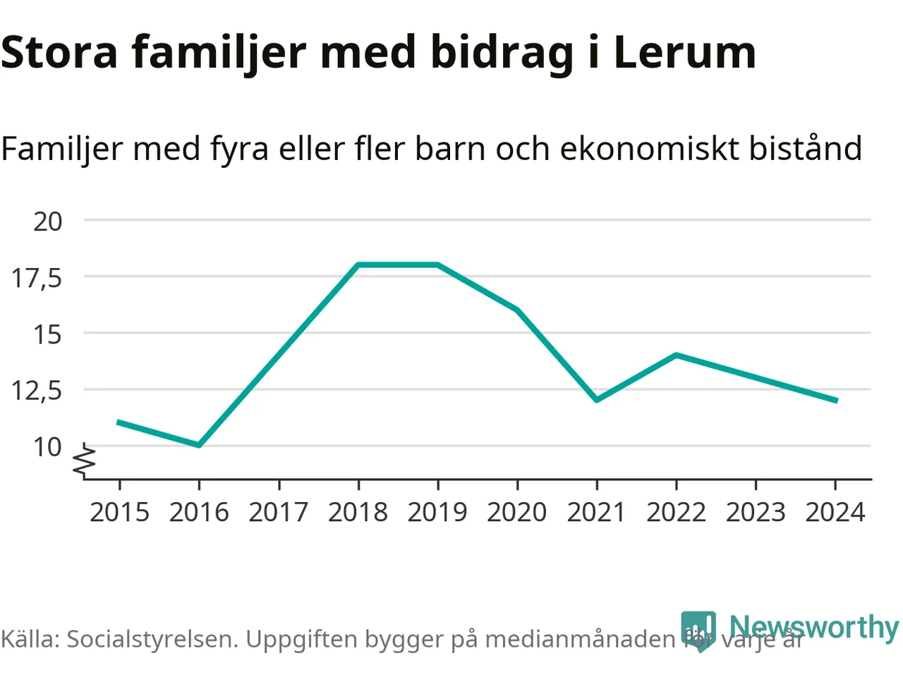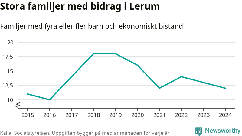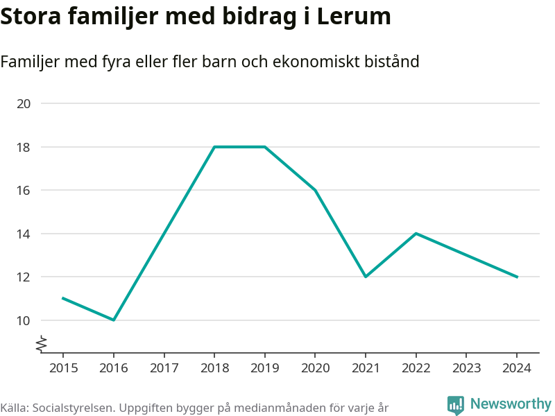 I Lerums kommun fick en lägre andel av befolkningen ekonomiskt bistånd än de flesta andra kommuner i landet 2024. Sammanlagt 357 hushåll fick någon gång under året ekonomiskt bistånd, enligt Socialstyrelsens statistik. Av dem var 94 barnfamiljer. Vi har inte siffror på hur många unika familjer med fyra barn eller fler det handlar om, men enligt Socialstyrelsens preliminära månadsstatistik betalades ekonomiskt bistånd ut till mellan någon eller några enstaka och 13 familjer per månad under fjolåret – i snitt tolv familjer.