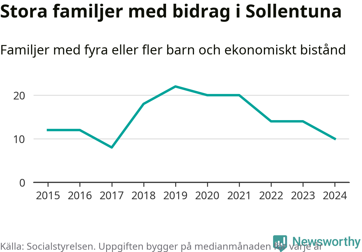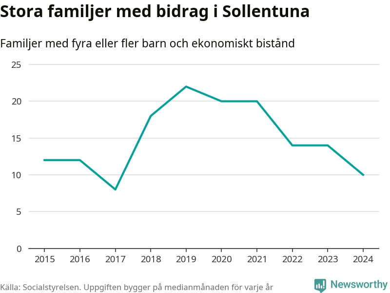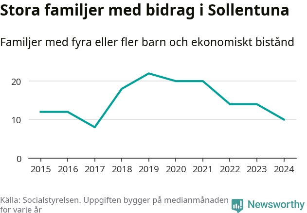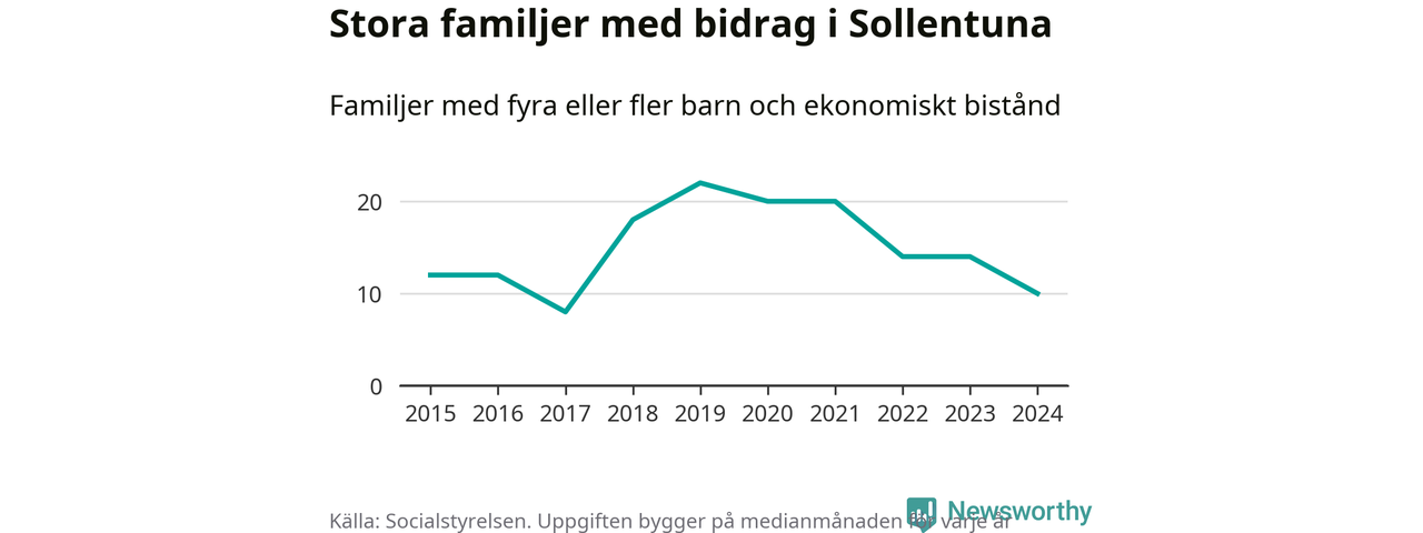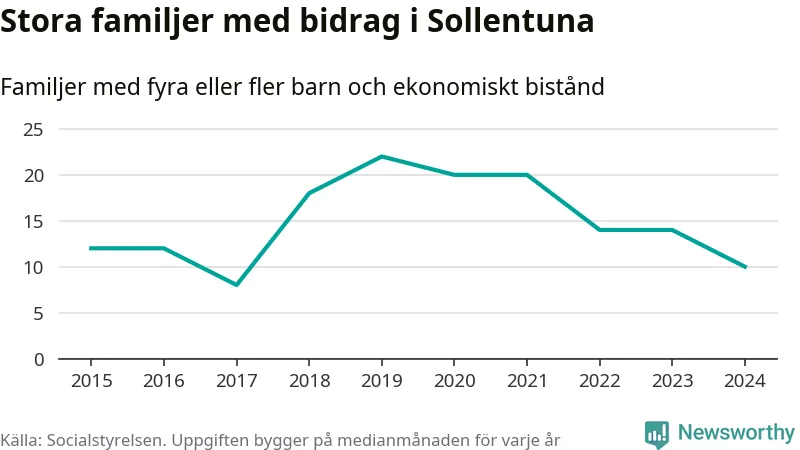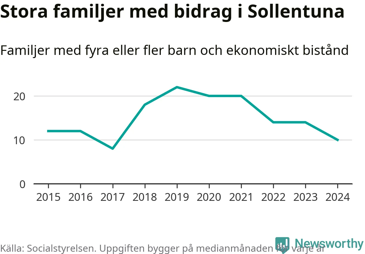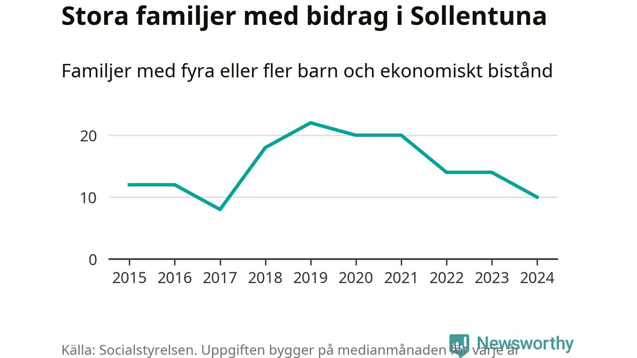I Sollentuna kommun fick en lägre andel av befolkningen ekonomiskt bistånd än de flesta andra kommuner i landet 2024. Sammanlagt 652 hushåll fick någon gång under året ekonomiskt bistånd, enligt Socialstyrelsens statistik. Av dem var 130 barnfamiljer. Vi har inte siffror på hur många unika familjer med fyra barn eller fler det handlar om, men enligt Socialstyrelsens preliminära månadsstatistik betalades ekonomiskt bistånd ut till mellan åtta och 14 familjer per månad under fjolåret – i snitt tio familjer.