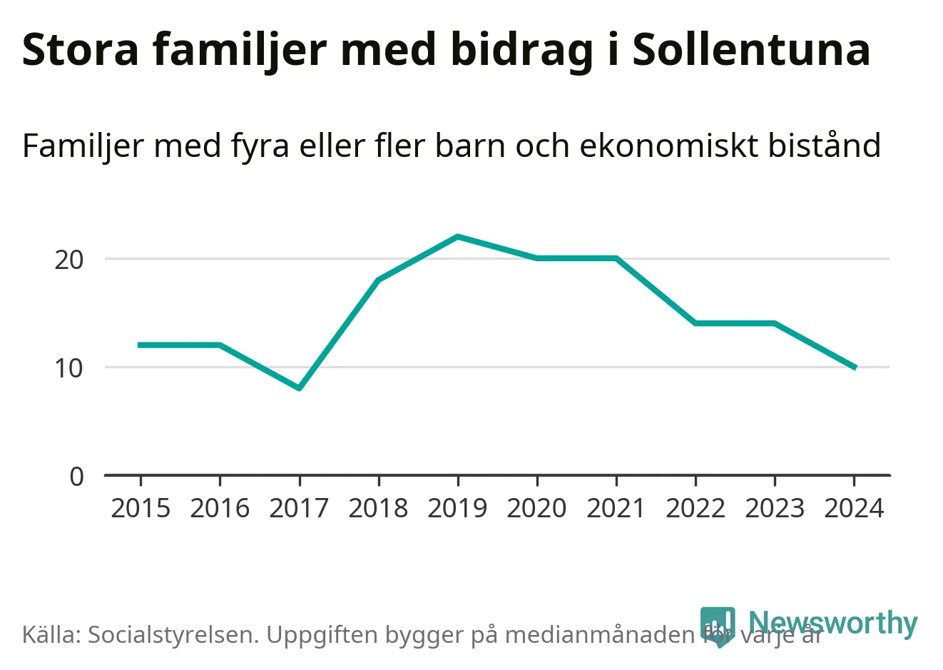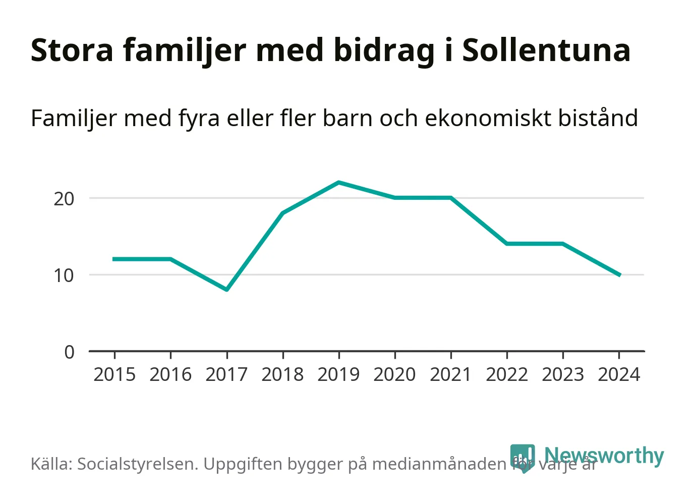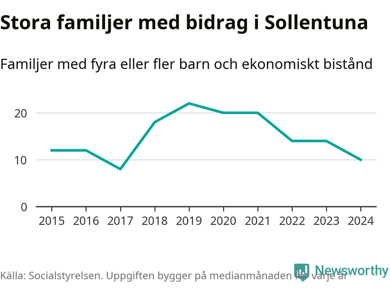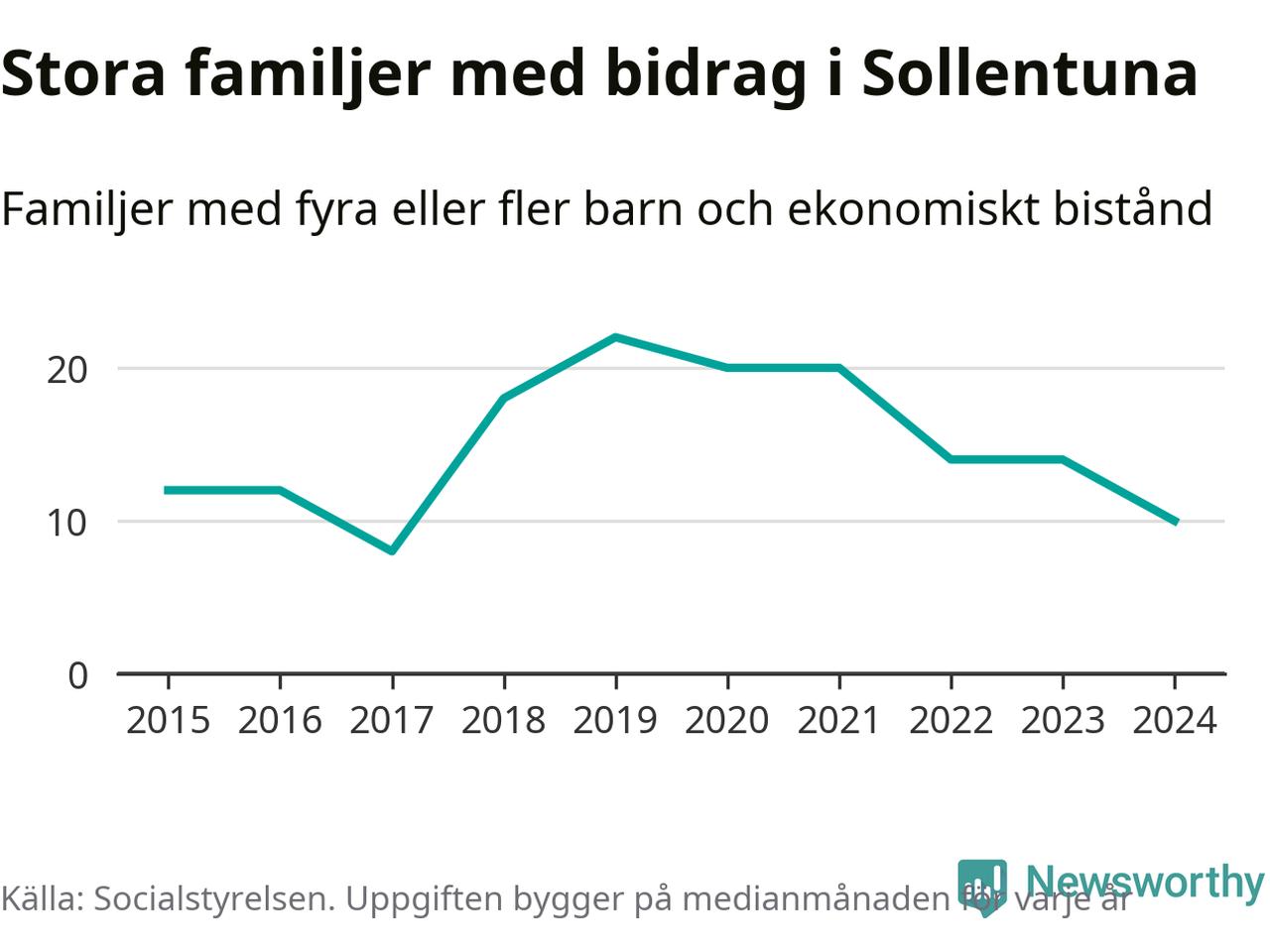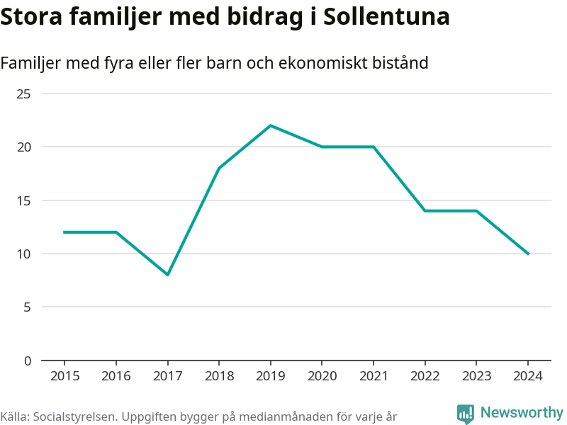 I Sollentuna kommun fick en lägre andel av befolkningen ekonomiskt bistånd än de flesta andra kommuner i landet 2024. Sammanlagt 652 hushåll fick någon gång under året ekonomiskt bistånd, enligt Socialstyrelsens statistik. Av dem var 130 barnfamiljer. Vi har inte siffror på hur många unika familjer med fyra barn eller fler det handlar om, men enligt Socialstyrelsens preliminära månadsstatistik betalades ekonomiskt bistånd ut till mellan åtta och 14 familjer per månad under fjolåret – i snitt tio familjer.