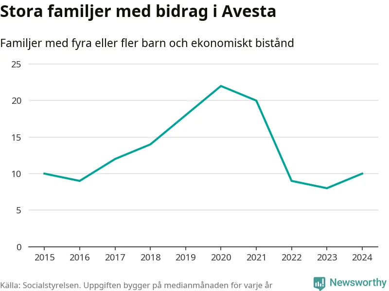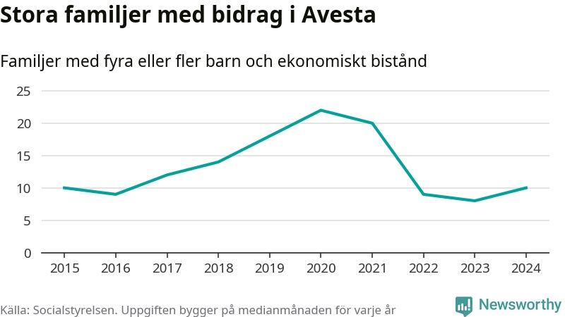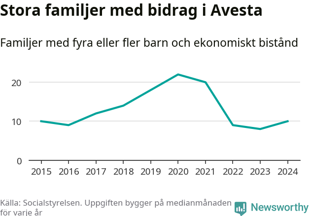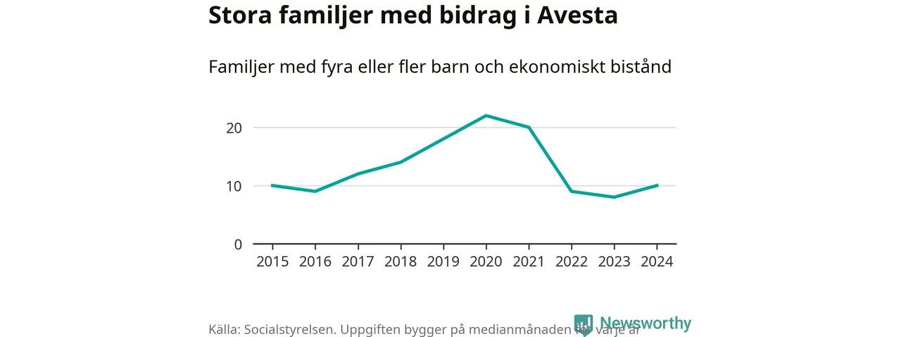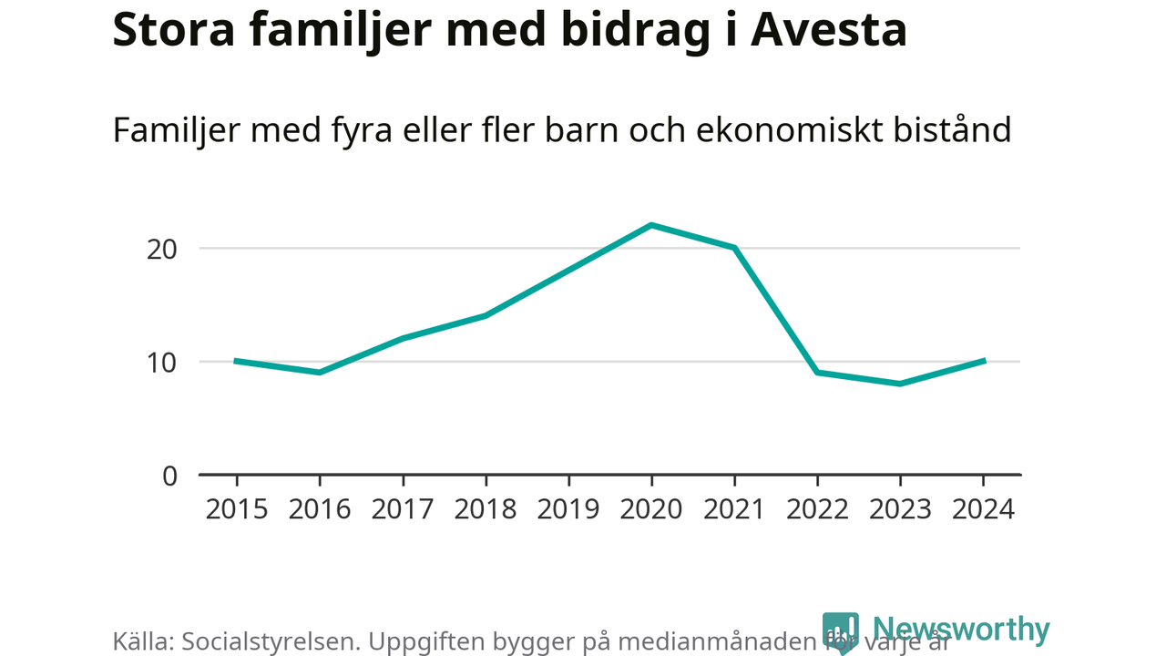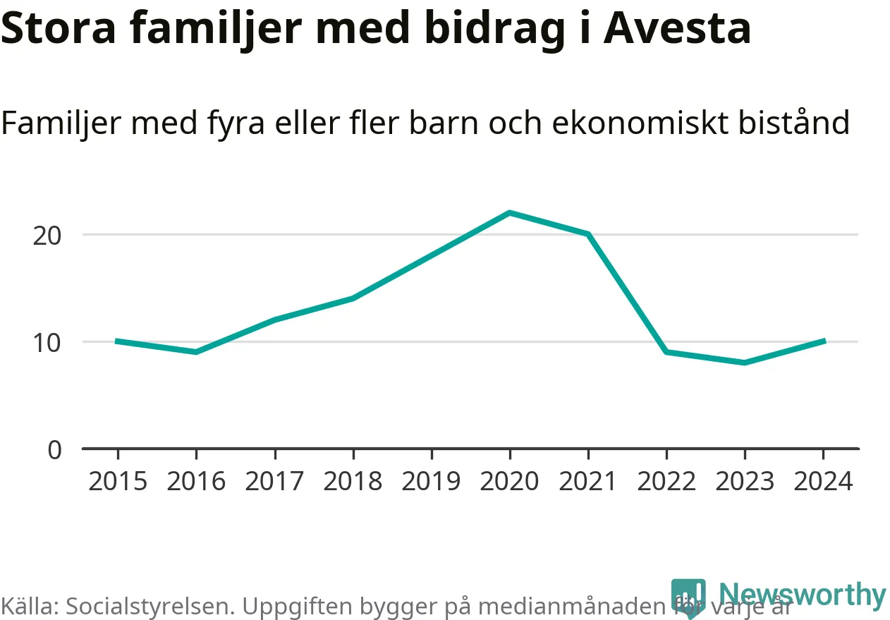 I Avesta kommun fick en högre andel av befolkningen ekonomiskt bistånd än de flesta andra kommuner i landet 2024. Sammanlagt 488 hushåll fick någon gång under året ekonomiskt bistånd, enligt Socialstyrelsens statistik. Av dem var 152 barnfamiljer. Vi har inte siffror på hur många unika familjer med fyra barn eller fler det handlar om, men enligt Socialstyrelsens preliminära månadsstatistik betalades ekonomiskt bistånd ut till mellan sju och tolv familjer per månad under fjolåret – i snitt elva familjer.