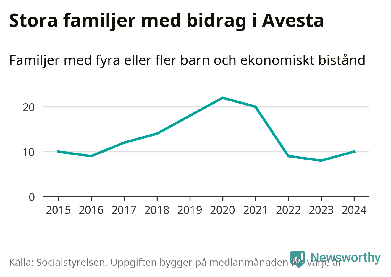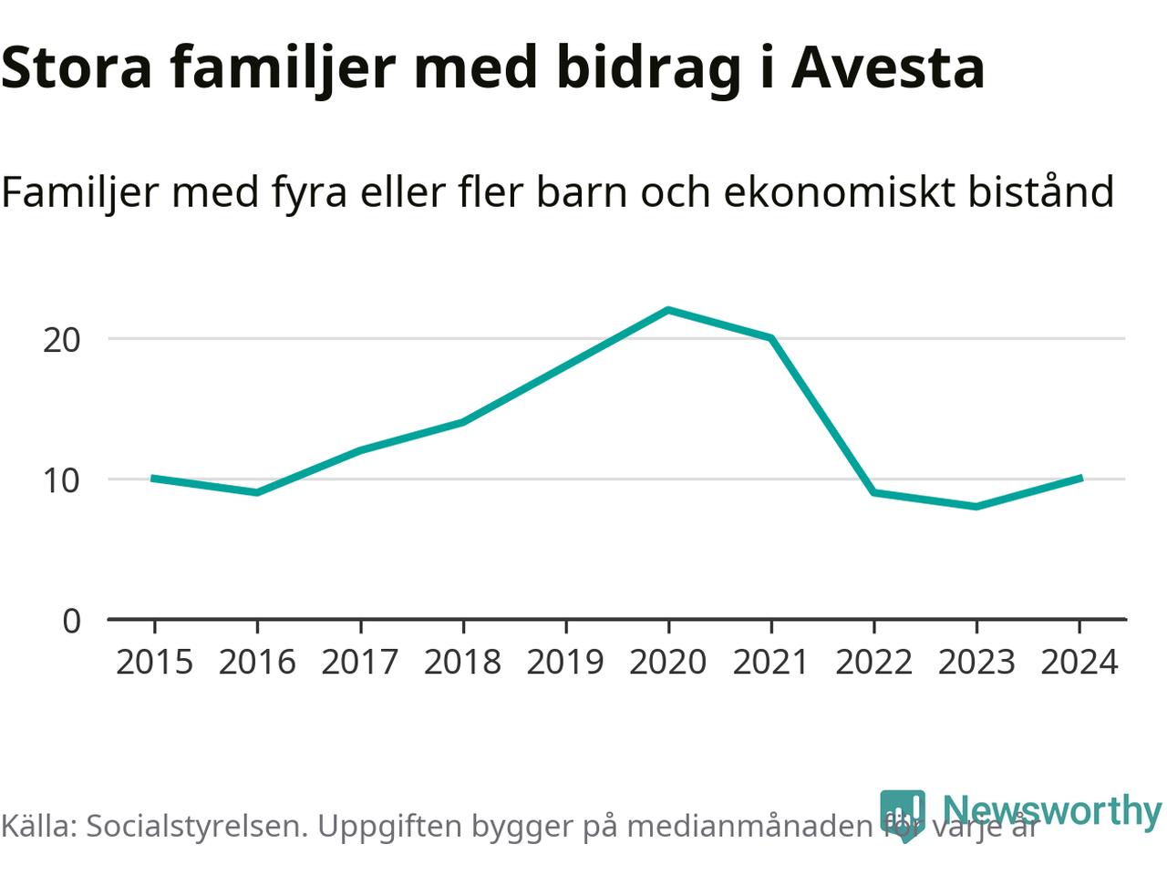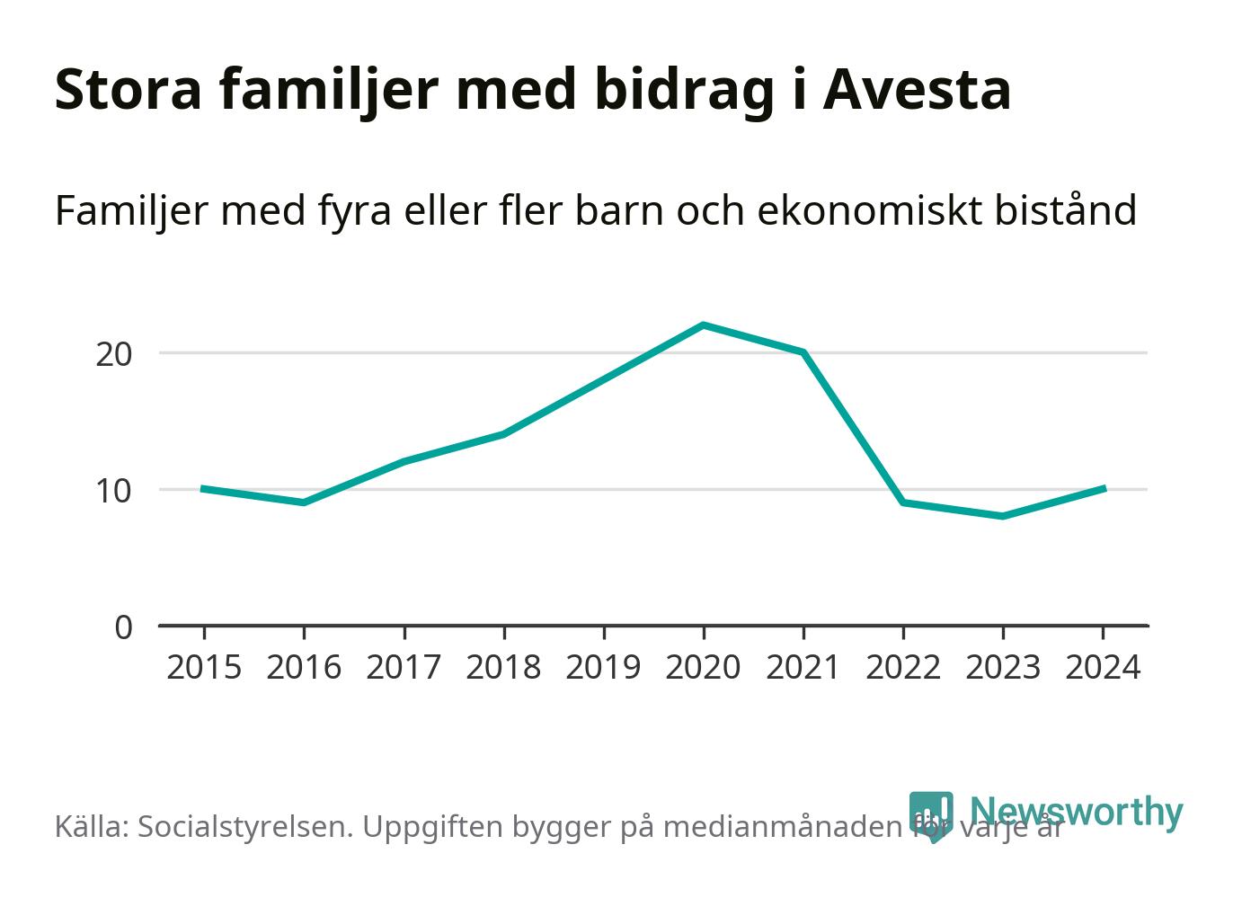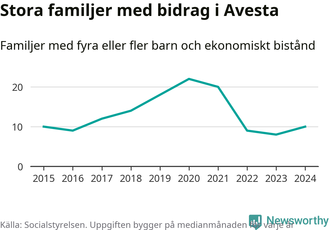 I Avesta kommun fick en högre andel av befolkningen ekonomiskt bistånd än de flesta andra kommuner i landet 2024. Sammanlagt 488 hushåll fick någon gång under året ekonomiskt bistånd, enligt Socialstyrelsens statistik. Av dem var 152 barnfamiljer. Vi har inte siffror på hur många unika familjer med fyra barn eller fler det handlar om, men enligt Socialstyrelsens preliminära månadsstatistik betalades ekonomiskt bistånd ut till mellan sju och tolv familjer per månad under fjolåret – i snitt elva familjer.