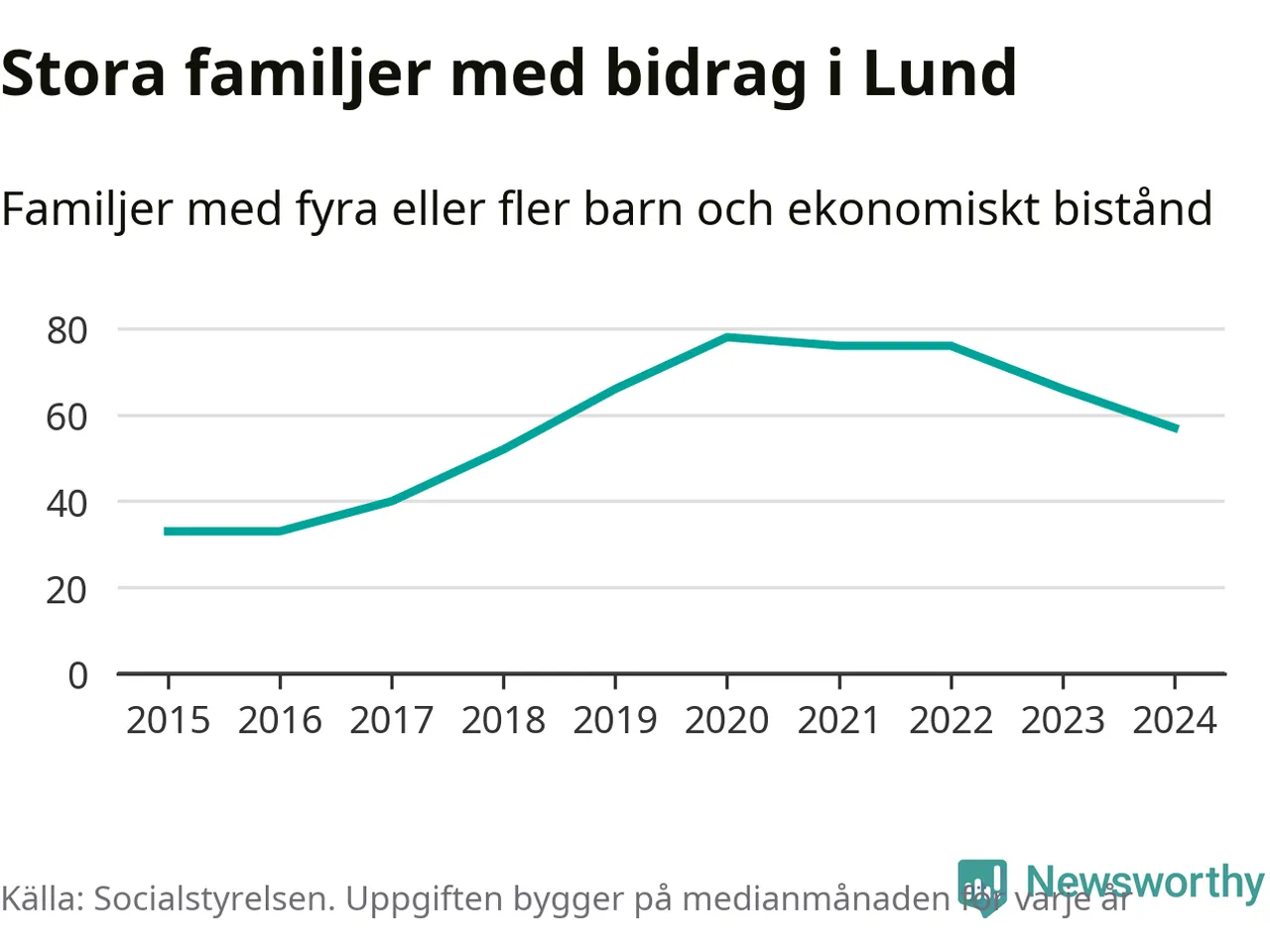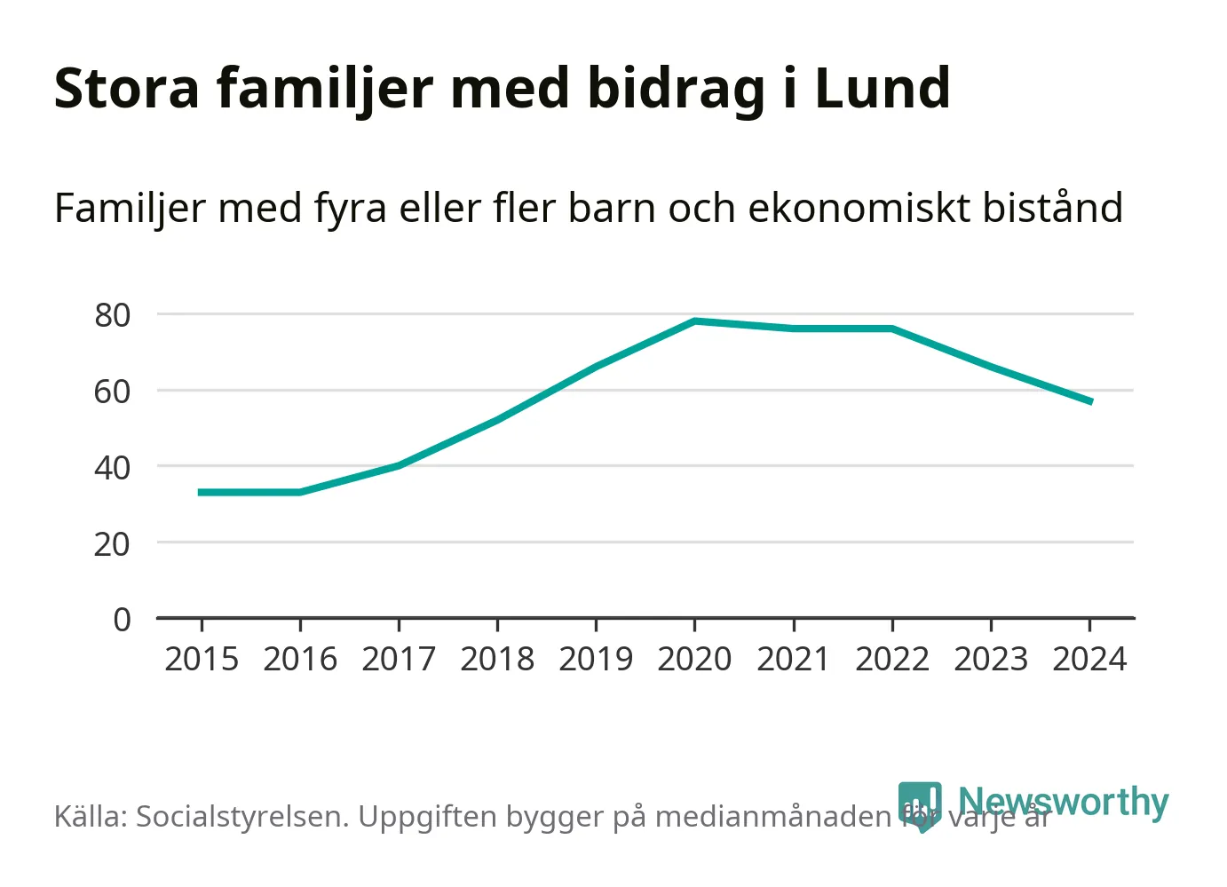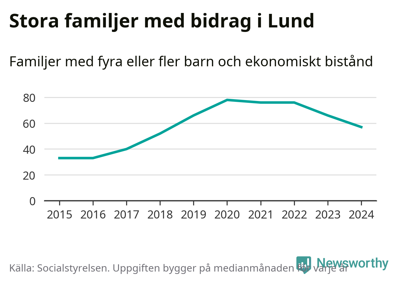 Lunds kommun tillhör varken de kommuner där högst eller lägst andel av befolkningen som fick ekonomiskt bistånd i landet 2024. Sammanlagt 1 745 hushåll fick någon gång under året ekonomiskt bistånd, enligt Socialstyrelsens statistik. Av dem var 466 barnfamiljer. Vi har inte siffror på hur många unika familjer med fyra barn eller fler det handlar om, men enligt Socialstyrelsens preliminära månadsstatistik betalades ekonomiskt bistånd ut till mellan 52 och 61 familjer per månad under fjolåret – i snitt 57 familjer.