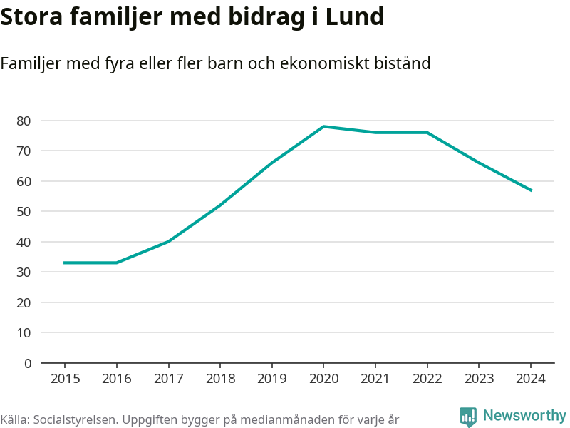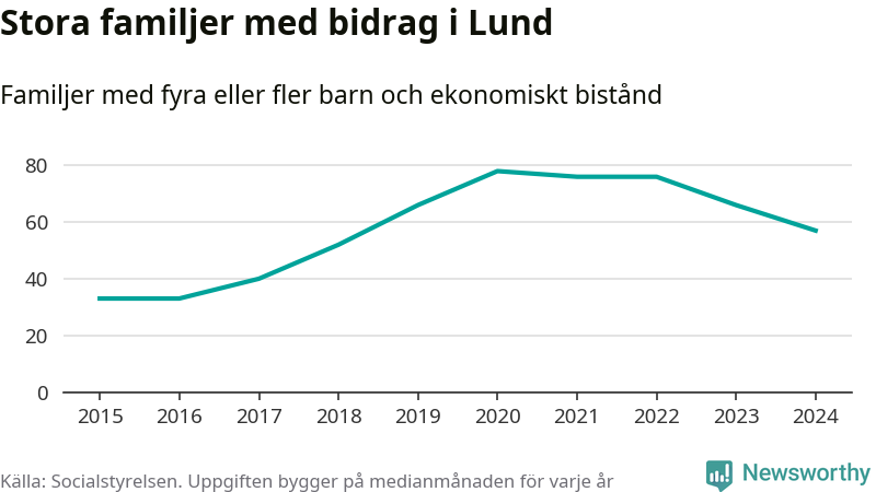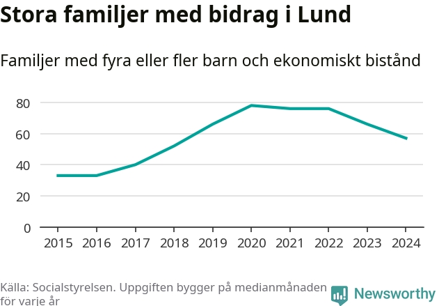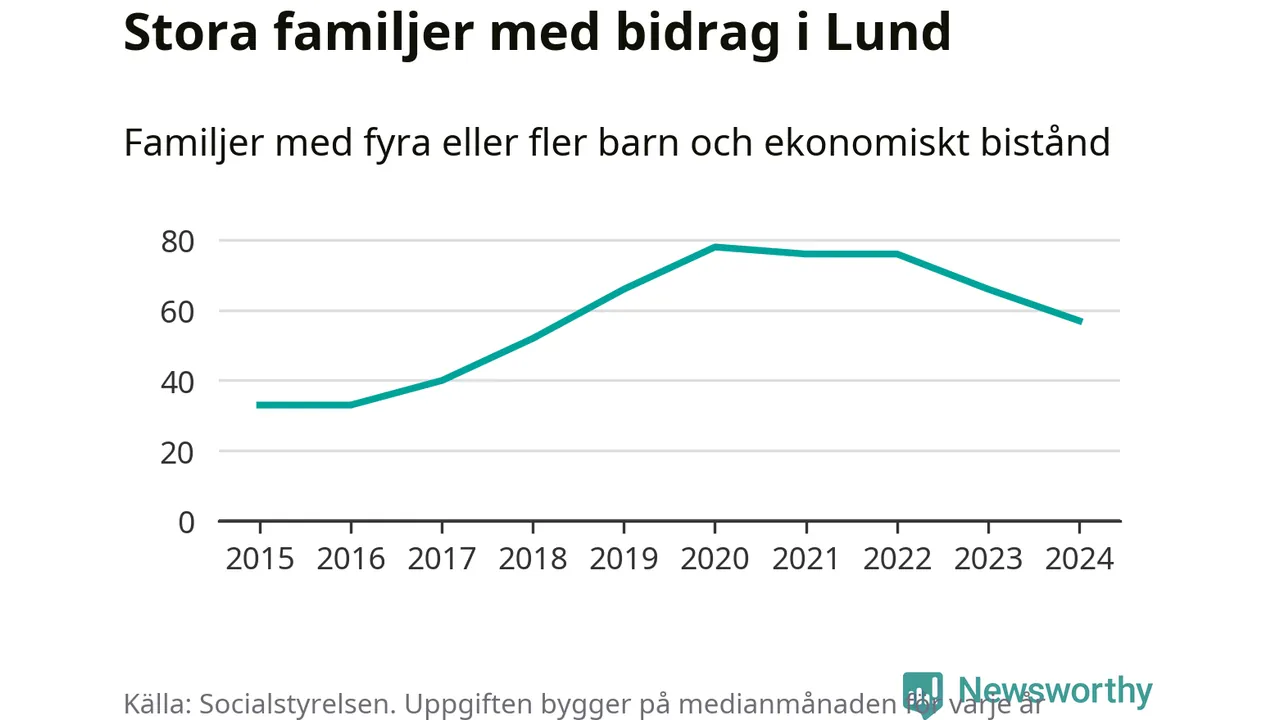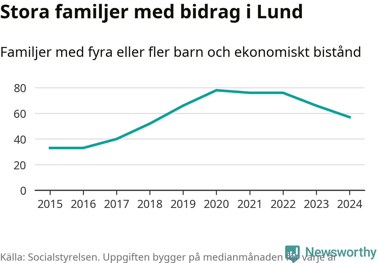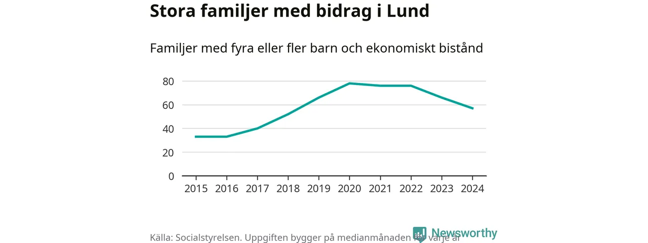 Lunds kommun tillhör varken de kommuner där högst eller lägst andel av befolkningen som fick ekonomiskt bistånd i landet 2024. Sammanlagt 1 745 hushåll fick någon gång under året ekonomiskt bistånd, enligt Socialstyrelsens statistik. Av dem var 466 barnfamiljer. Vi har inte siffror på hur många unika familjer med fyra barn eller fler det handlar om, men enligt Socialstyrelsens preliminära månadsstatistik betalades ekonomiskt bistånd ut till mellan 52 och 61 familjer per månad under fjolåret – i snitt 57 familjer.
