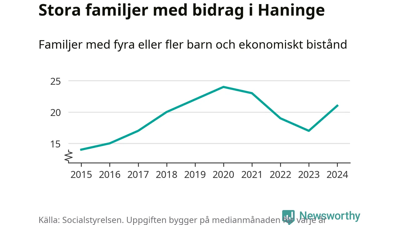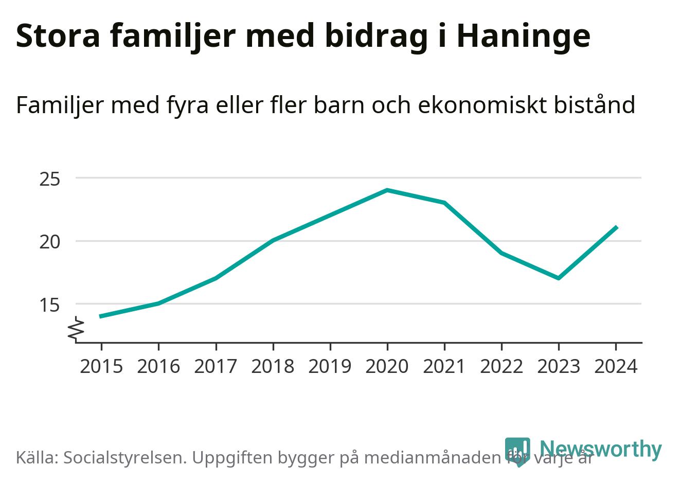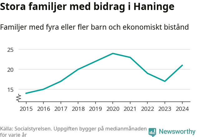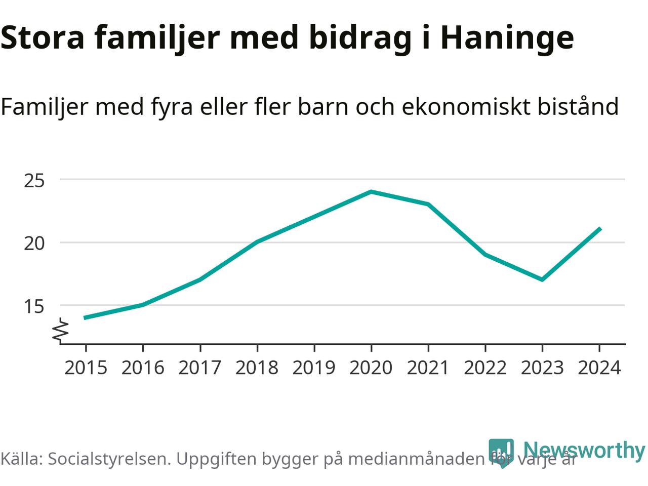 Haninge kommun tillhör varken de kommuner där högst eller lägst andel av befolkningen som fick ekonomiskt bistånd i landet 2024. Sammanlagt 1 420 hushåll fick någon gång under året ekonomiskt bistånd, enligt Socialstyrelsens statistik. Av dem var 294 barnfamiljer. Vi har inte siffror på hur många unika familjer med fyra barn eller fler det handlar om, men enligt Socialstyrelsens preliminära månadsstatistik betalades ekonomiskt bistånd ut till mellan 17 och 23 familjer per månad under fjolåret – i snitt 21 familjer.