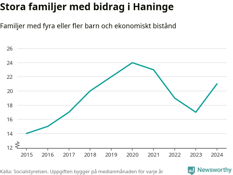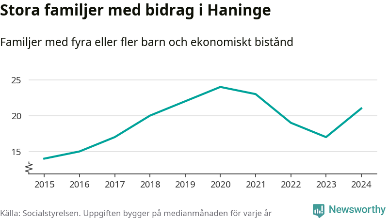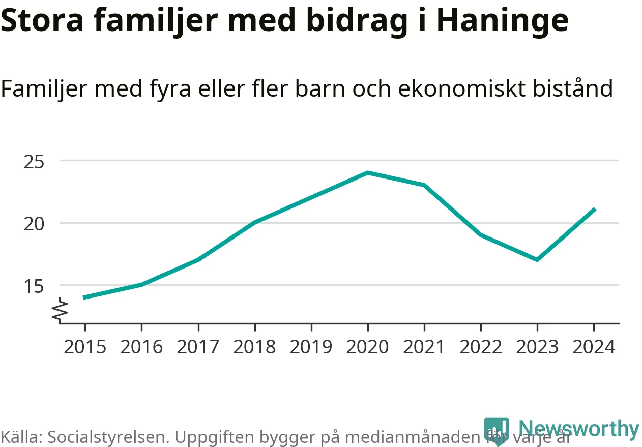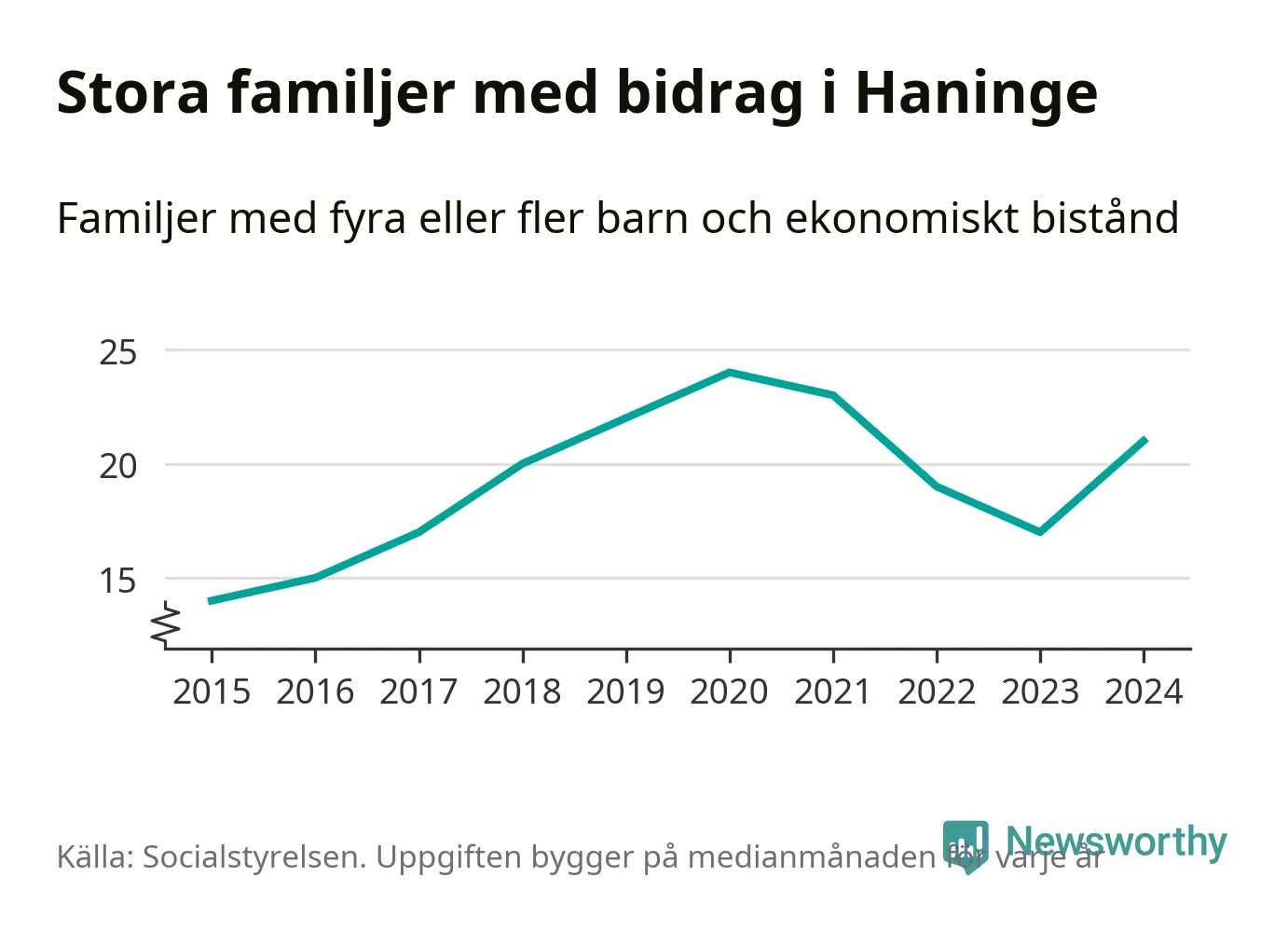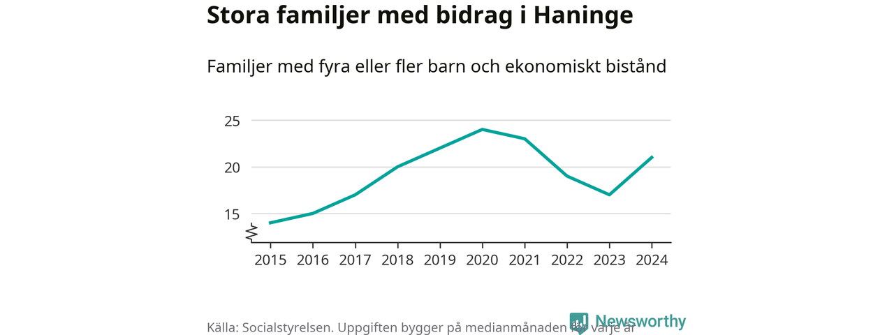 Haninge kommun tillhör varken de kommuner där högst eller lägst andel av befolkningen som fick ekonomiskt bistånd i landet 2024. Sammanlagt 1 420 hushåll fick någon gång under året ekonomiskt bistånd, enligt Socialstyrelsens statistik. Av dem var 294 barnfamiljer. Vi har inte siffror på hur många unika familjer med fyra barn eller fler det handlar om, men enligt Socialstyrelsens preliminära månadsstatistik betalades ekonomiskt bistånd ut till mellan 17 och 23 familjer per månad under fjolåret – i snitt 21 familjer.