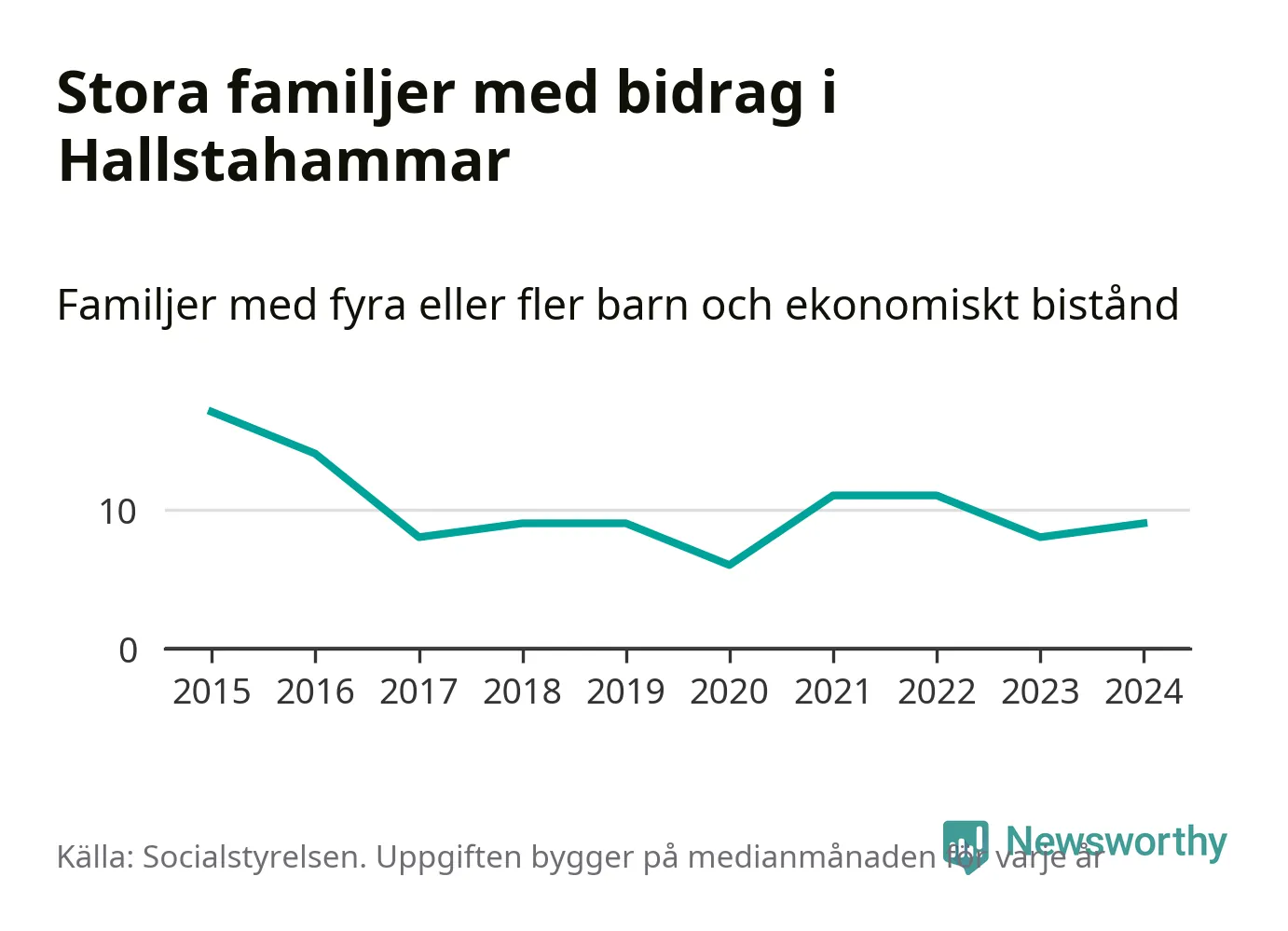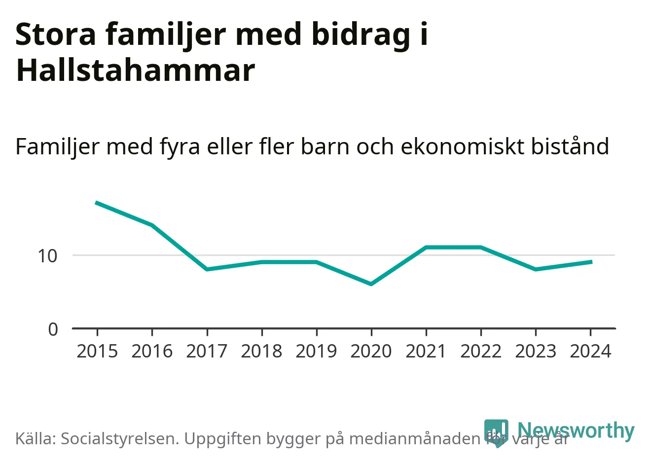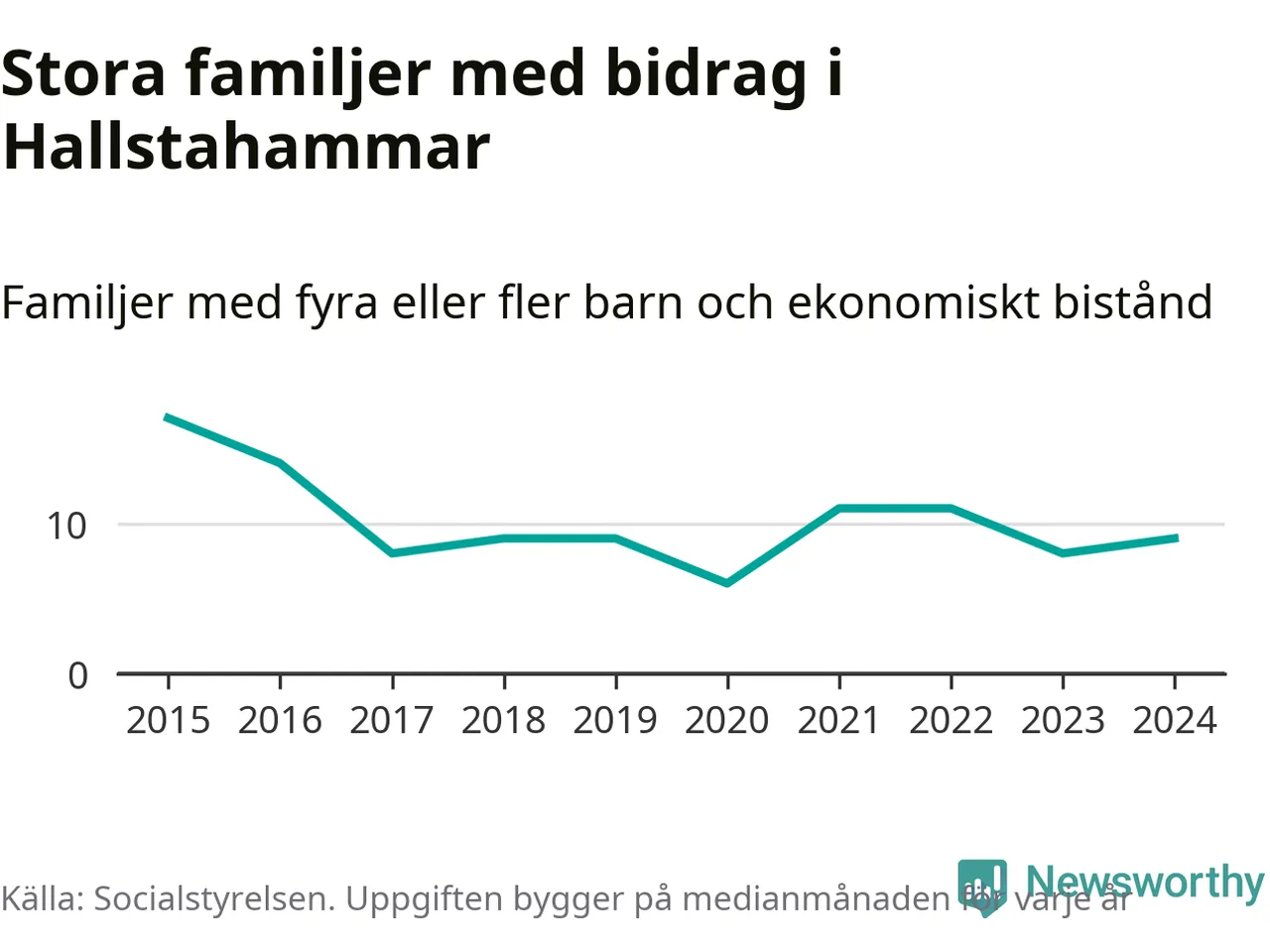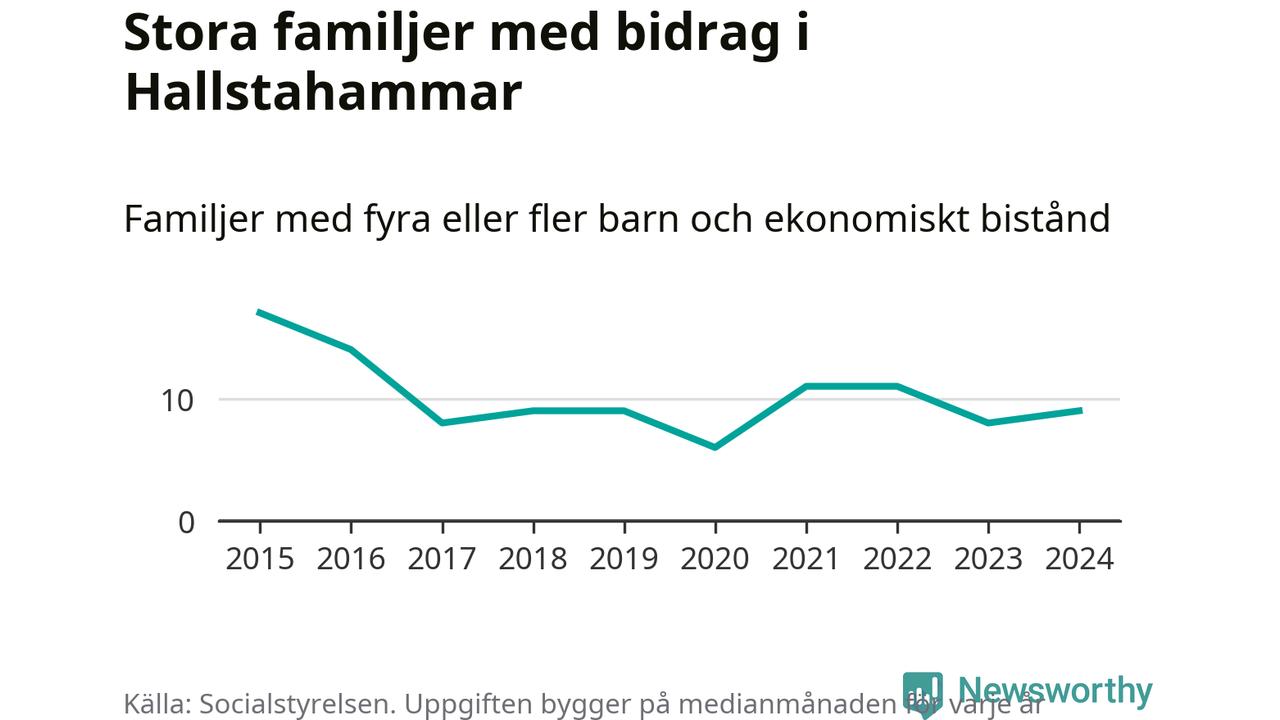 Hallstahammars kommun tillhör varken de kommuner där högst eller lägst andel av befolkningen som fick ekonomiskt bistånd i landet 2024. Sammanlagt 189 hushåll fick någon gång under året ekonomiskt bistånd, enligt Socialstyrelsens statistik. Av dem var några få barnfamiljer. Vi har inte siffror på hur många unika familjer med fyra barn eller fler det handlar om, men enligt Socialstyrelsens preliminära månadsstatistik betalades ekonomiskt bistånd ut till mellan sju och nio familjer per månad under fjolåret – i snitt nio familjer.