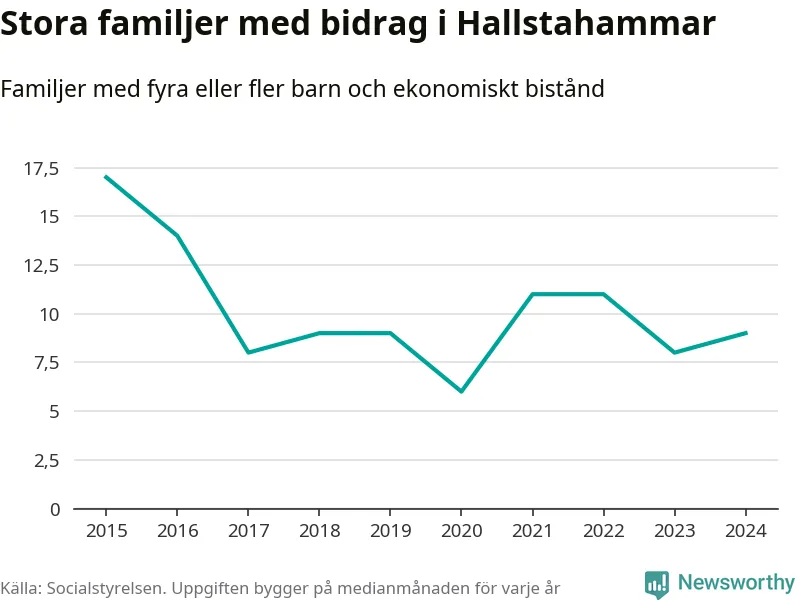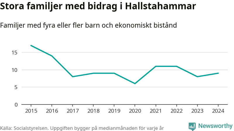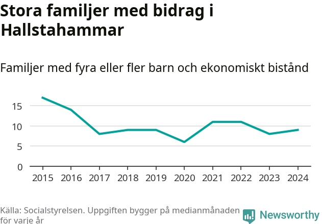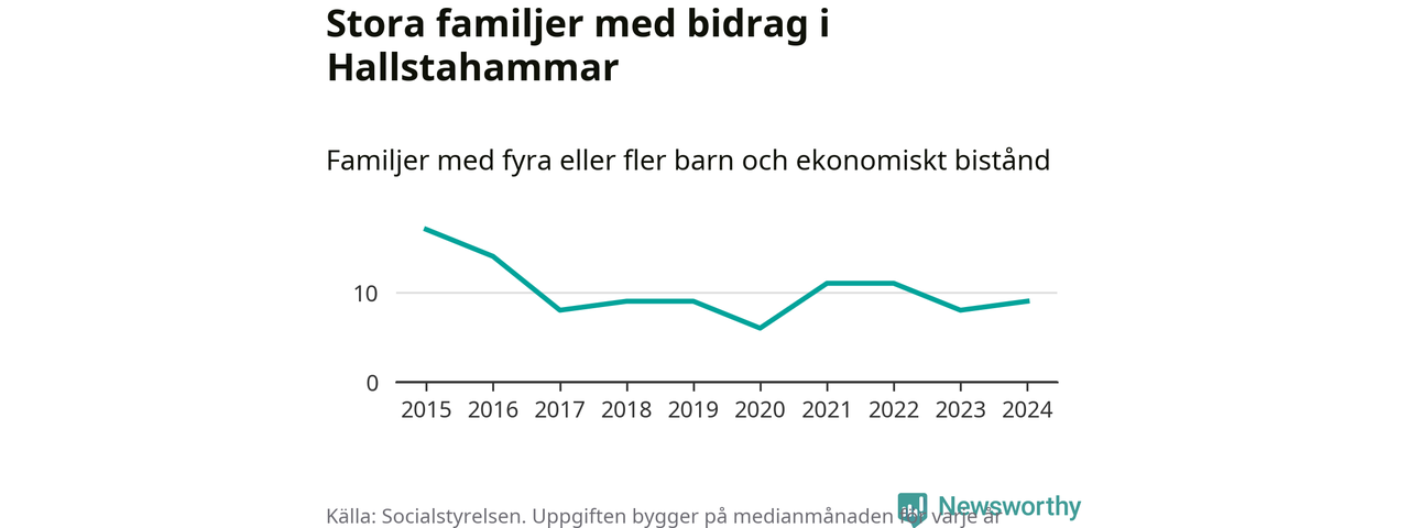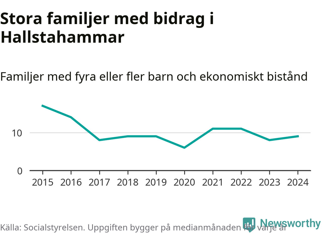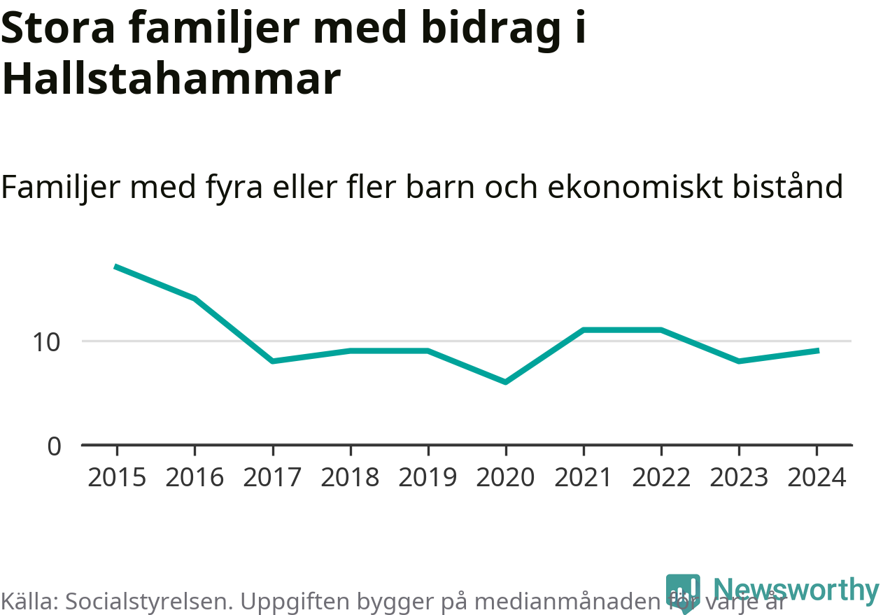 Hallstahammars kommun tillhör varken de kommuner där högst eller lägst andel av befolkningen som fick ekonomiskt bistånd i landet 2024. Sammanlagt 189 hushåll fick någon gång under året ekonomiskt bistånd, enligt Socialstyrelsens statistik. Av dem var några få barnfamiljer. Vi har inte siffror på hur många unika familjer med fyra barn eller fler det handlar om, men enligt Socialstyrelsens preliminära månadsstatistik betalades ekonomiskt bistånd ut till mellan sju och nio familjer per månad under fjolåret – i snitt nio familjer.