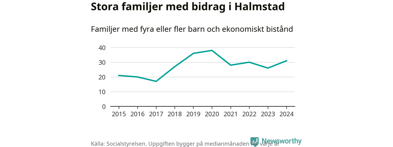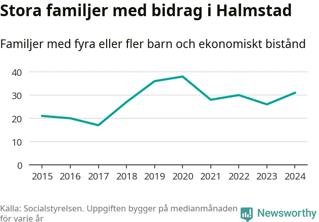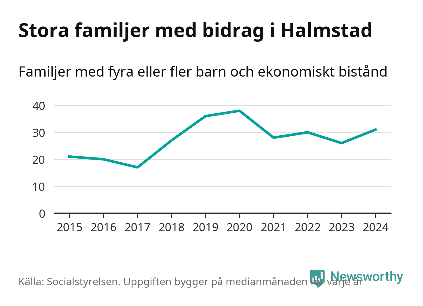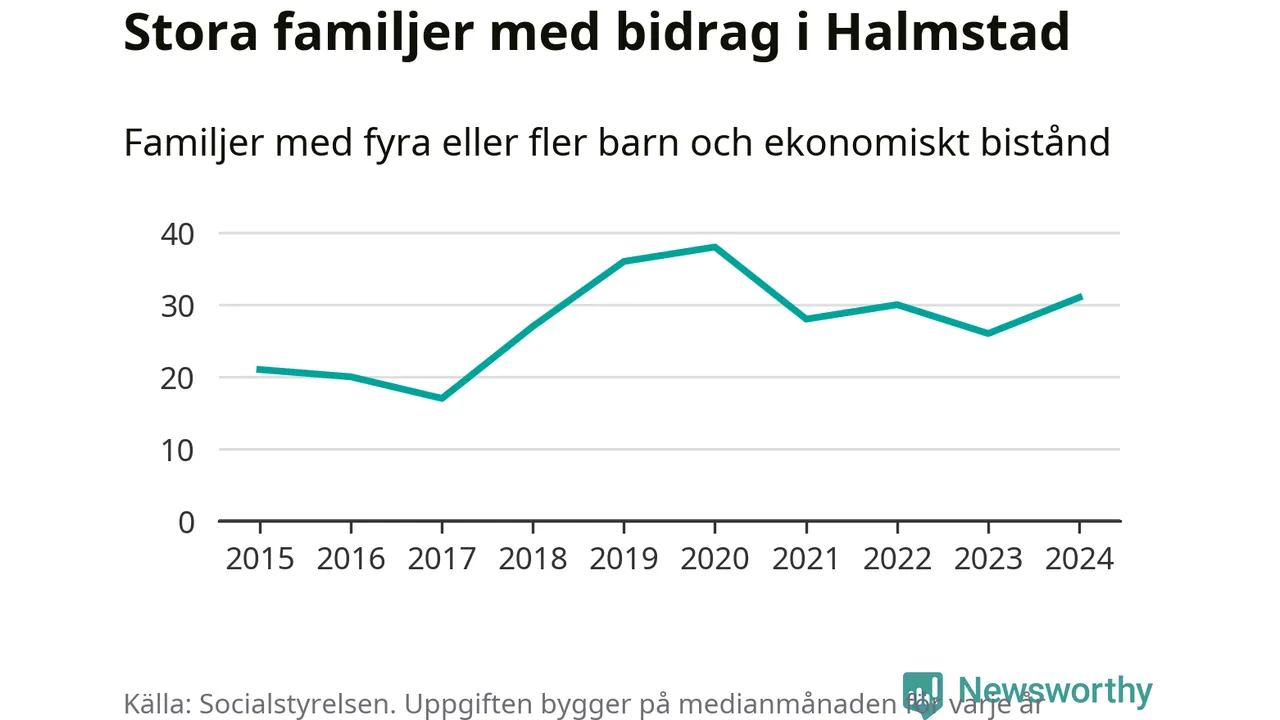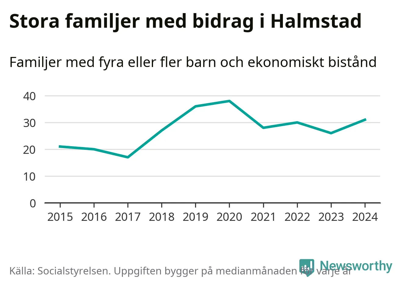 Halmstads kommun tillhör varken de kommuner där högst eller lägst andel av befolkningen som fick ekonomiskt bistånd i landet 2024. Sammanlagt 1 072 hushåll fick någon gång under året ekonomiskt bistånd, enligt Socialstyrelsens statistik. Av dem var 250 barnfamiljer. Vi har inte siffror på hur många unika familjer med fyra barn eller fler det handlar om, men enligt Socialstyrelsens preliminära månadsstatistik betalades ekonomiskt bistånd ut till mellan 26 och 31 familjer per månad under fjolåret – i snitt 31 familjer.
