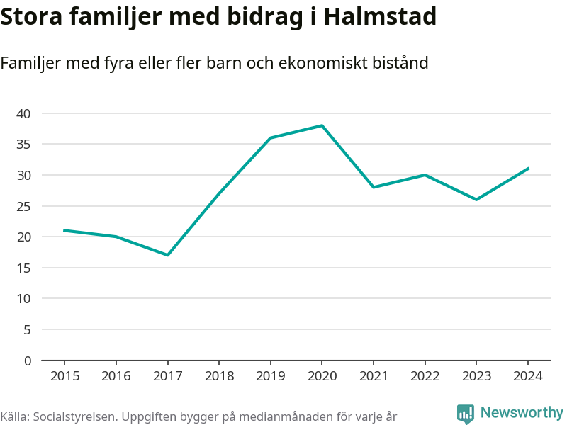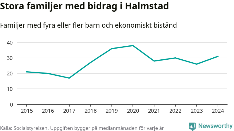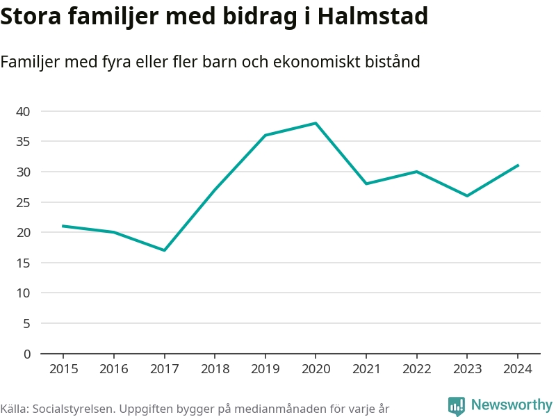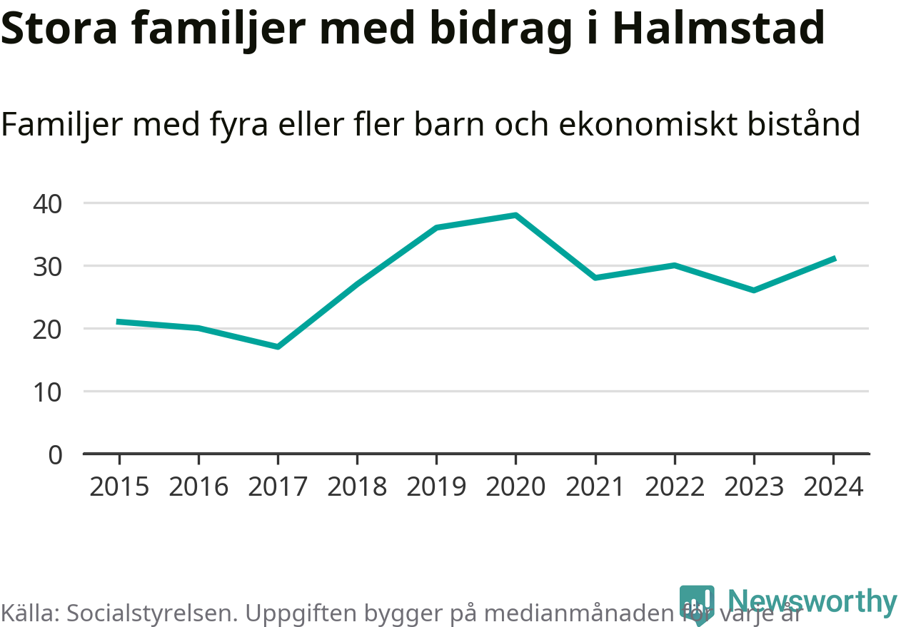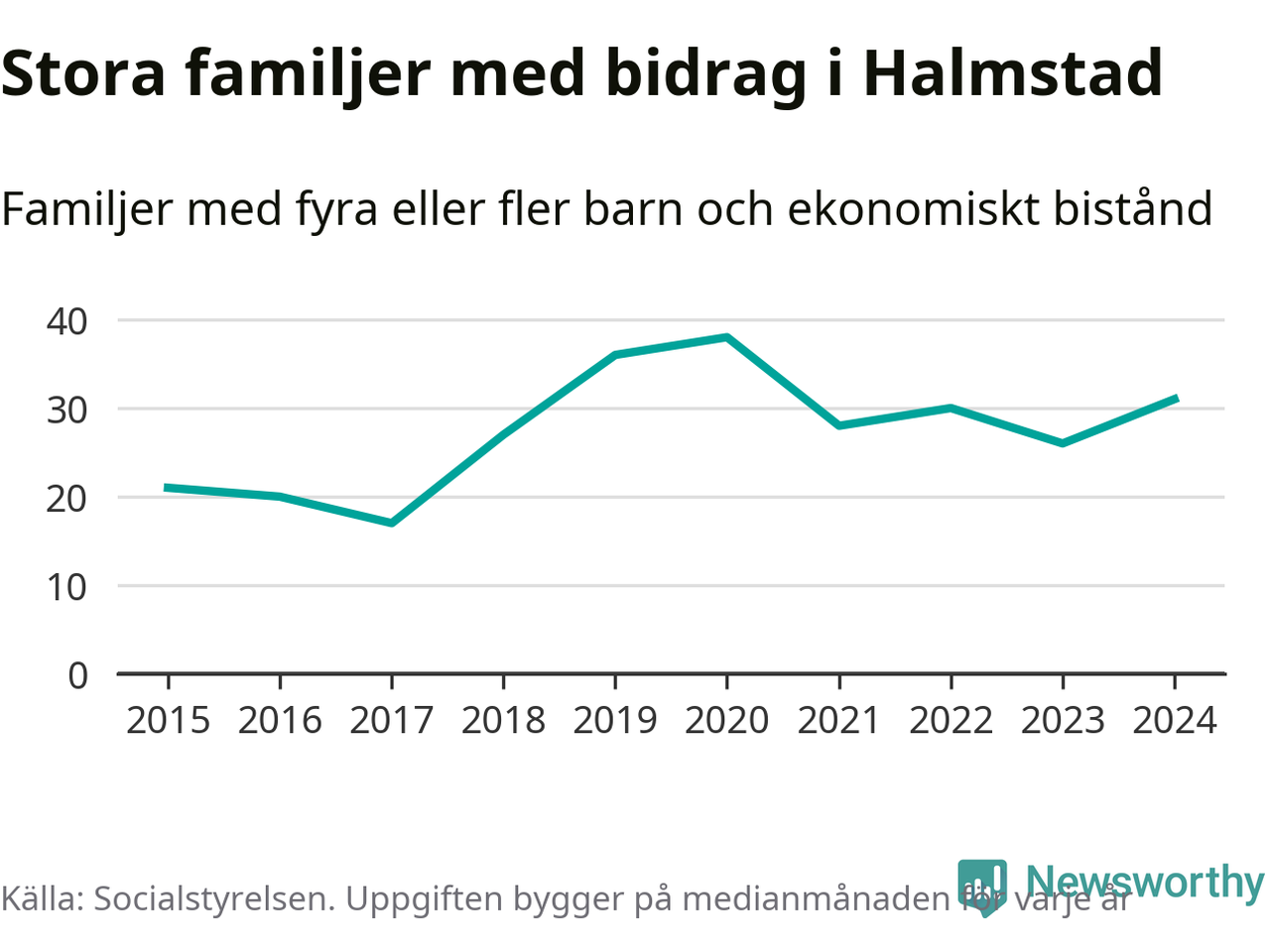 Halmstads kommun tillhör varken de kommuner där högst eller lägst andel av befolkningen som fick ekonomiskt bistånd i landet 2024. Sammanlagt 1 072 hushåll fick någon gång under året ekonomiskt bistånd, enligt Socialstyrelsens statistik. Av dem var 250 barnfamiljer. Vi har inte siffror på hur många unika familjer med fyra barn eller fler det handlar om, men enligt Socialstyrelsens preliminära månadsstatistik betalades ekonomiskt bistånd ut till mellan 26 och 31 familjer per månad under fjolåret – i snitt 31 familjer.