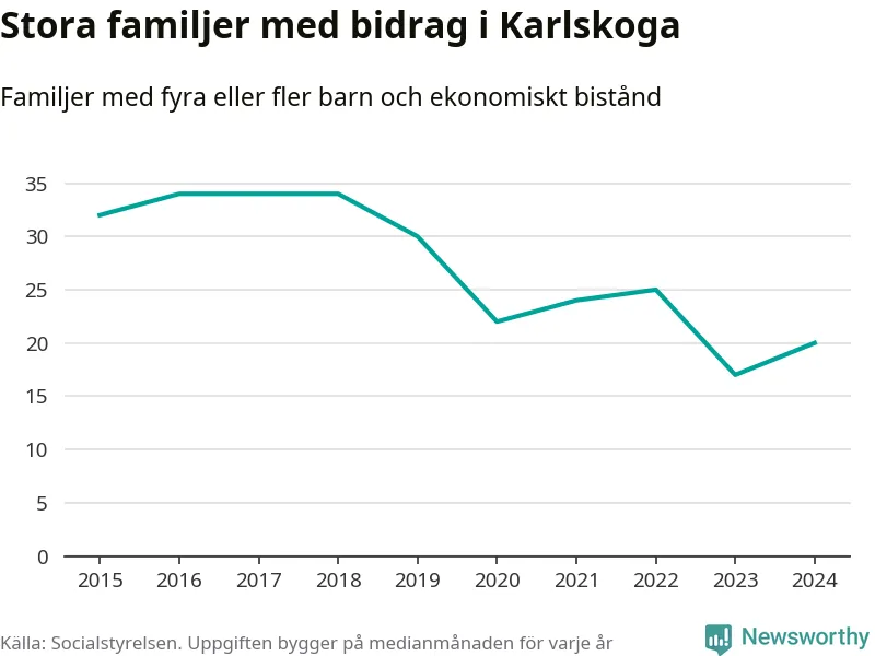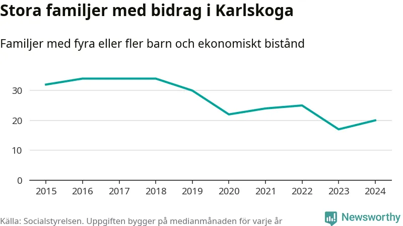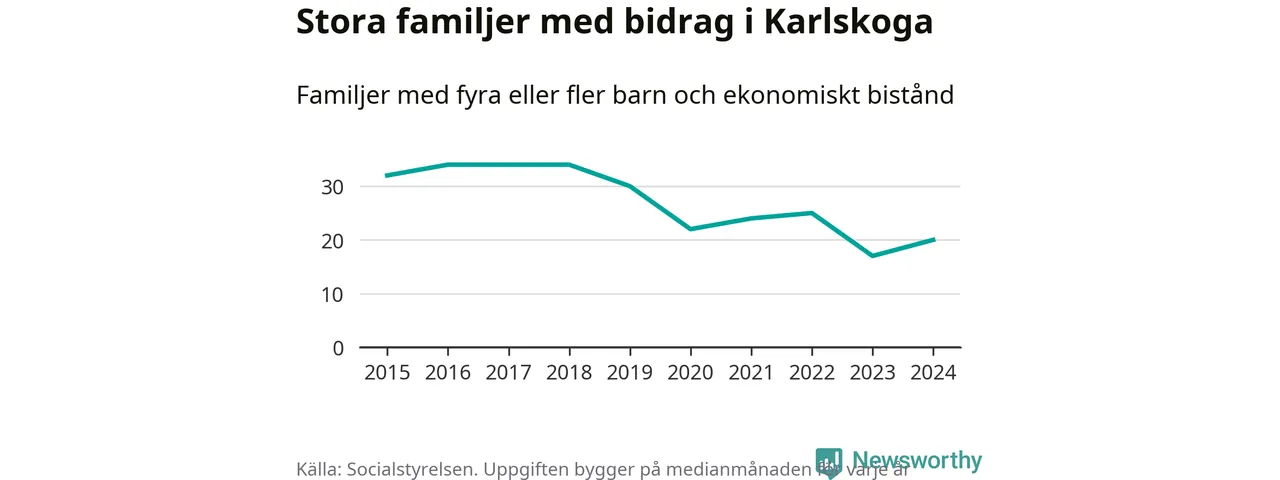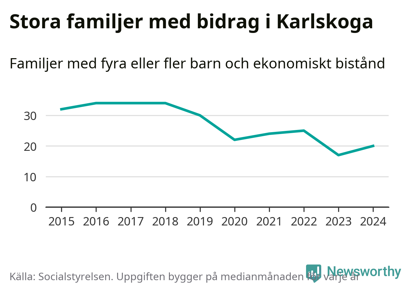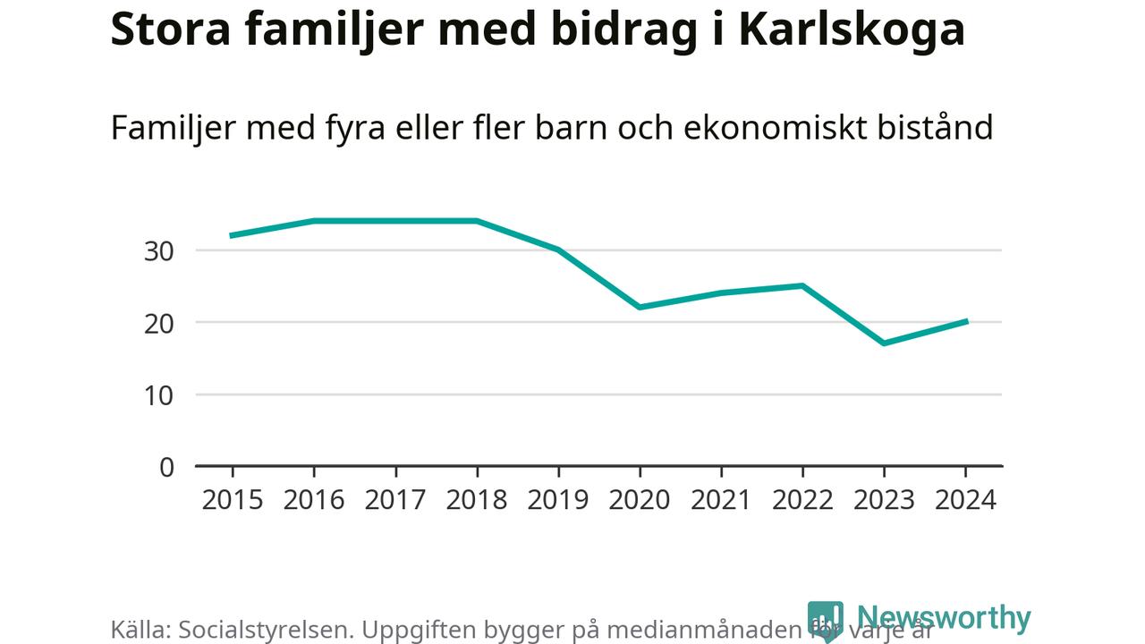 I Karlskoga kommun fick en högre andel av befolkningen ekonomiskt bistånd än de flesta andra kommuner i landet 2024. Sammanlagt 553 hushåll fick någon gång under året ekonomiskt bistånd, enligt Socialstyrelsens statistik. Av dem var 163 barnfamiljer. Vi har inte siffror på hur många unika familjer med fyra barn eller fler det handlar om, men enligt Socialstyrelsens preliminära månadsstatistik betalades ekonomiskt bistånd ut till mellan 16 och 26 familjer per månad under fjolåret – i snitt 21 familjer.
