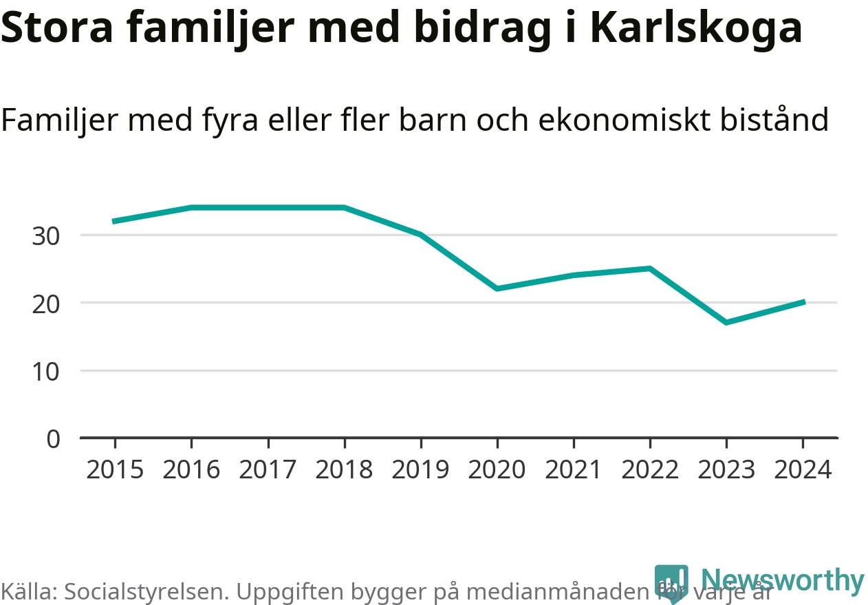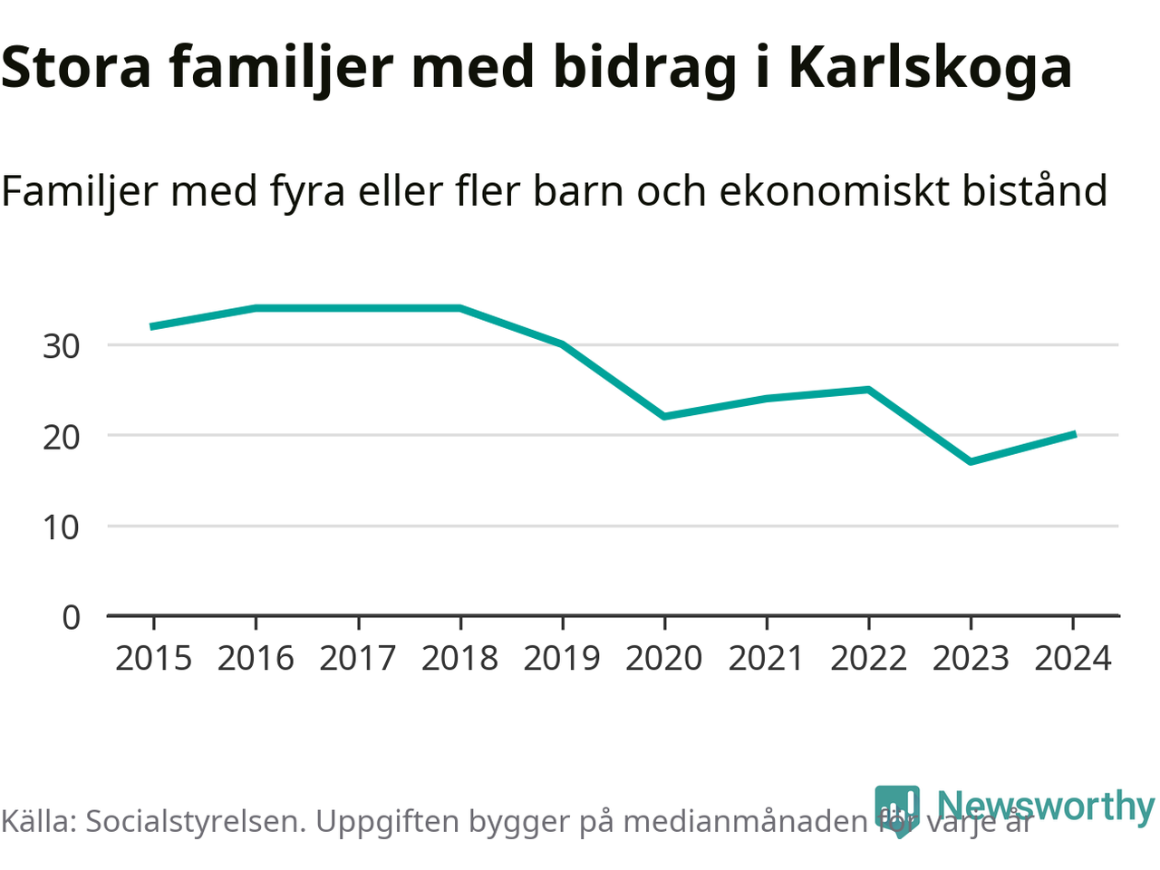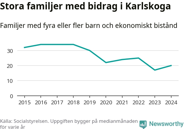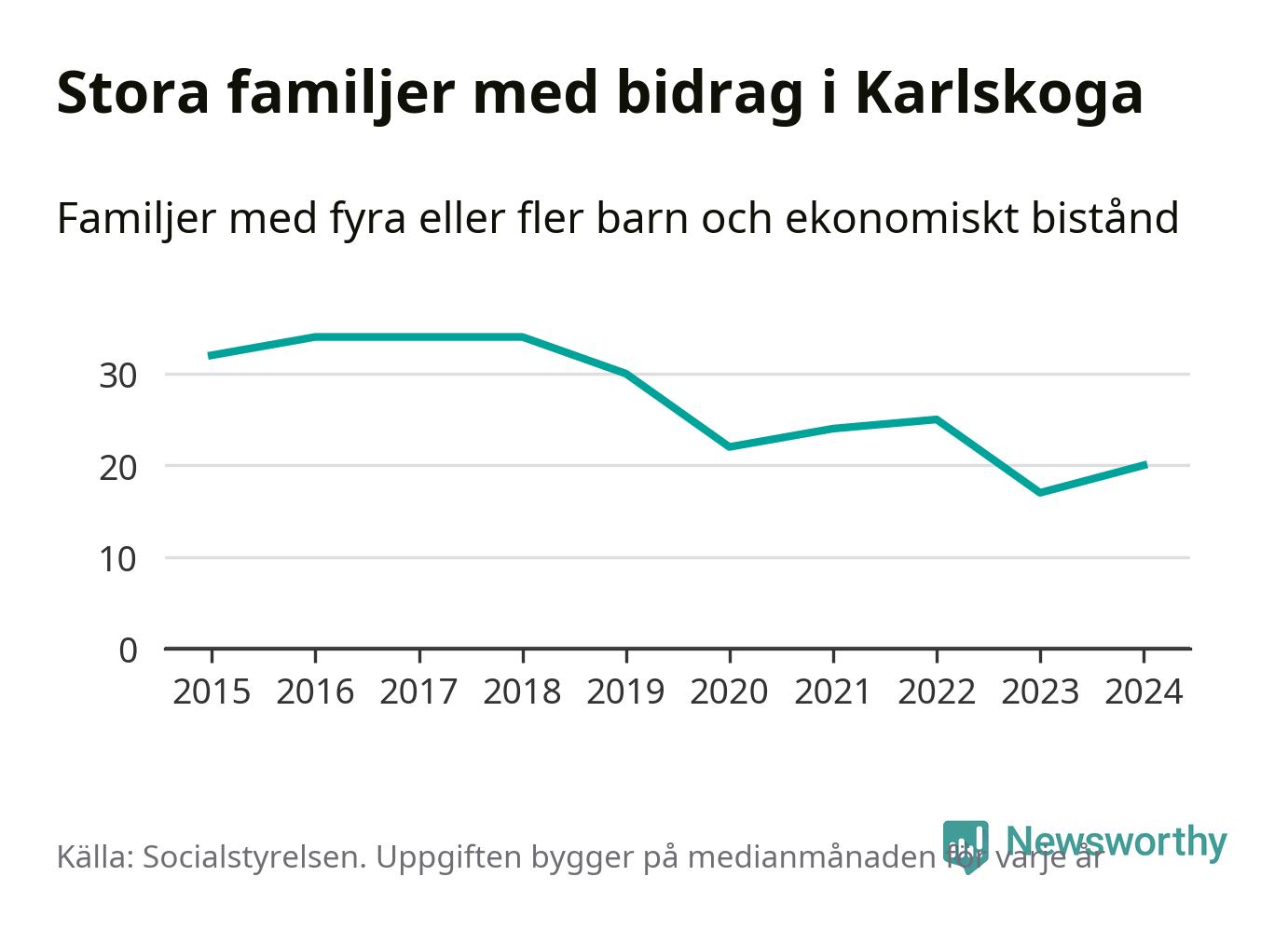 I Karlskoga kommun fick en högre andel av befolkningen ekonomiskt bistånd än de flesta andra kommuner i landet 2024. Sammanlagt 553 hushåll fick någon gång under året ekonomiskt bistånd, enligt Socialstyrelsens statistik. Av dem var 163 barnfamiljer. Vi har inte siffror på hur många unika familjer med fyra barn eller fler det handlar om, men enligt Socialstyrelsens preliminära månadsstatistik betalades ekonomiskt bistånd ut till mellan 16 och 26 familjer per månad under fjolåret – i snitt 21 familjer.