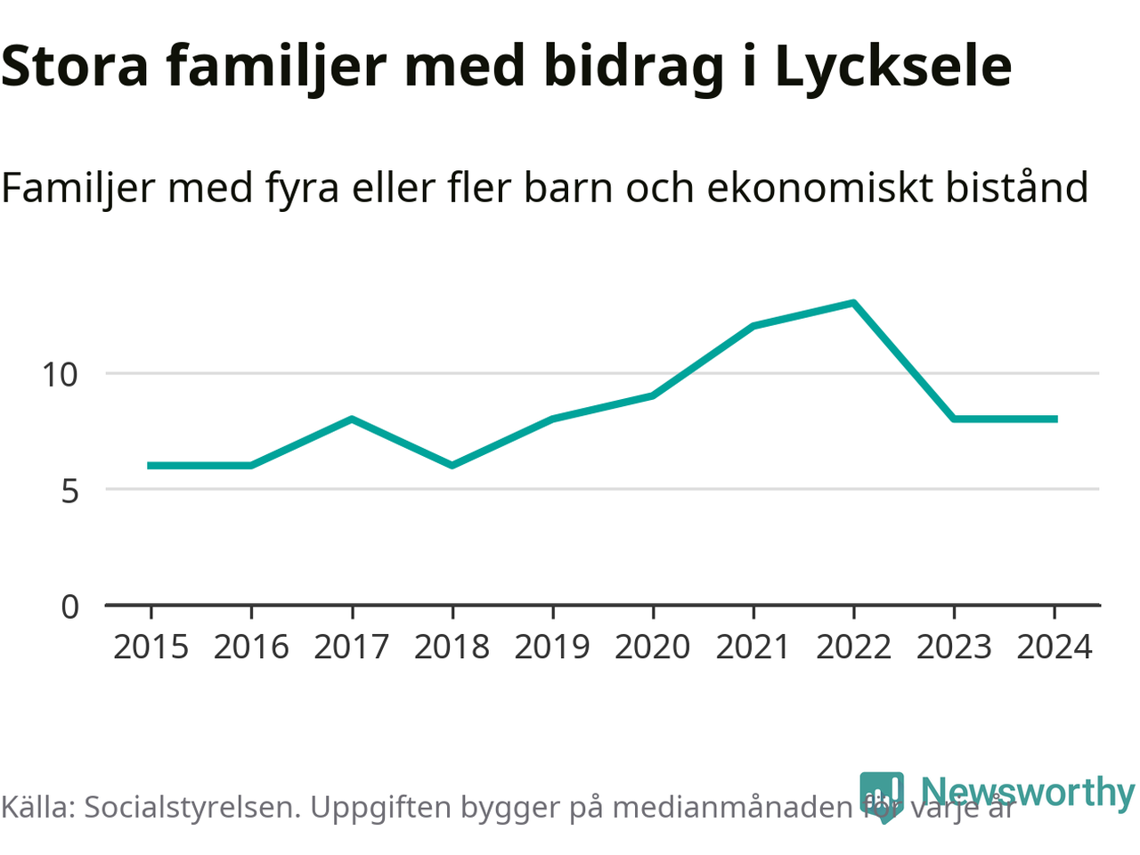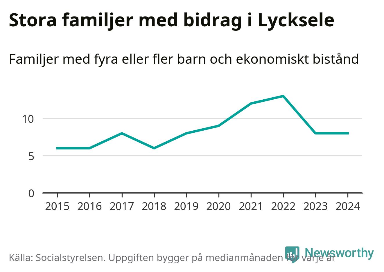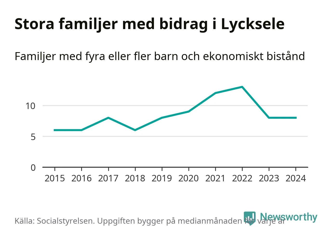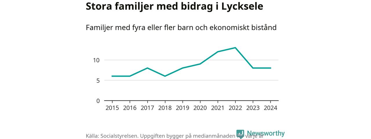 I Lycksele kommun fick en högre andel av befolkningen ekonomiskt bistånd än de flesta andra kommuner i landet 2024. Sammanlagt 223 hushåll fick någon gång under året ekonomiskt bistånd, enligt Socialstyrelsens statistik. Av dem var 48 barnfamiljer. Vi har inte siffror på hur många unika familjer med fyra barn eller fler det handlar om, men enligt Socialstyrelsens preliminära månadsstatistik betalades ekonomiskt bistånd ut till mellan någon eller några enstaka och elva familjer per månad under fjolåret – i snitt nio familjer.