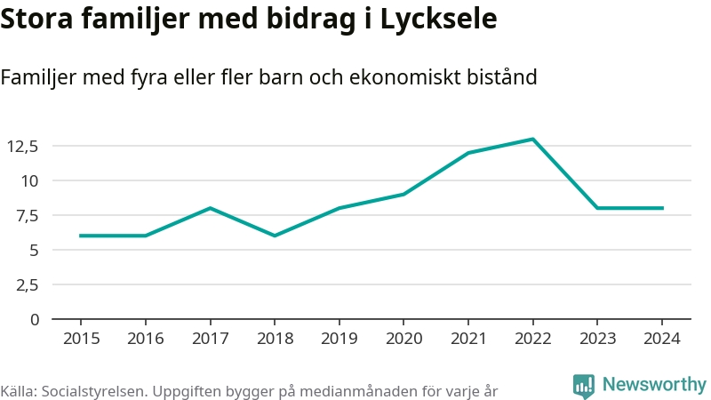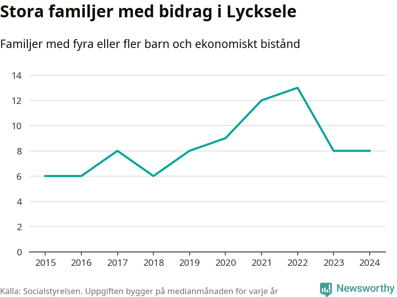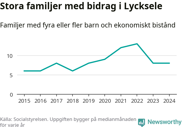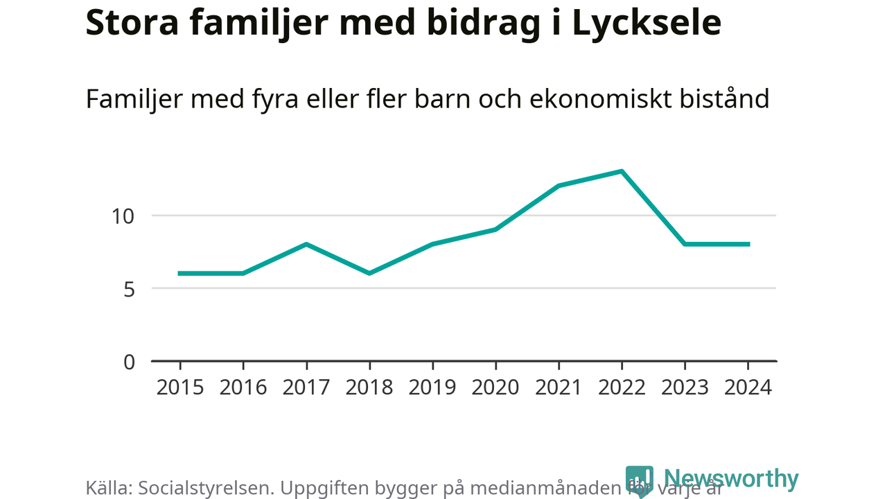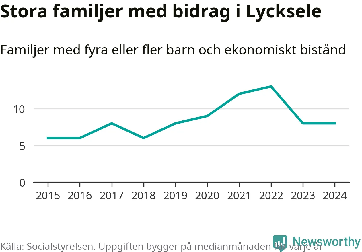 I Lycksele kommun fick en högre andel av befolkningen ekonomiskt bistånd än de flesta andra kommuner i landet 2024. Sammanlagt 223 hushåll fick någon gång under året ekonomiskt bistånd, enligt Socialstyrelsens statistik. Av dem var 48 barnfamiljer. Vi har inte siffror på hur många unika familjer med fyra barn eller fler det handlar om, men enligt Socialstyrelsens preliminära månadsstatistik betalades ekonomiskt bistånd ut till mellan någon eller några enstaka och elva familjer per månad under fjolåret – i snitt nio familjer.