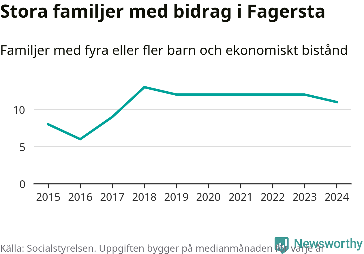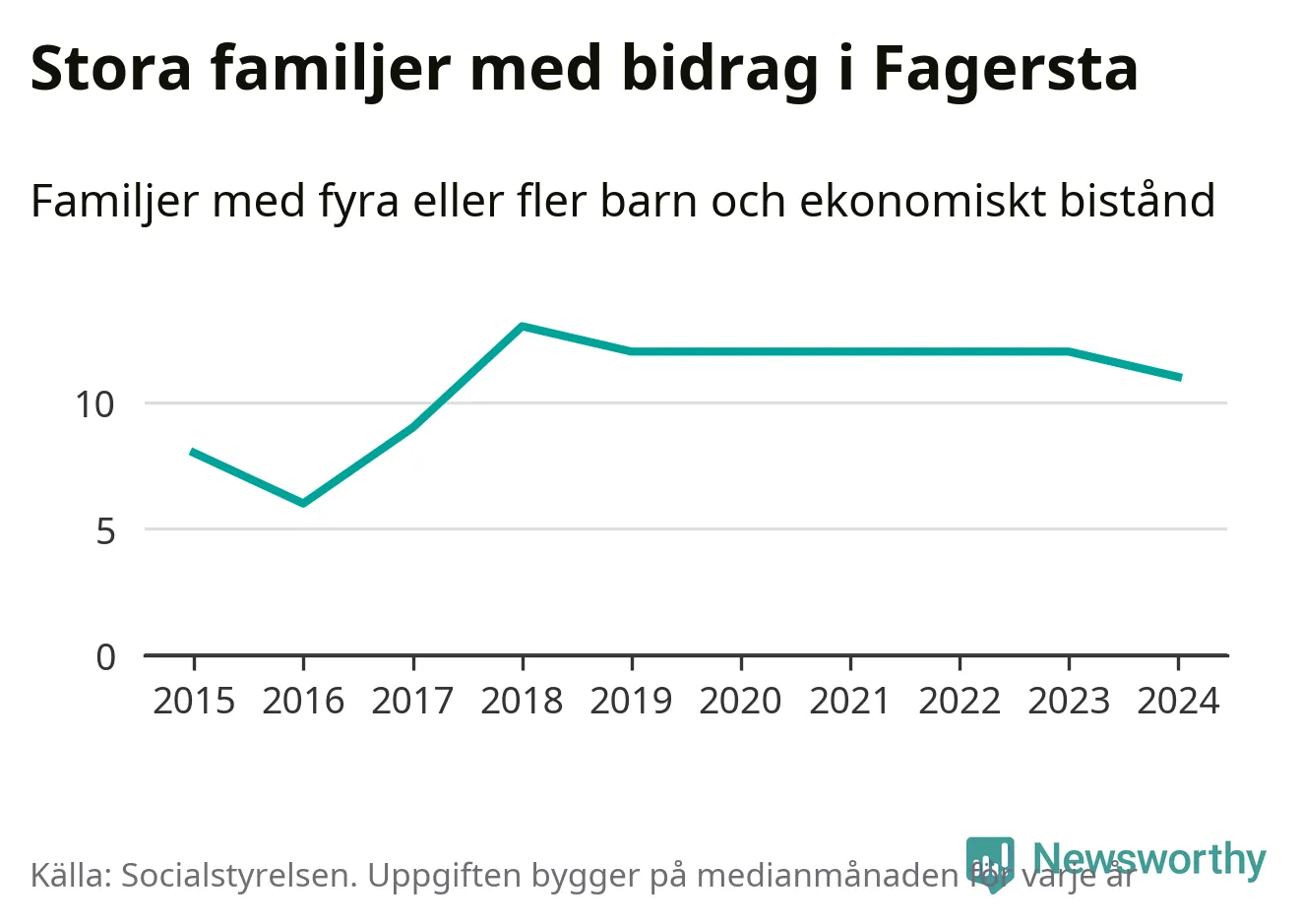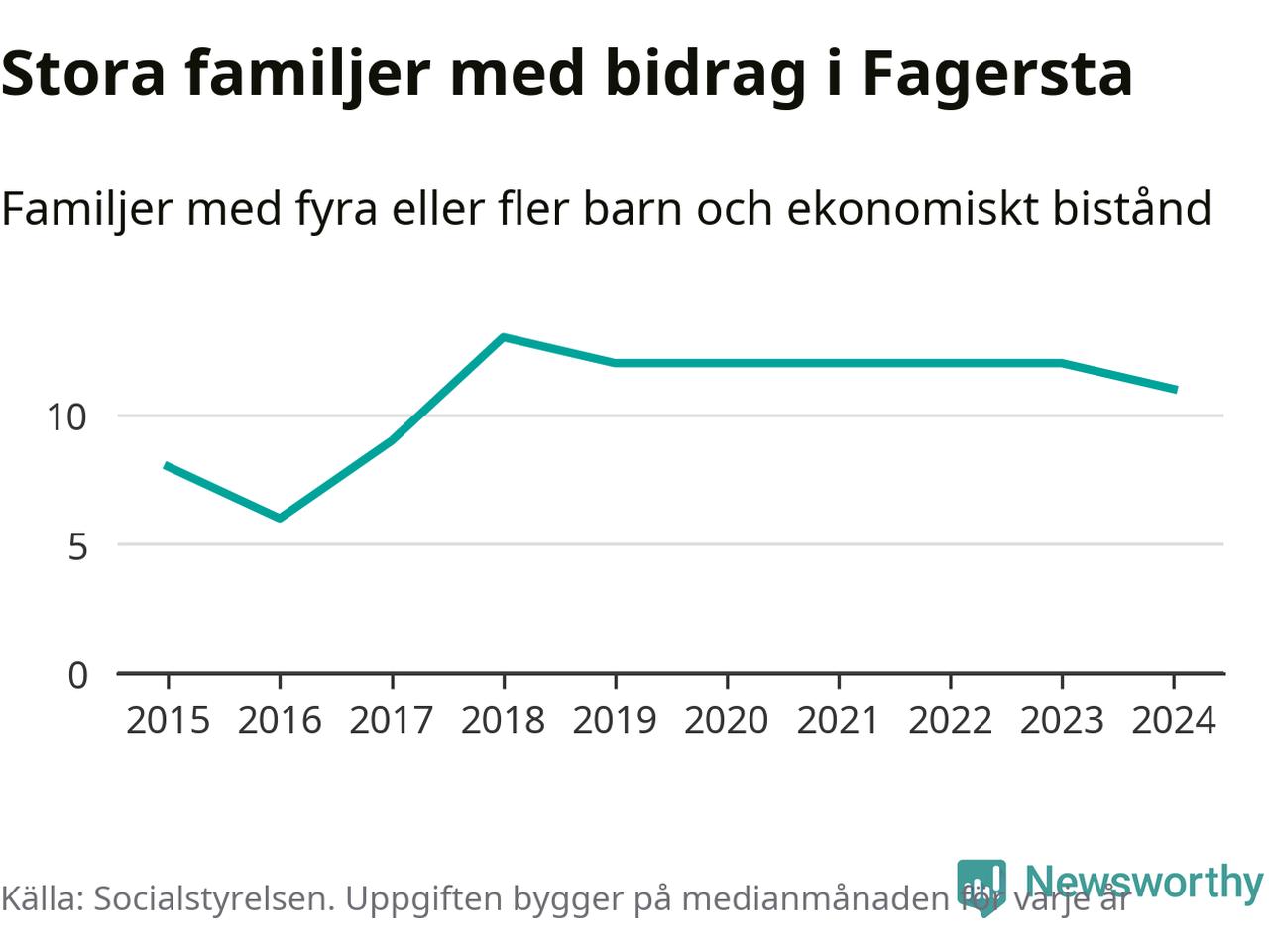 Fagersta kommun tillhör de kommuner i landet som har har högst andel av befolkningen som fick ekonomiskt bistånd 2024. Sammanlagt 325 hushåll fick någon gång under året ekonomiskt bistånd, enligt Socialstyrelsens statistik. Av dem var 112 barnfamiljer. Vi har inte siffror på hur många unika familjer med fyra barn eller fler det handlar om, men enligt Socialstyrelsens preliminära månadsstatistik betalades ekonomiskt bistånd ut till mellan åtta och tolv familjer per månad under fjolåret – i snitt elva familjer.